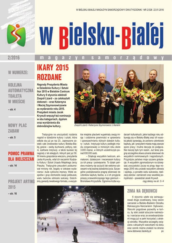 W BIELSKU-BIAŁEJ/ MAGAZYN SAMORZĄDOWY/ DWUTYGODNIK/ NR 2/326 22.01.2016 2/2016 W NUMERZE: KOLEJNA AUTOMATYCZNA TOALETA W MIEŚCIE – str. 4 NOWY PLAC ZABAW – str. 5 POMOC PRAWNA DLA BIELSZCZAN – str. 14 PROJEKT ARTING 2015 – str. 16 IKARY 2015 ROZDANE Nagrody Prezydenta Miasta w Dziedzinie Kultury i Sztuki Ikar 2015 w Bielskim Centrum Kultury 9 stycznia odebrali Zespół Lizard – za całokształt dokonań – oraz Katarzyna i Maciej Szymonowiczowie za wydarzenie roku 2015. Prezydent miasta Jacek Krywult wręczył też nominacje w obu kategoriach, dyplom oraz wyróżnienia dla dobrodziejów kultury. Zespół Lizard i Katarzyna Szymonowicz z Ikarami Tradycyjnie na uroczystość rozdania nagród w dziedzinie kultury i sztuki, która odbyła się już po raz 23., zaproszone zostało całe środowisko kultury Bielska-Białej, goście – osoby duchowne, politycy, radni, szefowie instytucji, a także laureaci tej nagrody z lat ubiegłych, których jest już 50. W imieniu gospodarza wieczoru, prezydenta Jacka Krywulta, witał ich naczelnik Wydziału Kultury i Sztuki Urzędu Miejskiego Jerzy Pieszka. Tradycyjnie prezydent podsumował miniony rok, bogaty w ciekawe wydarzenia i duże cykliczne imprezy. Wiele zespołów i grup obchodziło swoje jubileusze, wielu twórców odniosło sukcesy. Gościliśmy gwiazdy światowego formatu, a wszyst- kie miejskie placówki wypełniały swoją misję i codzienne powinności w uprawianiu i upowszechnianiu różnych dziedzin kultury i sztuki. Instytucje kultury podległe miastu zorganizowały w minionym roku około 3.000 imprez, w których uczestniczyło ponad 630.000 osób. – Dziękuję wszystkim twórcom, animatorom, działaczom i mecenasom kultury za ich pracę i poświęcenie. To dzięki państwu możemy się szczycić tak wieloma sukcesami w tej ważnej dziedzinie życia. Szczególne podziękowania pragnę skierować do członków kapituły Ikarów, a o ich przyjęcie proszę przewodniczącego tego gremium – Bronisława Krzysztofa. Ogromna liczba wy- darzeń kulturalnych, jakie każdego roku odbywają się w Bielsku-Białej oraz ich wysoka jakość sprawiają, że zarówno członkowie kapituły, jak i prezydent miasta mają zawsze sporo pracy i trudne decyzje do podjęcia. Nie inaczej było tym razem. Już teraz pragnę szczególne słowa uznania skierować do wszystkich nominowanych i nagrodzonych. Przyjmijcie państwo moje szczere gratulacje. A wszystkim zgromadzonym na dzisiejszej uroczystości życzę na progu tego nowego 2016 roku przede wszystkim zdrowia i spokoju, a ponadto wielu sukcesów, realizacji planów i zamierzeń oraz wszelkiej pomyślności – powiedział Jacek Krywult. ciąg dalszy na str. 3 i 4 ZIMA NA DĘBOWCU 6 stycznia udało się zainaugurować długo oczekiwany, nowy sezon narciarski w Bielsko-Bialskim Ośrodku Rekreacyjno-Narciarskim Dębowiec. Warunki pogodowe pozwoliły w końcu, by stok został sztucznie naśnieżony i narciarze wraz ze snowboardzistami mogą już w pełni korzystać z atrakcji ośrodka. Wszystkie szczegóły związane z aktualnymi warunkami na stoku oraz cennik można znaleźć na stronie www.debowiec.beskidy.pl ps W BIELSKU-BIAŁEJ/ MAGAZYN SAMORZĄDOWY/ DWUTYGODNIK/ NR 2/326 22.01.2016 KRONIKA DUPA KONSEKRACJA SA£ATA NOWEGO BISKUPA fot. Zwiastun Ewangelicki 6 stycznia w kościele Jezusowym w Cieszynie – w obecności wiernych i duchownych z kraju i zagranicy, gości ekumenicznych, polityków, przedstawicieli władz państwowych i samorządowych, wśród których obecni byli prezydent Bielska-Białej Jacek Krywult i przewodniczący Rady Miejskiej Jarosław Klimaszewski – odbyła się konsekracja ks. dr. Adriana Korczago, którego 21 listopada 2015 r. synod diecezjalny wybrał na zwierzchnika diecezji cieszyńskiej Kościoła ewangelicko-augsburskiego. Aktu konsekracji dokonał zwierzchnik kościoła bp Jerzy Samiec, asystowali mu bp Michael Bünker z Wiednia oraz bp Jan Wacławek z Czech. Biskup Adrian Korczago jest następcą biskupa Pawła Anweilera, który zakończył posługę biskupią po blisko 24 latach służby. W czasie nabożeństwa nowy biskup otrzymał pozdrowienia z różnych środowisk życia religijnego i społecznego. Głos zabrali: rektor Chrześcijańskiej Akademii Teologicznej ks. prof. dr hab. Bogusław Milerski, ordynariusz diecezji bielsko-żywieckiej Kościoła rzymskokatolickiego bp Roman Pindel oraz poseł do Parlamentu Europejskiego prof. Jerzy Buzek. kk POMOC DLA RODAKÓW Jak co roku przed świętami Bożego Narodzenia z Bielska-Białej wyruszył transport paczek do polskich rodzin na Ukrainie. Organizatorem wyjazdu był radny Rady Miejskiej Bielska-Białej Szczepan Wojtasik, w akcję przygotowania paczek włączyły się bielskie szkoły – Gimnazjum nr 6 im. Orląt Lwowskich i Gimnazjum nr 3 im. Henryka Sienkiewicza oraz Parafialny Oddział Akcji Katolickiej w Kozach. W transporcie przekazano paczki o łącznej wadze ok 600 kg, w paczkach znalazły się m.in. przekazane darmowo słodycze przez firmy Cosmo i Spomet. Świąteczne dary przekazano rodzinom w parafiach Żydaczów, Brzozdowce oraz Lwów na Zachodzie Ukrainy. opr. JacK DZIELNA PANI STANISŁAWA Stanisława Dłubakowska-Plutecka, która dwa lata temu na swoje 100. urodziny przybyła osobiście do Urzędu Stanu Cywilnego, 7 stycznia tego roku ukończyła 102 lata. Gratulacje i życzenia złożyli jej przewodniczący Rady Miejskiej Jarosław Klimaszewski i dyrektor Biura RM Danuta Brejdak. Jubilatka nadal pozostaje w wyjątkowej kondycji. Mieszka sama w domu w Straconce, w którym ciągle coś ulepsza. W zeszłym roku zleciła wybudowanie tarasu, w tym będzie zmieniać płot. Towarzyszy jej tylko piesek przygarnięty ze schroniska. Wspierają ją dalsi krewni mieszkający w Bielsku-Białej i sąsiedzi. Podczas wizyty gości z bielskiego Ratusza, jak zwykle, miała wiele do opowiadania i żałowała, że wizyta była zbyt krótka. Świetnie orientuje się w tym, co słychać w polityce i na świecie, bo 