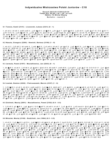 Indywidualne Mistrzostwa Polski Juniorów - C18 S zczyrk 2013-03-17/2013- 03- 24 Tempo gry: 90'/40 + 30' + 30'' na ruch Sędzia: FA Michał Wejsig Bulletin - round 9 9.1 Tomsia, Kamil (2141) - Licznerski, Łukasz (2331) (0 - 1) 1. e4 c6 2. d4 d5 3. exd5 cxd5 4. L d3 n c6 5. c3 n f6 6. L f4 l g4 7. Q b3 W c8 8. N d2 e6 9. N gf3 l e7 10. O-O l h5 11. R fe1 O- O 12. N e5 n xe5 13. L xe5 l g6 14. Q c2 b5 15. L xg6 hxg6 16. Q d3 W c6 17. a3 a5 18. b4 T fc8 19. R ac1 axb4 20. axb4 T a3 21. N b1 T a2 22. L xf6 gxf6 23. R cd1 T ca8 24. g3 T b2 25. R e2 T aa2 26. R ed2 l f8 27. Q e2 T xd2 28. R xd2 T a1 29. R d1 W a6 30. f4 W a4 31. R c1 W b3 32. Q e1 W b2 33. R d1 W c2 34. h4 l h6 35. K f1 W h2 36. Q f2 W h1+ 37. Q g1 W f3+ 38. K e1 W xd1+ 0 - 1 9.2 Nasuta, Grzegorz (2295) - Nowicki, Bartosz (2156) (1 - 0) 1. e4 c5 2. N f3 d6 3. d4 cxd4 4. N xd4 n f6 5. N c3 a6 6. h3 e6 7. g4 l e7 8. L g2 n fd7 9. L e3 n c6 10. N de2 n de5 11. b3 g5 12. Q d2 b5 13. N g3 l b7 14. O-O T c8 15. N ce2 n g6 16. f4 gxf4 17. N xf4 n ce5 18. R ad1 W c7 19. R f2 W c3 20. Q e2 n xf4 21. L xf4 l h4 22. N h5 l xf2+ 23. Q xf2 W xc2 24. R d2 W b1+ 25. K h2 n d3 26. Q d4 n xf4 27. Q xh8+ k d7 28. Q d4 n xh5 29. Q xd6+ k e8 30. Q d7+ k f8 31. Q xb7 W c1 32. gxh5 W xd2 33. Q xc8+ k g7 34. Q c7 W xa2 35. Q e5+ k f8 36. Q h8+ k e7 37. Q xh7 W b2 38. Q g8 W e5+ 39. Q g3 W xh5 40. Q c7+ k f6 41. Q f4+ k e7 42. b4 e5 43. Q f5 W h8 44. L f3 f6 45. L g4 W h6 46. Q f2 k f7 47. Q a7+ k f8 48. Q b8+ k g7 49. Q c7+ k h8 50. Q d8+ k g7 51. Q d7+ k f8 52. Q d6+ k g7 53. Q d7+ k f8 54. K g2 W g5 55. Q f5 W d2+ 56. Q f2 W g5 57. K g3 k g7 58. K h2 W c1 59. L f5 W c4 60. Q a7+ k g8 61. Q b8+ k f7 62. Q b7+ k f8 63. Q c8+ k e7 64. Q xc4 bxc4 65. L g4 c3 66. L d1 k e6 67. L c2 1 - 0 9.3 Jarmuła, Paweł (2197) - Musiałkiewicz, Jan (2243) (0 - 1) 1. d4 n f6 2. c4 e6 3. N f3 b6 4. g3 l a6 5. Q b3 c5 6. d5 exd5 7. cxd5 d6 8. N c3 g6 9. L g2 l g7 10. O-O O-O 11. R e1 T e8 12. N d2 n bd7 13. a4 n e5 14. N b5 l xb5 15. axb5 W c8 16. R a4 n fd7 17. Q c2 a6 18. N e4 W c7 19. N c3 c4 20. R d1 n c5 21. R a3 axb5 22. N xb5 W d7 23. R xa8 T xa8 24. N d4 T a1 25. L f4 T xd1+ 26. Q xd1 b5 27. Q d2 n b3 28. N xb3 cxb3 29. Q e3 n c4 30. Q xb3 l xb2 31. L e4 l e5 32. L xe5 n xe5 33. K g2 W b7 34. Q b4 n c4 35. L f3 W a6 36. L e4 W a4 37. Q c3 n e5 38. L c2 W a2 39. Q b3 W a5 40. e4 n d7 41. h4 h5 42. Q b2 n e5 43. Q d4 W a3 44. L d1 W a2 45. Q b6 n c4 46. Q d8+ k g7 47. L xh5 W d2 48. L g4 n e3+ 49. K f3 n d1 50. Q b6 b4 51. K g2 b3 52. L xd1 W xd1 53. Q xd6 W d4 54. e5 b2 55. Q f6+ k g8 56. Q d8+ k h7 57. Q d7 W e4+ 58. K h2 W f5 0 - 1 9.4 Lewtak, Damian (2224) - Pietruszewski, Marcin ( 2107) (1 - 0) 1. N f3 n f6 2. c4 c6 3. d4 d5 4. cxd5 cxd5 5. N c3 n c6 6. Q b3 e6 7. L f4 l d6 8. L xd6 W xd6 9. e3 O- O 10. L d3 l d7 11. O- O T fc8 12. R ac1 n a5 13. Q d1 n c4 14. Q e2 W b6 15. b3 n d6 16. N e5 l e8 17. R c2 T c7 18. R fc1 T ac8 19. N b1 k f8 20. R xc7 T xc7 21. R xc7 W xc7 22. Q c2 W xc2 23. L xc2 n d7 24. f4 h6 25. N c3 f6 26. N xd7+ l xd7 27. K f2 l b5 28. f5 k e7 29. fxe6 k xe6 30. a4 l c6 31. b4 b6 32. L b3 f5 33. K g3 g5 34. K f3 n e4 35. N xe4 fxe4+ 36. K g4 k f6 37. b5 l b7 38. K h5 k g7 39. L d1 l c8 40. h4 gxh4 41. K xh4 l e6 42. L g4 l f7 43. L h5 l e6 44. L e8 k f8 45. L g6 k g7 46. K h5 l d7 47. g3 l h3 48. L e8 l f1 49. g4 l e2 50. L c6 l d1 51. L xd5 l xa4 52. L c4 l d1 53. d5 k f6 54. d6 l f3 55. d7 k e7 56. L e6 l e2 57. K xh6 l xb5 58. g5 l e2 59. g6 b5 60. g7 1 - 0 9.5 Zieliński, Maciej (2091) - Musiałkiewicz, Paweł (2182) (0.5 - 0.5) 1. N f3 d5 2. g3 n f6 3. L g2 l g4 4. O-O n bd7 5. d4 e6 6. c4 c6 7. N c3 l xf3 8. L xf3 dxc4 9. Q c2 l d6 10. R d1 W c7 11. N e4 n xe4 12. L xe4 n f6 13. L g2 e5 14. Q xc4 O- O 15. L g5 W e7 16. Q b3 T ab8 17. Q f3 exd4 18. L xf6 W xf6 19. Q xf6 gxf6 20. R xd4 T fd8 21. R ad1 l e7 22. R d7 k f8 23. L e4 h6 24. R 1d3 k e8 25. R xd8+ T xd8 26. R b3 T d7 27. K g2 a5 28. L f5 T d5 29. L e4 T d7 30. R d3 T xd3 31. L xd3 a4 32. f4 a3 33. bxa3 l xa3 34. K f3 l f8 35. K e4 l e7 36. K f5 l d8 37. a4 l e7 38. L c4 l d8 39. e4 k f8 40. L e2 k e7 41. h4 l a5 42. g4 l d2 43. L c4 l c1 44. L d3 l d2 0.5 - 0.5 9.6 Mroziak, Maciej (2149) - Budziński, Jan (1984) (0.5 - 0.5) 1. c4 e5 2. N c3 n c6 3. g3 f5 4. L g2 n f6 5. d3 l b4 6. e3 l xc3+ 7. bxc3 O-O 8. N e2 T e8 9. O-O d6 10. R b1 e4 11. d4 b6 12. L a3 l a6 13. c5 dxc5 14. R e1 cxd4 15. cxd4 n a5 16. R c1 k h8 17. N f4 l b7 18. h4 n d5 19. Q h5 n xf4 20. gxf4 T c8 21. Q xf5 W xh4 22. d5 c5 23. dxc6 T xc6 24. R xc6 l xc6 25. R c1 W f6 26. Q xf6 gxf6 27. L b4 l d5 28. R c7 l xa2 29. L c3 T e6 30. R xa7 k g8 31. f5 T c6 32. L d4 l b1 33. L xb6 T xb6 34. R xa5 l d3 35. K h2 T b7 36. R a8+ k g7 37. R a4 T b5 38. L h3 T b1 39. L g2 T b5 40. L h3 T b1 41. R d4 k h6 42. R d7 l e2 43. L g2 l f3 44. L xf3 exf3 45. K g3 k g5 46. e4 T b4 47. R g7+ k h6 48. R g4 k h5 49. K xf3 T b3+ 50. K f4 T b2 51. f3 k h6 52. R g1 T b4 53. R g8 T a4 54. R d8 k g7 55. R d7+ k g8 56. R e7 T a1 57. R c7 T b1 58. K e3 T b3+ 59. K e2 T b2+ 60. K d3 T f2 61. K e3 T f1 62. R c3 T e1+ 63. K d4 T d1+ 64. R d3 T a1 65. f4 T f1 66. K d5 T xf4 67. R a3 h5 68. K e6 T xe4+ 69. K xf6 h4 70. R a8+ k h7 71. K f7 T b4 72. f6 T b7+ 73. K e6 T b6+ 74. K f5 T b5+ 75. K g4 k g6 76. R a6 T b4+ 77. K h3 T f4 78. f7+ 0.5 - 0.5 9.7 Poświat owski, Michał (2076) - Malec, Sebastian ( 2171) (0 - 1) 1. e4 c5 2. N f3 e6 3. c4 n c6 4. N c3 n d4 5. g3 n e7 6. L g2 n ec6 7. O-O l e7 8. b3 h5 9. L b2 h4 10. a3 d6 11. b4 l f6 12. b5 n e5 13. N xd4 cxd4 14. N e2 d3 15. N c1 n xc4 16. L xf6 W xf6 17. N xd3 hxg3 18. hxg3 W h6 19. f4 W f6 20. e5 W g6 21. R f3 W e4 22. N f2 W d4 23. R c1 d5 24. Q a4 l d7 25. Q b4 W b6 26. R b3 f5 27. L f1 k f7 28. L g2 g5 29. fxg5 T ag8 30. d3 n xe5 31. Q c3 n g4 32. d4 T c8 33. N xg4 T xc3 34. N e5+ k g7 35. R cxc3 W xd4+ 36. R e3 l xb5 37. R bc3 T c8 38. N f3 W xc3 39. R xc3 T xc3 40. N d4 l d7 0 - 1 9.8 Stankiewicz, Paweł (2108) - Cukrowski, Filip (2163) ( 0.5 - 0.5) 1. e4 c5 2. N f3 d6 3. d4 cxd4