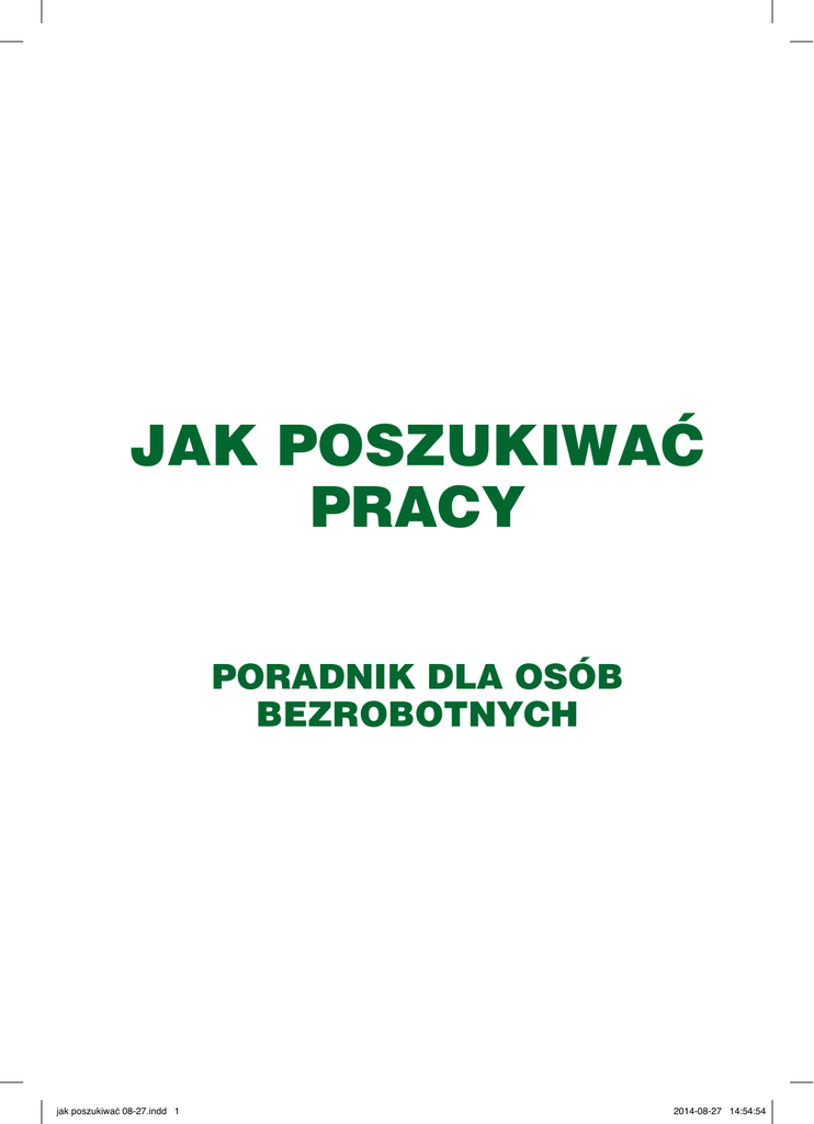 JAK POSZUKIWAĆ PRACY PORADNIK DLA OSÓB BEZROBOTNYCH jak poszukiwać 08-27.indd 1 2014-08-27 14:54:54 Opracowanie: Dorota Bujnowska Redakcja: Kinga Kaja Brajczewska Sylwia Stokowska Skład, druk i oprawa: Białystok, ul. Zwycięstwa 10 tel. 85 653-78-04 e-mail: biuro@partnerpoligrafia.pl Wojewódzki Urząd Pracy w Białymstoku ul. Pogodna 22 15 – 354 Białystok Białystok 2014 jak poszukiwać 08-27.indd 2 2014-08-27 14:54:54 Spis treści WSTĘP..................................................................................................................................................... 4 I. PRZYGOTOWANIE DO POSZUKIWANIA PRACY................................................................. 5 1. 2. 3. 4. 5. 6. II. Zanim zaczniesz szukać pracy.......................................................................................................... 5 Zasady przygotowania CV............................................................................................................... 5 List motywacyjny........................................................................................................................... 13 List intencyjny................................................................................................................................ 15 Zasady wysyłania dokumentów aplikacyjnych drogą elektroniczną............................................. 16 Źródła wiedzy o ofertach pracy...................................................................................................... 17 USŁUGI SŁUŻB ZATRUDNIENIA........................................................................................... 20 POWIATOWE URZĘDY PRACY 1. Rejestracja w powiatowym urzędzie pracy.................................................................................... 20 2. Prawa i obowiązki osoby bezrobotnej............................................................................................ 24 3. Z czego może skorzystać osoba zarejestrowana w powiatowym urzędzie pracy?......................... 26 WOJEWÓDZKI URZĄD PRACY / OCHOTNICZE HUFCE PRACY 1. Centra Informacji i Planowania Kariery Zawodowej..................................................................... 30 2. EURES........................................................................................................................................... 31 3. Centrum Informacyjne Służb Zatrudnienia Zielona Linia............................................................. 32 III. MOJA FIRMA............................................................................................................................. 33 1. Cechy przedsiębiorcy i formy prowadzenia działalności gospodarczej......................................... 33 2. Zakładanie działalności gospodarczej krok po kroku .................................................................... 35 3. Jednorazowe środki z powiatowego urzędu pracy na podjęcie własnej działalności gospodarczej .................................................................................................................................. 37 4. Pożyczki na podjęcie działalności gospodarczej ........................................................................... 38 ADRESY................................................................................................................................................ 40 Adresy powiatowych urzędów pracy na terenie województwa podlaskiego.............................. 40 Adresy Centrów Informacji i Planowania Kariery Zawodowej na terenie województwa podlaskiego.......................................................................................... 42 Adresy instytucji i organizacji wspierających rozwój przedsiębiorczości:................................. 42 Adresy biur karier na terenie województwa podlaskiego............................................................ 43 Adresy Ochotniczych Hufców Pracy na terenie województwa podlaskiego.............................. 45 PRZYDATNE STRONY INTERNETOWE ......................................................................................... 47 Portale z ofertami powiatowych urzędów pracy na terenie województwa podlaskiego............. 47 Oferty pracy w urzędach na terenie województwa podlaskiego.................................................. 47 Oferty pracy w służbach mundurowych...................................................................................... 48 Strony internetowe z ogłoszeniami zamieszczanymi bezpośrednio przez pracodawców z terenu województwa podlaskiego............................................................................................. 48 Praca tymczasowa oraz za pośrednictwem agencji zatrudnienia ................................................ 48 Ogólnopolskie strony internetowe z ofertami pracy.................................................................... 49 Praca za granicą........................................................................................................................... 49 PRZYPISY............................................................................................................................................. 50 Wojewódzki Urząd Pracy w Białymstoku Centrum Informacji i Planowania Kariery Zawodowej ul. Pogodna 22, 15 – 354 Białystok www.up.podlasie.pl jak poszukiwać 08-27.indd 3 2014-08-27 14:54:54 WSTĘP Poszukiwanie zatrudnienia jest procesem, który wymaga wiedzy oraz umiejętności poruszania się po rynku pracy. Dobry plan oraz solidne przygotowanie pozwala uniknąć rozczarowań, a w rezultacie osiągnąć zamierzony cel. Jednak oczekiwania pracodawców, jak i ich zapotrzebowanie na określone kwalifikacje, ulegają zmianom, w związku z tym istnieje potrzeba bieżącego śledzenia trendów rynku pracy oraz dostosowywania swojej oferty do aktualnych wymagań. Wraz z rozwojem nowych technologii pojawiają się nowe sposoby po