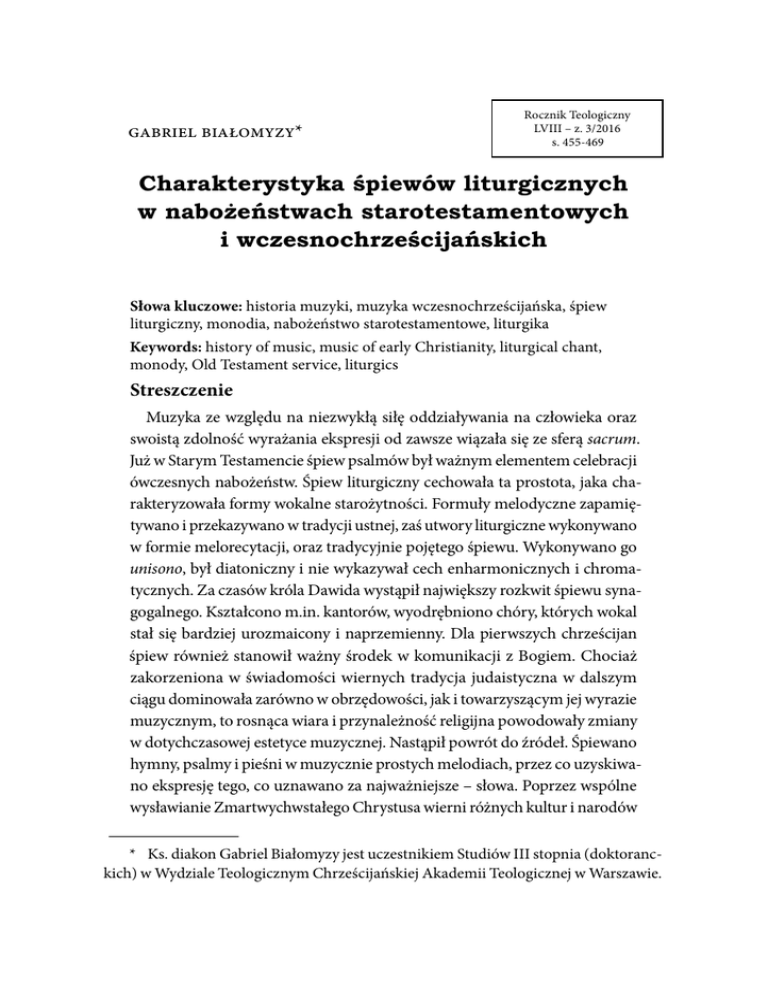 Gabriel Białomyzy* Rocznik Teologiczny LVIII – z. 3/2016 s. 455-469 Charakterystyka śpiewów liturgicznych w nabożeństwach starotestamentowych i wczesnochrześcijańskich Słowa kluczowe: historia muzyki, muzyka wczesnochrześcijańska, śpiew liturgiczny, monodia, nabożeństwo starotestamentowe, liturgika Keywords: history of music, music of early Christianity, liturgical chant, monody, Old Testament service, liturgics Streszczenie Muzyka ze względu na niezwykłą siłę oddziaływania na człowieka oraz swoistą zdolność wyrażania ekspresji od zawsze wiązała się ze sferą sacrum. Już w Starym Testamencie śpiew psalmów był ważnym elementem celebracji ówczesnych nabożeństw. Śpiew liturgiczny cechowała ta prostota, jaka charakteryzowała formy wokalne starożytności. Formuły melodyczne zapamiętywano i przekazywano w tradycji ustnej, zaś utwory liturgiczne wykonywano w formie melorecytacji, oraz tradycyjnie pojętego śpiewu. Wykonywano go unisono, był diatoniczny i nie wykazywał cech enharmonicznych i chromatycznych. Za czasów króla Dawida wystąpił największy rozkwit śpiewu synagogalnego. Kształcono m.in. kantorów, wyodrębniono chóry, których wokal stał się bardziej urozmaicony i naprzemienny. Dla pierwszych chrześcijan śpiew również stanowił ważny środek w komunikacji z Bogiem. Chociaż zakorzeniona w świadomości wiernych tradycja judaistyczna w dalszym ciągu dominowała zarówno w obrzędowości, jak i towarzyszącym jej wyrazie muzycznym, to rosnąca wiara i przynależność religijna powodowały zmiany w dotychczasowej estetyce muzycznej. Nastąpił powrót do źródeł. Śpiewano hymny, psalmy i pieśni w muzycznie prostych melodiach, przez co uzyskiwano ekspresję tego, co uznawano za najważniejsze – słowa. Poprzez wspólne wysławianie Zmartwychwstałego Chrystusa wierni różnych kultur i narodów * Ks. diakon Gabriel Białomyzy jest uczestnikiem Studiów III stopnia (doktoranckich) w Wydziale Teologicznym Chrześcijańskiej Akademii Teologicznej w Warszawie. 456 Gabriel Białomyzy jednoczyli się w myśli i modlitwie, czerpiąc pocieszenie i duchową radość, a także kształtując swą nową tożsamość religijną. Abstract Music, in the reason of impressive strength of influence to man and specific ability of expression, was always connected with the sphere of sacrum. Although in the Old Testament singing psalms was important moment of celebration of the services in that time. The liturgical singing characterized this simplicity which characterized vocal forms of ancient times. Melodic formulas were remembered and transmitted to the oral tradition, but liturgical songs were performed in the form of recitation and traditionally understood singing. It was performed by unison, diatonic and showed no enharmonic and chromatic characteristics. In the days of king David there was the biggest flourishing of synagogue singing. Among others, there were educated singers, distinguished choirs which vocal became more varied and alternating. Singing was also very important mean in contact with God for the first Christians. Although Judaic tradition rooted in the consciousness of the faithful still dominated both of the rituals and the accompanying musical expression, growing faith and religious affiliation caused changes in previous musical aesthetics. There took place a return to the sources. There sung hymns, psalms and songs with simple musical melodies, thus obtained expression which was recognized most important – words. Through the common praise of the Resurrected Christ believers of different cultures and nations were united in thought and prayer, deriving comfort and spiritual joy and also forming their new religious identity. W dziejach kultury całej ludzkości od zawsze istniała muzyka. Jak pokazują badania etnograficzne (Schaffer 1983, 17), nie istnieją kultury pozbawione elementów twórczości artystycznej, w tym także muzycznej. Wiąże się z tym fakt, iż człowiek obdarzony jest duszą, która stanowi pierwiastek i odbicie boskiej chwały i doskonałości. To właśnie dzięki duszy ludzkość jest zdolna do odczuwania harmonii i piękna wyrażonego m.in. w muzyce. Ponadto, umiejętność słyszenia i tworzenia muzyki są boskimi darami, dzięki którym ludzkość może być uważana za koronę stworzenia. Śpiew chronologicznie wyprzedza zaistnienie muzyki instrumentalnej. Był pierwszym możliwym rodzajem tworzenia muzyki w czasach, Charakterystyka śpiewów liturgicznych w nabożeństwach 457 kiedy człowiek nie potrafił jeszcze budować instrumentów. Z tego względu muzyka wokalna wykazuje pewną wyższość nad muzyką instrumentalną. Omawiana sztuka posiada również niezwykłą siłę oddziaływania na człowieka, potrafi bowiem oddawać stan jego umysłu i odczuwanych emocji. Dlatego też od zawsze związana była ze sferą sacrum (Wilson-Dickson 2007, 13). Geneza śpiewu liturgicznego sięga czasów Starego Testamentu. Chociaż „za dni Mojżesza” istotą nabożeństw było składanie ofiar (Дмитриевский 1998, 15), należy zaznaczyć, iż elementy muzyczno-wokalne zajmowały ważne i poczesne miejsce w tworzeniu całego rytualnego przebiegu nabożeństwa (por. Ps 150,1-6). Wśród wielu różnych ofiar składanych w Starym Testamencie1 śpiew związany był najbardziej z ofiarą pochwalną, czyli dziękczynną (hebr. zebahhattodah), gdzie radość zawarta w melodii i słowach wyrażała głęboką wizję Boga, Dawcy wszelkiego dobra (Rosik, 2008, 76). Ideę złączenia ofiary z dziękczynieniem wyraża psalm „Tobie złożę ofiarę pochwalną i wezwę imienia Pańskiego” (Ps 116,17). Niekiedy śpiew traktowano jako szczególną formę ofiary, w randze ważności sytuowanej zaraz po ofiarach materialnych (por. Ps 22,23-26; Hbr 13,15). Ustanowione przez Mojżesza prawo pozwalało, aby obrzędowi ofiarniczemu, zwłaszcza w czas świąteczny towarzyszył dźwięk trąb2. Wśród pozo