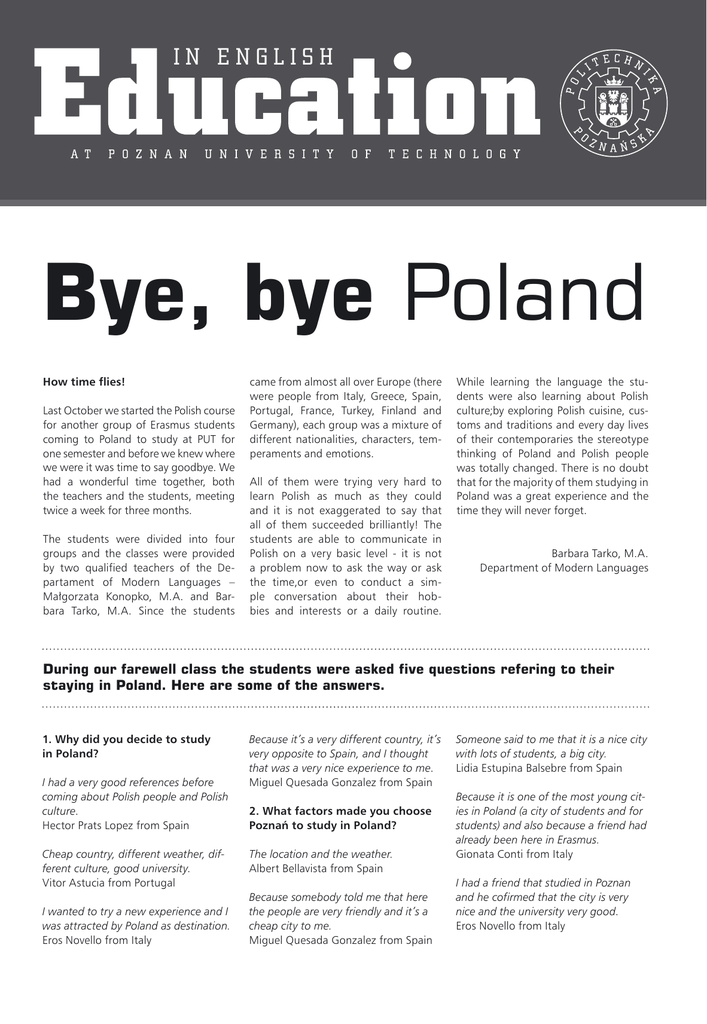 IN ENGLISH Bye, bye Poland How time flies! Last October we started the Polish course for another group of Erasmus students coming to Poland to study at PUT for one semester and before we knew where we were it was time to say goodbye. We had a wonderful time together, both the teachers and the students, meeting twice a week for three months. The students were divided into four groups and the classes were provided by two qualified teachers of the Departament of Modern Languages – Małgorzata Konopko, M.A. and Barbara Tarko, M.A. Since the students came from almost all over Europe (there were people from Italy, Greece, Spain, Portugal, France, Turkey, Finland and Germany), each group was a mixture of different nationalities, characters, temperaments and emotions. All of them were trying very hard to learn Polish as much as they could and it is not exaggerated to say that all of them succeeded brilliantly! The students are able to communicate in Polish on a very basic level - it is not a problem now to ask the way or ask the time,or even to conduct a simple conversation about their hobbies and interests or a daily routine. While learning the language the students were also learning about Polish culture;by exploring Polish cuisine, customs and traditions and every day lives of their contemporaries the stereotype thinking of Poland and Polish people was totally changed. There is no doubt that for the majority of them studying in Poland was a great experience and the time they will never forget. Barbara Tarko, M.A. Department of Modern Languages During our farewell class the students were asked five questions refering to their staying in Poland. Here are some of the answers. 1. Why did you decide to study in Poland? I had a very good references before coming about Polish people and Polish culture. Hector Prats Lopez from Spain Cheap country, different weather, different culture, good university. Vitor Astucia from Portugal I wanted to try a new experience and I was attracted by Poland as destination. Eros Novello from Italy Because it’s a very different country, it’s very opposite to Spain, and I thought that was a very nice experience to me. Miguel Quesada Gonzalez from Spain 2. What factors made you choose Poznań to study in Poland? The location and the weather. Albert Bellavista from Spain Because somebody told me that here the people are very friendly and it’s a cheap city to me. Miguel Quesada Gonzalez from Spain Someone said to me that it is a nice city with lots of students, a big city. Lidia Estupina Balsebre from Spain Because it is one of the most young cities in Poland (a city of students and for students) and also because a friend had already been here in Erasmus. Gionata Conti from Italy I had a friend that studied in Poznan and he cofirmed that the city is very nice and the university very good. Eros Novello from Italy 3. What problems do you face while studying at PUT? People don’t speak English,and some problems with the organisation of our subjects. Vitor Astucia from Portugal None. Eros Novello from Italy The principal problem was the language. Miguel Quesada Gonzalez from Spain Only the difficulties to understand the people. All the other things are great. Albert Bellavista from Spain 4. What did you find the most surprising or shocking when you arrived in Poland? The people are very friendly. I thought that Poland was much poorer but it’s not true. It’s a nice country. Lidia Estupina Balsebre from Spain The people here are very friendly and helpful and the city of Poznan offer a lot of magic things to see and discover. It’s fantastic to stay here because I change my idea about this country. Albert Bellavista from Spain Architecture and lifestyle which is better than I thought. Carlos Vicient from Spain Nothing at all. Right now it’s freezing! The place I come from is very hot. But it’s another different experience to live. Hector Prats Lopez from Spain QUIZ FAMOUS WOMEN You are requested to send your solution and name at [email protected] Which woman pioneered professional nurse training? The first three correct answers will be rewarded with attractive books. The names of the lucky participants will be announced in the next issue of Głos Politechniki. a) Susan Swan b) Florence Nightingale c) Margaret Malart Which English Queen saw the defeat of the Spanish Armada? a) Anne Boleyn b) Victoria c) Elisabeth I Who wrote "The Mousetrap", the world’s longest running play? a) Agatha Christie b) Jane Austin c) Wirginia Wolf 2 GŁOS POLITECHNIKI | LUTY 2011 Which Oscar winning actress is also a spice? a) Nutmeg Hepburn b) Ginger Rogers c) Cinnamon Smith a) Macaronii b) Montessori c) Belafonte Where was J. K. Rowling when she thought up Harry Potter? a) On a train b) In Argentina c) In her kitchen What was Margaret Thatcher’s nickname? Who did Madonna play in a film? a) Eva Peron b) Eleonor Roosevelt c) Amy Johnson Which Mary invented new teaching methods? a) The Golden Goat b) The Iron Lady c) The Copper Crow GOOD LUCK EDUCATION IN ENGLISH AT PUT 3 SPRING IDIOMS To be full of the joys of spring - to be very happy To be no spring chicken - to not be young anymore To spring to life - suddenly become active To spring to mind - appear suddenly or immediately in your thoughts A mini course English at Dean’s Office - part 3 USEFUL VOCABULARY UŻYTECZNE SŁOWNICTWO 1. ACADEMIC YEAR ROK AKADEMICKI The academic year begins on October…and ends on June… Rok akademicki rozpoczyna się… października i kończy… czerwca. 2. ACADEMIC CALENDAR HARMONOGRAM AKADEMICKI The Inauguration Day Dzień Inauguracji Roku Akademickiego The Inauguration Day is held on October… Dzień Inauguracji Roku Akademickiego jest… października. Rector’s Day Dzień Rektorski Polish Public Holiday Polskie święto państwowe Rector’s Days and Polish Public Holiday are free from courses. Dni Rektorskie i polskie święta państwowe są wolne od zajęć dydaktycznych. 3. WINTER SEMES