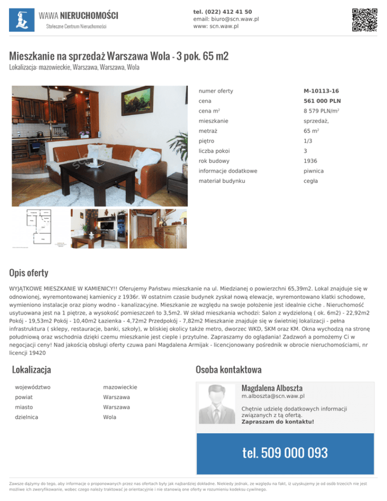 tel. (022) 412 41 50 email: [email protected] www: scn.waw.pl Mieszkanie na sprzedaż Warszawa Wola - 3 pok. 65 m2 Lokalizacja: mazowieckie, Warszawa, Warszawa, Wola numer oferty M-10113-16 cena 561 000 PLN cena m 8 579 PLN/m2 mieszkanie sprzedaż, metraż 65 m2 piętro 1/3 liczba pokoi 3 rok budowy 1936 informacje dodatkowe piwnica materiał budynku cegła 2 Opis oferty WYJĄTKOWE MIESZKANIE W KAMIENICY!! Oferujemy Państwu mieszkanie na ul. Miedzianej o powierzchni 65,39m2. Lokal znajduje się w odnowionej, wyremontowanej kamienicy z 1936r. W ostatnim czasie budynek zyskał nową elewacje, wyremontowano klatki schodowe, wymieniono instalacje oraz piony wodno - kanalizacyjne. Mieszkanie ze względu na swoje położenie jest idealnie ciche . Nieruchomość usytuowana jest na 1 piętrze, a wysokość pomieszczeń to 3,5m2. W skład mieszkania wchodzi: Salon z wydzieloną ( ok. 6m2) - 22,92m2 Pokój - 19,53m2 Pokój - 10,40m2 Łazienka - 4,72m2 Przedpokój - 7,82m2 Mieszkanie znajduje się w świetniej lokalizacji - pełna infrastruktura ( sklepy, restauracje, banki, szkoły), w bliskiej okolicy także metro, dworzec WKD, SKM oraz KM. Okna wychodzą na stronę południową oraz wschodnia dzięki czemu mieszkanie jest cieple i przytulne. Zapraszamy do oglądania! Zadzwoń a pomożemy Ci w negocjacji ceny! Nad jakością obsługi oferty czuwa pani Magdalena Armijak - licencjonowany pośrednik w obrocie nieruchomościami, nr licencji 19420 Lokalizacja Osoba kontaktowa Magdalena Alboszta województwo mazowieckie powiat Warszawa [email protected] miasto Warszawa dzielnica Wola Chętnie udzielę dodatkowych informacji związanych z tą ofertą. Zapraszam do kontaktu! tel. 509 000 093 Zawsze dążymy do tego, aby informacje o proponowanych przez nas ofertach były jak najbardziej dokładne. Niekiedy jednak, ze względu na fakt, iż uzyskujemy je od osób trzecich nie jest możliwe ich zweryfikowanie, wobec czego należy traktować je orientacyjnie i nie stanowią one oferty w rozumieniu kodeksu cywilnego.