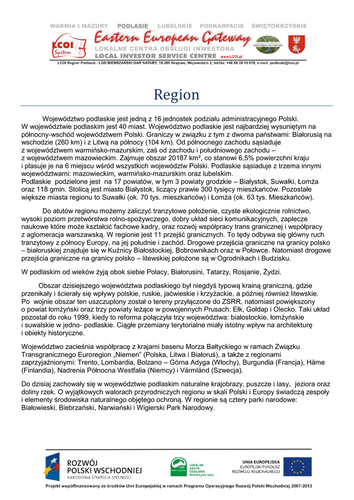 Region Województwo podlaskie jest jedną z 16 jednostek podziału administracyjnego Polski. W województwie podlaskim jest 40 miast. Województwo podlaskie jest najbardziej wysuniętym na północny-wschód województwem Polski. Graniczy w związku z tym z dwoma państwami: Białorusią na wschodzie (260 km) i z Litwą na północy (104 km). Od północnego zachodu sąsiaduje z województwem warmińsko-mazurskim, zaś od zachodu i południowego zachodu – z województwem mazowieckim. Zajmuje obszar 20187 km², co stanowi 6,5% powierzchni kraju i plasuje je na 6 miejscu wśród wszystkich województw Polski. Podlaskie sąsiaduje z trzema innymi województwami: mazowieckim, warmińsko-mazurskim oraz lubelskim. Podlaskie podzielone jest na 17 powiatów, w tym 3 powiaty grodzkie – Białystok, Suwałki, Łomża oraz 118 gmin. Stolicą jest miasto Białystok, liczący prawie 300 tysięcy mieszkańców. Pozostałe większe miasta regionu to Suwałki (ok. 70 tys. mieszkańców) i Łomża (ok. 63 tys. Mieszkańców). Do atutów regionu możemy zaliczyć tranzytowe położenie, czyste ekologicznie rolnictwo, wysoki poziom przetwórstwa rolno-spożywczego, dobry układ sieci komunikacyjnych, zaplecze naukowe które może kształcić fachowe kadry, oraz rozwój współpracy trans granicznej i współpracy z aglomeracja warszawską. W regionie jest 11 przejść granicznych. To tędy odbywa się główny ruch tranzytowy z północy Europy, na jej południe i zachód. Drogowe przejścia graniczne na granicy polsko – białoruskiej znajduje się w Kuźnicy Białostockiej, Bobrownikach oraz w Połowce. Natomiast drogowe przejścia graniczne na granicy polsko – litewskiej położone są w Ogrodnikach i Budzisku. W podlaskim od wieków żyją obok siebie Polacy, Białorusini, Tatarzy, Rosjanie, Żydzi. Obszar dzisiejszego województwa podlaskiego był niegdyś typową krainą graniczną, gdzie przenikały i ścierały się wpływy polskie, ruskie, jaćwieskie i krzyżackie, a później również litewskie. Po wojnie obszar ten uszczuplony został o tereny przyłączone do ZSRR, natomiast powiększony o powiat łomżyński oraz trzy powiaty leżące w powojennych Prusach: Ełk, Gołdap i Olecko. Taki układ pozostał do roku 1999, kiedy to reforma połączyła trzy województwa: białostockie, łomżyńskie i suwalskie w jedno- podlaskie. Ciągłe przemiany terytorialne miały istotny wpływ na architekturę i obiekty historyczne. Województwo zacieśnia współpracę z krajami basenu Morza Bałtyckiego w ramach Związku Transgranicznego Euroregion „Niemen” (Polska, Litwa i Białoruś), a także z regionami zaprzyjaźnionymi: Trento, Lombardia, Bolzano – Górna Adyga (Włochy), Burgundia (Francja), Häme (Finlandia), Nadrenia Północna Westfalia (Niemcy) i Värmländ (Szwecja). Do dzisiaj zachowały się w województwie podlaskim naturalne krajobrazy, puszcze i lasy, jeziora oraz doliny rzek. O wyjątkowych walorach przyrodniczych regionu w skali Polski i Europy świadczą zespoły i elementy środowiska naturalnego objętego ochroną. W regionie są cztery parki narodowe: Białowieski, Biebrzański, Narwiański i Wigierski Park Narodowy. Gospodarka Gospodarka województwa podlaskiego to przede wszystkim przemysł spożywczy, lekki, drzewny, budowlany i maszynowy. W podlaskim działają obecnie duże zakłady zajmujące się przetwórstwem mleka, mięsa, drobiu i zbóż, a funkcjonujące w oparciu o nowoczesne technologie mleczarnie należą do największych i najnowocześniejszych w kraju. Według danych GUS na Podlasiu zarejestrowanych jest 91 tys. podmiotów gospodarczych (poza rolnictwem) z czego 32,3% to handel i naprawy, 12,7%- obsługa nieruchomości, 10,2%- budownictwo, 9,3%- przetwórstwo przemysłowe i 8%- transport. Gospodarka regionu w istotnym stopniu opiera się także na rolnictwie, które niemal całkowicie należy do sektora prywatnego. Struktura zatrudnienia w rolnictwie to 24% pracujących. Niezwykłość produktów rolnych pochodzących z Podlasia polega w znacznej mierze na tym, że powstają one na jednym z najczystszych ekologicznie obszarów Polski (Zielone Płuca Polski). Między innymi dzięki temu są one bardzo popularne na wymagających rynkach państw wchodzących w skład Unii Europejskiej. Dlatego rozwój gospodarczy regionu musi gwarantować zachowanie czystości środowiska naturalnego. W województwie podlaskim funkcjonuje 120,1 tys. gospodarstw rolnych. W stosunku do roku 1996 w woj. podlaskim wzrosło pogłowie bydła, szczególnie krów dojnych. Dużym, doskonale wykorzystywanym przez rolników, atutem naszego województwa jest największa w kraju powierzchnia użytków zielonych, co wyznacza nam kierunek rozwoju. W województwie podlaskim mamy o 70% większą obsadę bydła w porównaniu z innymi województwami polski. Województwo podlaskie to też idealne miejsce dla inwestorów. Kilkanaście wyższych uczelni zapewnia silne i bogate zaplecze wykształconych specjalistów, a przygraniczne położenie daje szanse na efektywną współpracę z sąsiadami. Podlaskie to także lider w wykorzystaniu unijnego wsparcia, które przeznaczane jest na budowę infrastruktury i podnoszenie kwalifikacji zawodowych. Stolica – Białystok to największy ośrodek przemysłowy oraz centrum kulturalne i naukowe regionu. Działa tu większość instytucji kultury i uczelni wyższych, w tym: teatry, filharmonia, muzea, uniwersytet, akademia medyczna, politechnika, wyższe szkoły ekonomiczne. Przeciętne miesięczne wynagrodzenie mieszkańca woj. podlaskiego w I kwartale 2011 r. wynosiło 3079,20 zł, co lokowało je na X miejscu względem wszystkich województw. W końcu czerwca 2011 liczba zarejestrowanych bezrobotnych w województwie obejmowała ok. 61,2 tys. mieszkańców, co stanowi stopę bezrobocia na poziomie 12,6%. Województwo podlaskie dostarczyło w 2008 roku 2,3% PKB Polski. Wynik ten plasuje województwo na 14 miejscu. Dynamika wzrostu PKB kształtuje się na