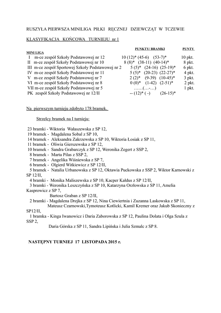RUSZYŁA PIERWSZA MINILIGA PIŁKI RĘCZNEJ DZIEWCZĄT W TCZEWIE KLASYFIKACJA KOŃCOWA TURNIEJU nr 1 PUNKTY/ BRAMKI PUNTY MINI LIGA I m-ce zespół Szkoły Podstawowej nr 12 10 (12)* (45-6) (53-7)* II m-ce zespół Szkoły Podstawowej nr 10 8 (8)* (38-11) (40-14)* III m-ce zespół Sportowej Szkoły Podstawowej nr 2 5 (5)* (24-16) (25-19)* IV m-ce zespół Szkoły Podstawowej nr 11 5 (5)* (20-23) (22-27)* V m-ce zespół Szkoły Podstawowej nr 7 2 (2)* (9-39) (10-45)* VI m-ce zespół Szkoły Podstawowej nr 8 0 (0)* (1-42) (2-51)* VII m-ce zespół Szkoły Podstawowej nr 5 ……(…-…) PK zespół Szkoły Podstawowej nr 12/II -- (12)* ( -) (26-15)* 10 pkt. 8 pkt. 6 pkt. 4 pkt. 3 pkt. 2 pkt. 1 pkt. Na pierwszym turnieju zdobyto 178 bramek. Strzelcy bramek na I turnieju: 23 bramki - Wiktoria Wałaszewska z SP 12, 19 bramek - Magdalena Sobal z SP 10, 14 bramek - Aleksandra Zakrzewska z SP 10, Wiktoria Łosiak z SP 11, 11 bramek - Oliwia Gierszewska z SP 12, 10 bramek - Sandra Grabarczyk z SP 12, Weronika Zegert z SSP 2, 8 bramek - Marta Pilas z SSP 2, 7 bramek - Angelika Wiśniewska z SP 7, 6 bramek - Olgierd Witkiewicz z SP 12/II, 5 bramek - Natalia Urbanowska z SP 12, Oktawia Puckowska z SSP 2, Wiktor Karnowski z SP 12/II, 4 bramki - Monika Maliszewska z SP 10, Kacper Kałdus z SP 12/II, 3 bramki - Weronika Leszczyńska z SP 10, Katarzyna Orzłowska z SP 11, Amelia Kasprowicz z SP 7, Bartosz Graban z SP 12/II, 2 bramki - Magdalena Drejka z SP 12, Nina Ciewiertnia i Zuzanna Laskowska z SP 11, Mateusz Czarnowski,Tymoteusz Kotlicki, Kamil Kremer oraz Jakub Skonieczny z SP12/II, 1 bramka - Kinga Iwanowicz i Daria Zaborowska z SP 12, Paulina Dolata i Olga Szula z SSP 2, Daria Górska z SP 11, Sandra Lipińska i Julia Szmalc z SP 8. NASTĘPNY TURNIEJ 17 LISTOPADA 2015 r.