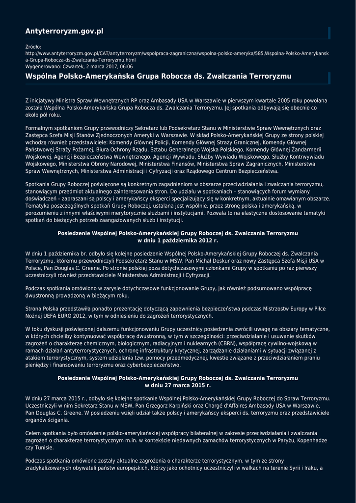 Antyterroryzm.gov.pl Źródło: http://www.antyterroryzm.gov.pl/CAT/antyterroryzm/wspolpraca-zagraniczna/wspolna-polsko-ameryka/585,Wspolna-Polsko-Amerykansk a-Grupa-Robocza-ds-Zwalczania-Terroryzmu.html Wygenerowano: Czwartek, 2 marca 2017, 06:06 Wspólna Polsko-Amerykańska Grupa Robocza ds. Zwalczania Terroryzmu Z inicjatywy Ministra Spraw Wewnętrznych RP oraz Ambasady USA w Warszawie w pierwszym kwartale 2005 roku powołana została Wspólna Polsko-Amerykańska Grupa Robocza ds. Zwalczania Terroryzmu. Jej spotkania odbywają się obecnie co około pół roku. Formalnym spotkaniom Grupy przewodniczy Sekretarz lub Podsekretarz Stanu w Ministerstwie Spraw Wewnętrznych oraz Zastępca Szefa Misji Stanów Zjednoczonych Ameryki w Warszawie. W skład Polsko-Amerykańskiej Grupy ze strony polskiej wchodzą również przedstawiciele: Komendy Głównej Policji, Komendy Głównej Straży Granicznej, Komendy Głównej Państwowej Straży Pożarnej, Biura Ochrony Rządu, Sztabu Generalnego Wojska Polskiego, Komendy Głównej Żandarmerii Wojskowej, Agencji Bezpieczeństwa Wewnętrznego, Agencji Wywiadu, Służby Wywiadu Wojskowego, Służby Kontrwywiadu Wojskowego, Ministerstwa Obrony Narodowej, Ministerstwa Finansów, Ministerstwa Spraw Zagranicznych, Ministerstwa Spraw Wewnętrznych, Ministerstwa Administracji i Cyfryzacji oraz Rządowego Centrum Bezpieczeństwa. Spotkania Grupy Roboczej poświęcone są konkretnym zagadnieniom w obszarze przeciwdziałania i zwalczania terroryzmu, stanowiącym przedmiot aktualnego zainteresowania stron. Do udziału w spotkaniach – stanowiących forum wymiany doświadczeń – zapraszani są polscy i amerykańscy eksperci specjalizujący się w konkretnym, aktualnie omawianym obszarze. Tematyka poszczególnych spotkań Grupy Roboczej, ustalana jest wspólnie, przez stronę polska i amerykańską, w porozumieniu z innymi właściwymi merytorycznie służbami i instytucjami. Pozwala to na elastyczne dostosowanie tematyki spotkań do bieżących potrzeb zaangażowanych służb i instytucji. Posiedzenie Wspólnej Polsko-Amerykańskiej Grupy Roboczej ds. Zwalczania Terroryzmu w dniu 1 października 2012 r. W dniu 1 października br. odbyło się kolejne posiedzenie Wspólnej Polsko-Amerykańskiej Grupy Roboczej ds. Zwalczania Terroryzmu, któremu przewodniczyli Podsekretarz Stanu w MSW, Pan Michał Deskur oraz nowy Zastępca Szefa Misji USA w Polsce, Pan Douglas C. Greene. Po stronie polskiej poza dotychczasowymi członkami Grupy w spotkaniu po raz pierwszy uczestniczyli również przedstawiciele Ministerstwa Administracji i Cyfryzacji. Podczas spotkania omówiono w zarysie dotychczasowe funkcjonowanie Grupy, jak również podsumowano współpracę dwustronną prowadzoną w bieżącym roku. Strona Polska przedstawiła ponadto prezentację dotyczącą zapewnienia bezpieczeństwa podczas Mistrzostw Europy w Piłce Nożnej UEFA EURO 2012, w tym w odniesieniu do zagrożeń terrorystycznych. W toku dyskusji poświęconej dalszemu funkcjonowaniu Grupy uczestnicy posiedzenia zwrócili uwagę na obszary tematyczne, w których chcieliby kontynuować współpracę dwustronną, w tym w szczególności: przeciwdziałanie i usuwanie skutków zagrożeń o charakterze chemicznym, biologicznym, radiacyjnym i nuklearnych (CBRN), współpracę cywilno-wojskową w ramach działań antyterrorystycznych, ochronę infrastruktury krytycznej, zarządzanie działaniami w sytuacji związanej z atakiem terrorystycznym, system udzielania tzw. pomocy przedmedycznej, kwestie związane z przeciwdziałaniem praniu pieniędzy i finansowaniu terroryzmu oraz cyberbezpieczeństwo. Posiedzenie Wspólnej Polsko-Amerykańskiej Grupy Roboczej ds. Zwalczania Terroryzmu w dniu 27 marca 2015 r. W dniu 27 marca 2015 r., odbyło się kolejne spotkanie Wspólnej Polsko-Amerykańskiej Grupy Roboczej do Spraw Terroryzmu. Uczestniczyli w nim Sekretarz Stanu w MSW, Pan Grzegorz Karpiński oraz Chargé d’Affaires Ambasady USA w Warszawie, Pan Douglas C. Greene. W posiedzeniu wzięli udział także polscy i amerykańscy eksperci ds. terroryzmu oraz przedstawiciele organów ścigania. Celem spotkania było omówienie polsko-amerykańskiej współpracy bilateralnej w zakresie przeciwdziałania i zwalczania zagrożeń o charakterze terrorystycznym m.in. w kontekście niedawnych zamachów terrorystycznych w Paryżu, Kopenhadze czy Tunisie. Podczas spotkania omówione zostały aktualne zagrożenia o charakterze terrorystycznym, w tym ze strony zradykalizowanych obywateli państw europejskich, którzy jako ochotnicy uczestniczyli w walkach na terenie Syrii i Iraku, a obecnie powracają do Europy z nabytym doświadczeniem bojowym (tzw. foreign fighters) oraz wykorzystywanie cyberprzestrzeni do działalności terrorystycznej. Przedstawiciel MSW omówił również założenia Narodowego Programu Antyterrorystycznego na lata 2015-2019, przyjętego uchwałą Rady Ministrów nr 252 z dnia 9 grudnia, 2014 r., zaś strona amerykańska stosowaną w USA strategię komunikacji społecznej, w sytuacji wystąpienia zagrożenia o charakterze terrorystycznym. Ponadto w trakcie posiedzenia dyskutowano na temat szkoleń i ćwiczeń antyterrorystycznych planowanych przez USA. Posiedzenie Wspólnej Polsko-Amerykańskiej Grupy ds. Zwalczania Terroryzmu w dniu 20 grudnia 2011 r. Niniejszemu posiedzeniu przewodniczyli Zastępca Szefa Misji, Pan William A. Heidt oraz Podsekretarz Stanu w Ministerstwie Spraw Wewnętrznych,Pan Adam Rapacki. Podczas spotkania omówiono wspólne polsko-amerykańskie przedsięwzięcia zorganizowane w trakcie ostatnich miesięcy, w tym m.in.: szkolenie pn. Shadow Wolf dotyczące ochrony granicy państwowej, ćwiczenia specjalnych jednostek policyjnych wchodzących w skład Grupy ATLAS, w których strona amerykańska uczestniczyła w charakterze obserwatorów, polsko-ukraińskie warsztaty z zakresu reagowania na zagrożenia bioterrorystyczne zorganizowane przez Amerykanów na Ukrainie, a także współpracę w obsz