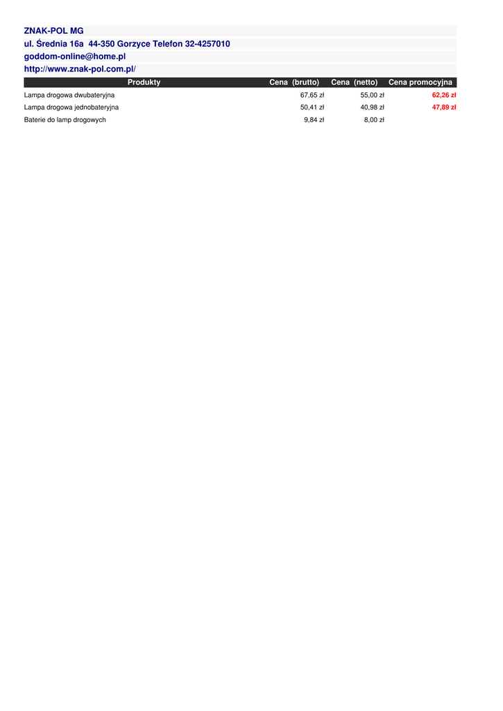 ZNAK-POL MG ul. Średnia 16a 44-350 Gorzyce Telefon 32-4257010 [email protected] http://www.znak-pol.com.pl/ Produkty Cena (brutto) Cena (netto) Cena promocyjna Lampa drogowa dwubateryjna 67,65 zł 55,00 zł 62,26 zł Lampa drogowa jednobateryjna 50,41 zł 40,98 zł 47,89 zł Baterie do lamp drogowych 9,84 zł 8,00 zł