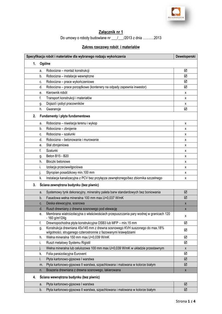 Załącznik nr 1 Do umowy o roboty budowlane nr ___/___/2013 z dnia ……….2013 Zakres rzeczowy robót i materiałów Specyfikacja robót i materiałów dla wybranego rodzaju wykończenia 1. Ogólne a. b. c. d. e. f. g. h. 2. Robocizna – montaż konstrukcji Robocizna – instalacje wewnętrzne Robocizna – prace wykończeniowe Robocizna – prace porządkowe (kontenery na odpady zapewnia inwestor) Kierownik robót Transport konstrukcji i materiałów Dojazd i pobyt pracowników Gwarancje Robocizna – niwelacja terenu i wykop Robocizna – zbrojenie Robocizna – szalunki Robocizna – betonowanie i murowanie Stal zbrojeniowa Szalunki Beton B15 - B20 Bloczki betonowe Izolacja przeciwwilgociowa Styropian posadzkowy min.100 mm Instalacja kanalizacyjna z PCV bez przyłącza zewnętrznego/bez zbiornika szczelnego x x x x x x x x x x x Ściana zewnętrzna budynku (bez piwnic) a. Systemowy tynk dekoracyjny, mineralny paleta barw standardowych bez boniowania b. c. d. e. Fasadowa wełna mineralna 100 mm max.U=0,037 W/mK Deska elewacyjna, sosnowa Ruszt drewniany z drewna sosnowego pod elewację Membrana wiatroizolacyjna o właściwościach przepuszczania pary wodnej w granicach 120 - 160 g/m2/24g f. Drewnopochodna płyta konstrukcyjna OSB3 lub MFP – min.15 mm g. Konstrukcja drewniana 45x145 mm z drewna sosnowego KVH suszonego do max.18% wilgotności, struganego czterostronnie z fazowanymi krawędziami h. Wełna mineralna 150 mm max.U=0,039 W/mK i. Ruszt metalowy Systemu Rigistil j. Wełna mineralna lub celulozowa 100 mm max.U=0,039 W/mK w układzie przestawnym k. Folia paraizolacyjna Eurovent l. Płyta kartonowo-gipsowa I warstwa m. Płyta kartonowo-gipsowa II warstwa, szpachlowana i malowana w kolorze białym n. Boazeria drewniana z drewna sosnowego, lakierowana 4. x x x Fundamenty i płyta fundamentowa a. b. c. d. e. f. g. h. i. j. k. 3. Deweloperski x x x x x Ściana wewnętrzna budynku (bez piwnic) a. b. Płyta kartonowo-gipsowa I warstwa Płyta kartonowo-gipsowa II warstwa, szpachlowana i malowana w kolorze białym Strona 1 z 4 Specyfikacja robót i materiałów dla wybranego rodzaju wykończenia c. Boazeria drewniana z drewna sosnowego, lakierowana d. Konstrukcja drewniana 45x95 mm (45x145 mm ścianki konstrukcyjne) z drewna sosnowego KVH suszonego do max.18% wilgotności, struganego czterostronnie z fazowanymi krawędziami e. Wełna mineralna 100 mm max.U=0,039 W/mK f. Płyta kartonowo-gipsowa I warstwa g. Płyta kartonowo-gipsowa II warstwa, szpachlowana i malowana w kolorze białym h. Boazeria drewniana z drewna sosnowego, lakierowana 5. e. f. g. h. i. j. Jastrych cementowy - min gr. 60 mm Płyta izolacyjna IZOROL PP - Kotar, styropian EPS 100, - gr. 30 Drewnopochodna płyta konstrukcyjna OSB3 lub MFP – min.22 mm Konstrukcja drewniana stropu z belek 45x220-245 mm z drewna sosnowego KVH suszonego do max.18% wilgotności, struganego czterostronnie z fazowanymi krawędziami Wełna mineralna lub celulozowa 100 mm max.U=0,039 W/mK Ruszt metalowy Systemu Rigistil Płyta kartonowo-gipsowa I warstwa Płyta kartonowo-gipsowa II warstwa, szpachlowana i malowana w kolorze białym Boazeria drewniana z drewna sosnowego, lakierowana x x Dach/Strop w budynku parterowym a. Dachówka bitumiczna Owens Corning Duration® AR w kolorze podstawowym (kolor …………………) dopłata 30,00 zł netto / m2 powierzchni netto budynku b. Blachodachówka firmy Blachodach profil Twist, Bingo, Brawo lub Swing w kolorze podstawowym (kolor …………………) c. Dachówka betonowa Braas Celtycka Lumino w kolorze podstawowym (kolor …………………) d. Drewnopochodna płyta konstrukcyjna OSB3 lub MFP – 22 mm e. Łaty drewniane f. Membrana dachowa wysoce para przepuszczalna Eurovent g. Konstrukcja drewniana dachu 45x195 mm z drewna sosnowego KVH suszonego do max.18% wilgotności, struganego czterostronnie z fazowanymi krawędziami h. Wełna mineralna 200 mm max.U=0,039 W/mK i. Ruszt metalowy Systemu Rigistil lub drewniany j. Wełna mineralna lub celulozowa 100-50 mm max.U=0,039 W/mK w układzie przestawnym k. Folia paraizolacyjna l. Płyta kartonowo-gipsowa I warstwa m. Płyta kartonowo-gipsowa II warstwa, szpachlowana i malowana w kolorze białym n. Boazeria drewniana z drewna sosnowego, lakierowana o. Kompletny system orynnowania PCV w kolorze podstawowym (kolor ………………………..) p. Podbitka drewniana impregnowana biała q. Obróbki blacharskie 7. Strop w budynku z poddaszem użytkowym lub piętrowym a. b. c. d. 6. Deweloperski x x x x x Ściany zewnętrzne pomieszczenia gospodarcze, garaż, wiatą a. b. c. d. Systemowy tynk dekoracyjny, mineralny paleta barw standardowych bez boniowania Fasadowa wełna mineralna 100mm Deska elewacyjna, sosnowa Ruszt drewniany z drewna sosnowego pod elewację x x x x Strona 2 z 4 Specyfikacja robót i materiałów dla wybranego rodzaju wykończenia e. Membrana wiatroizolacyjna o właściwościach przepuszczania pary wodnej w granicach 120 - 160 g/m2/24g f. Drewnopochodna płyta konstrukcyjna OSB3 lub MFP – min.12 mm g. Konstrukcja drewniana 45x145 mm z drewna sosnowego KVH suszonego do max.18% wilgotności, struganego czterostronnie z fazowanymi krawędziami h. Wełna mineralna lub celulozowa 150 mm max.U=0,039 W/mK i. Ruszt metalowy Systemu Rigistil lub drewniany j. Wełna mineralna 100 mm max.U=0,039 W/mK w układzie przestawnym k. Folia paraizolacyjna l. Płyta kartonowo-gipsowa I warstwa m. Płyta kartonowo-gipsowa II warstwa, szpachlowana i malowana w kolorze białym n. Boazeria drewniana z drewna sosnowego, lakierowana 8. x x x x x x x x x Dach/Strop nad pomieszczeniami gospodarczymi, garażem, wiatą a. b. Papa termozgrzewalna Blachodachówka firmy Blachodach profil Twist, Bingo, Brawo lub Swing w kolorze podstawowym (kolor …………………) c. Dachówka betonowa Brass Celtycka Lumino lub Grecka Lumino w kolorze podstawowym (kolor …………………) d. Drewnopochodna płyta konstrukcyjna OSB3 lub MFP – 22 mm e. Łaty drewniane f. 