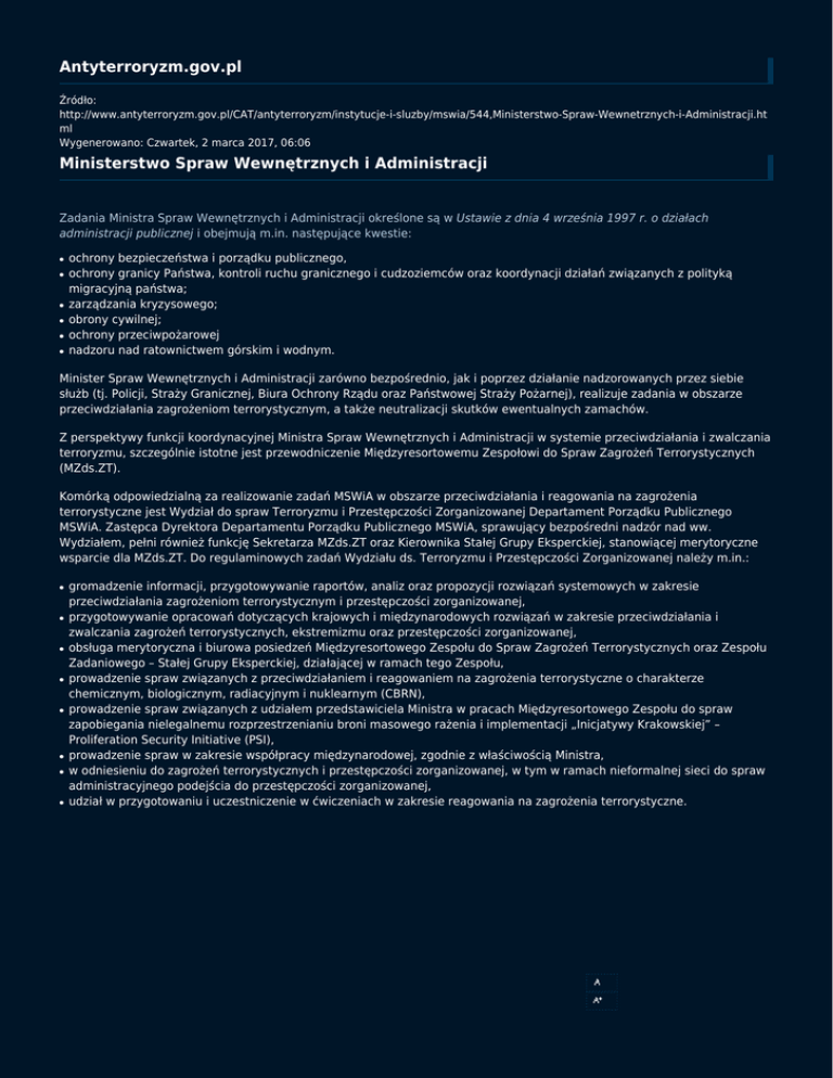 Antyterroryzm.gov.pl Źródło: http://www.antyterroryzm.gov.pl/CAT/antyterroryzm/instytucje-i-sluzby/mswia/544,Ministerstwo-Spraw-Wewnetrznych-i-Administracji.ht ml Wygenerowano: Czwartek, 2 marca 2017, 06:06 Ministerstwo Spraw Wewnętrznych i Administracji Zadania Ministra Spraw Wewnętrznych i Administracji określone są w Ustawie z dnia 4 września 1997 r. o działach administracji publicznej i obejmują m.in. następujące kwestie: ● ● ● ● ● ● ochrony bezpieczeństwa i porządku publicznego, ochrony granicy Państwa, kontroli ruchu granicznego i cudzoziemców oraz koordynacji działań związanych z polityką migracyjną państwa; zarządzania kryzysowego; obrony cywilnej; ochrony przeciwpożarowej nadzoru nad ratownictwem górskim i wodnym. Minister Spraw Wewnętrznych i Administracji zarówno bezpośrednio, jak i poprzez działanie nadzorowanych przez siebie służb (tj. Policji, Straży Granicznej, Biura Ochrony Rządu oraz Państwowej Straży Pożarnej), realizuje zadania w obszarze przeciwdziałania zagrożeniom terrorystycznym, a także neutralizacji skutków ewentualnych zamachów. Z perspektywy funkcji koordynacyjnej Ministra Spraw Wewnętrznych i Administracji w systemie przeciwdziałania i zwalczania terroryzmu, szczególnie istotne jest przewodniczenie Międzyresortowemu Zespołowi do Spraw Zagrożeń Terrorystycznych (MZds.ZT). Komórką odpowiedzialną za realizowanie zadań MSWiA w obszarze przeciwdziałania i reagowania na zagrożenia terrorystyczne jest Wydział do spraw Terroryzmu i Przestępczości Zorganizowanej Departament Porządku Publicznego MSWiA. Zastępca Dyrektora Departamentu Porządku Publicznego MSWiA, sprawujący bezpośredni nadzór nad ww. Wydziałem, pełni również funkcję Sekretarza MZds.ZT oraz Kierownika Stałej Grupy Eksperckiej, stanowiącej merytoryczne wsparcie dla MZds.ZT. Do regulaminowych zadań Wydziału ds. Terroryzmu i Przestępczości Zorganizowanej należy m.in.: ● ● ● ● ● ● ● ● gromadzenie informacji, przygotowywanie raportów, analiz oraz propozycji rozwiązań systemowych w zakresie przeciwdziałania zagrożeniom terrorystycznym i przestępczości zorganizowanej, przygotowywanie opracowań dotyczących krajowych i międzynarodowych rozwiązań w zakresie przeciwdziałania i zwalczania zagrożeń terrorystycznych, ekstremizmu oraz przestępczości zorganizowanej, obsługa merytoryczna i biurowa posiedzeń Międzyresortowego Zespołu do Spraw Zagrożeń Terrorystycznych oraz Zespołu Zadaniowego – Stałej Grupy Eksperckiej, działającej w ramach tego Zespołu, prowadzenie spraw związanych z przeciwdziałaniem i reagowaniem na zagrożenia terrorystyczne o charakterze chemicznym, biologicznym, radiacyjnym i nuklearnym (CBRN), prowadzenie spraw związanych z udziałem przedstawiciela Ministra w pracach Międzyresortowego Zespołu do spraw zapobiegania nielegalnemu rozprzestrzenianiu broni masowego rażenia i implementacji „Inicjatywy Krakowskiej” – Proliferation Security Initiative (PSI), prowadzenie spraw w zakresie współpracy międzynarodowej, zgodnie z właściwością Ministra, w odniesieniu do zagrożeń terrorystycznych i przestępczości zorganizowanej, w tym w ramach nieformalnej sieci do spraw administracyjnego podejścia do przestępczości zorganizowanej, udział w przygotowaniu i uczestniczenie w ćwiczeniach w zakresie reagowania na zagrożenia terrorystyczne.