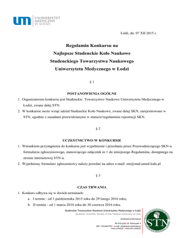 Łódź, dn. 07 XII 2015 r. Regulamin Konkursu na Najlepsze Studenckie Koło Naukowe Studenckiego Towarzystwa Naukowego Uniwersytetu Medycznego w Łodzi §1 POSTANOWIENIA OGÓLNE 1. Organizatorem konkursu jest Studenckie Towarzystwo Naukowe Uniwersytetu Medycznego w Łodzi, zwane dalej STN. 2. W konkursie może wziąć udział Studenckie Koło Naukowe, zwane dalej SKN, zarejestrowane w STN, zgodnie z zasadami przewidzianymi w statucie/regulaminie rejestracji SKN. §2 UCZESTNICTWO W KONKURSIE 1. Warunkiem przystąpienia do konkursu jest wypełnienie i przesłanie przez Przewodniczącego SKN-u formularza zgłoszeniowego, stanowiącego załącznik nr 1 do niniejszego Regulaminu, dostępnego na stronie internetowej STN-u. 2. Wypełniony formularz zgłoszeniowy należy przesłać na adres e-mail: [email protected] §3 CZAS TRWANIA 1. Konkurs odbywa się w dwóch terminach: a. I termin - od 1 października 2015 roku do 29 lutego 2016 roku; b. II termin - od 1 marca 2016 roku do 30 czerwca 2016 roku. Studenckie Towarzystwo Naukowe Uniwersytetu Medycznego w Łodzi Students’ Scientific Society at the Medical University of Lodz [email protected] 90-419 Łódź |Al. Kościuszki 4 NIP: 7251843739 | e-mali: [email protected] www.umed.pl | www.stn.umed.pl 2. Jednorazowe złożenie formularza zgłoszeniowego uprawnia do udziału w obu terminach konkursu. §4 ZASADY KONKURSU 1. W konkursie oceniana będzie aktywna działalność SKN-u i jego członków. Formy działalności wskazane w§ 6 ust. 1 premiowane będą określoną liczbą punktów, przyznawaną przez Komisję Konkursową, o której mowa w § 5. 2. Punkty zostaną przyznawane na podstawie miesięcznego formularza sprawozdawczego z działalności koła za poprzedni miesiąc stanowiącego załącznik nr 2 do niniejszego Regulaminu, dostępnego na stronie internetowej STN-u, przesłanego przez Przewodniczącego SKN. 3. Formularz, o którym mowa w ust. 2 należy przesłać na adres e-mail: [email protected] w terminie do 5 dnia każdego miesiąca. 4. Sprawozdanie z działalności w październiku i listopadzie należy wysłać do 14 grudnia 2015. 5. Nieprzesłanie formularza sprawozdawczego w wyznaczonym terminie będzie skutkowało nieprzyznaniem punktów, za dany miesiąc. 6. Lista rankingowa kół naukowych, zgłoszonych do konkursu będzie comiesięcznie publikowana i aktualizowana na stronie internetowej STN . 7. Lista rankingowa, o której mowa w ust. 6 zostanie publikowana w terminie do 15. dnia każdego miesiąca. 8. W przypadku wątpliwości co do ilości przyznanych punktów, SKN za pośrednictwem Przewodniczącego może złożyć wniosek o ponowne rozpatrzenie w ciągu 10 dni od opublikowania rankingu. 9. Wniosek, o którym mowa w ust. 8, składa się pisemnie do Przewodniczącego Komisji Konkursowej. 10. Po zakończonym konkursie najlepszy SKN zostanie nagrodzony. 11. Wynik konkursu będzie podany do wiadomości publicznej i opublikowany za pośrednictwem strony internetowej STN. 12. Przewidziane w konkursie nagrody to: Studenckie Towarzystwo Naukowe Uniwersytetu Medycznego w Łodzi Students’ Scientific Society at the Medical University of Lodz [email protected] 90-419 Łódź |Al. Kościuszki 4 NIP: 7251843739 | e-mali: [email protected] www.umed.pl | www.stn.umed.pl 1) zwolnienie z opłaty konferencyjnej podczas Studenckiej Konferencji Naukowej Juvenes Pro Medicina organizowanej przez STN dla maksymalnie 5 członków SKN wskazanych przez Opiekuna danego SKN. §5 KOMISJA KONKURSOWA 1. Skład Komisji konkursowej ustala Zarząd STN, w skład której wchodzi trzech członków STN. 2. Przewodniczącym Komisji jest Sekretarz STN. 3. Do obowiązków Komisji konkursowej, należy w szczególności: 1) sprawowanie nadzoru nad przebiegiem konkursu; 2) analiza comiesięcznych sprawozdań składanych przez SKN; 3) przyznawanie punktacji konkursowej; 4) tworzenie i publikowanie list rankingowych; 4. Po zakończonym konkursie Komisja Konkursowa sporządza protokół z przebiegu i podsumowania konkursu. 5. Protokół ten powinien zawierać: 1) datę zakończenia konkursu; 2) liczbę złożonych sprawozdań dla poszczególnych SKN 3) liczbę uzyskanych punktów przez poszczególne SKN 4) ostateczny wynik konkursu 5) ewentualne uwagi 6. Protokół podpisują wszyscy członkowie Komisji Konkursowej. §6 ZASADY PRZYZNAWANIA PUNKTÓW 1. Punktowanymi formami studenckiej działalności w konkursie są: 1) organizacja warsztatów, 2) organizacja konferencji naukowych, Studenckie Towarzystwo Naukowe Uniwersytetu Medycznego w Łodzi Students’ Scientific Society at the Medical University of Lodz [email protected] 90-419 Łódź |Al. Kościuszki 4 NIP: 7251843739 | e-mali: [email protected] www.umed.pl | www.stn.umed.pl 3) organizowanie spotkań SKN, 4) prowadzenie projektów naukowych, 5) publikowanie prac naukowych, 6) czynny udział w konferencjach naukowych, 7) nagrodzone prace na konferencjach naukowych. 2. Za zorganizowanie warsztatów SKN otrzymuje liczbę punktów równą: 5 x liczba uczestników warsztatów. W celu potwierdzenia należy dołączyć do formularza sprawozdawczego listę obecności z warsztatów. 3. Za zorganizowanie konferencji naukowej SKN otrzymuje liczbę punktów równą: 2 x liczba uczestników konferencji. W celu potwierdzenia należy dołączyć do formularza sprawozdawczego listę obecności z konferencji. Maksymalna ilość przyznanych punktów wynosi 200. 4. Za zorganizowanie spotkania SKN otrzymuje 30 punktów. W celu potwierdzenia należy umieścić informację z konkretną data i godziną spotkania w kalendarzu na stronie internetowej STN-u lub przesłać link do wydarzenia na portalu Facebook. Za udział zaproszonego gościa w spotkaniu koła, niebędącego pracownikiem danego zakładu/kliniki, otrzymuje się dodatkowe 10 punktów. W celu potwierdzenia należy dołączyć do formularza sprawozdawczego listę obecności ze spotkania. 5. Za prowadzenie każdego projektu naukowego SKN otrzymuje 15 punktów. Projekty nauko