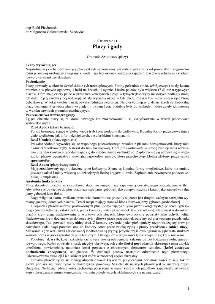 mgr Rafał Piechowski dr Małgorzata Gołembiewska-Skoczylas Ćwiczenie 11 Płazy i gady Gromada AMPHIBIA (płazy) Cechy wyróŜniające Najistotniejszą cechą odróŜniającą płazy od ryb są kończyny parzyste z palcami, a od pozostałych kręgowców róŜni je rozwój osobniczy związany z wodą: jaja bez osłonek zabezpieczających przed wysychaniem i stadium rozwojowe kijanki ze skrzelami. Pochodzenie Płazy powstały w okresie dewońskim z ryb trzonopłetwych. Formy pośrednie (m.in. Ichthyostega) miały kostne promienie w płetwie ogonowej i łuski na brzuchu i ogonie. Liczba palców była większa (7-8) niŜ u typowych płazów, które mają cztery palce w przednich kończynach a pięć w tylnych (kończyny niektórych podległy mniej lub dalej idącej ewolucyjnej redukcji). Miały wycięcia uszne w tyle dachu czaszki być moŜe mieszczące błonę bębenkową. W toku ewolucji następowała redukcja skostnień. Najpierwotniejsze z dzisiejszych są tropikalne płazy beznogie. Pierwotne płazy wyglądem i trybem Ŝycia podobne były do krokodyli, które zajęły ich miejsce w wyniku zawiłych przemian ewolucyjnych. Pokrewieństwa wewnątrz grupy śyjące obecnie płazy są reliktami dawnego ich zróŜnicowania i są klasyfikowane w trzech jednostkach systematycznych. Rząd Apoda (płazy beznogie) Formy beznogie, ryjące w glebie wiodą tryb Ŝycia podobny do dŜdŜownic. Kopalne formy przejściowe miały ciało wydłuŜone jak u form dzisiejszych, ale z krótkimi kończynami. Rząd Urodela (płazy ogoniaste) Prawdopodobnie wywodzą się ze wspólnego paleozoicznego przodka z płazami bezogonowymi, który miał dwuwierzchołkowe zęby. NaleŜał do linii rozwojowej, która juŜ ewoluowała w stronę zmniejszania rozmiarów i zaniku skostnień (upodabniając się do młodocianych osobników). Zapłodnienie jaj odbywa się u większości płazów ogoniastych wewnątrz jajowodów samicy, która przechwytuje kloaką złoŜony przez samca spermatofor. Rząd Anura (płazy bezogonowe) Mają zredukowany ogon i skoczne tylne kończyny. Znane są kopalne formy przejściowe, które nie umiały jeszcze skakać i miały większą od dzisiejszych liczbę kręgów tułowia. Zapłodnienie zewnętrzne podczas kopulacji (amplexus). Anatomia funkcjonalna Płuca dorosłych płazów są stosunkowo słabo rozwinięte i nie zapewniają dostatecznego zaopatrzenia w tlen. Aby wtłoczyć powietrze do płuc płazy uŜywają jamy gębowej jako pompy, nozdrzy i krtani jako zaworów, a dna jamy gębowej jako tłoka. Naga wilgotna skóra, zwilŜana przez wielokomórkowe gruczoły śluzowe jest drugim waŜnym narządem wymiany gazowej dorosłych płazów. Trzeci uzupełniający stanowi błona śluzowa jamy gębowo-gardzielowej. U kijanek i płazów wtórnie pozbawionych płuc (oddychających tylko przez skórę) występuje serce typu rybiego (stoŜek tętniczy, zatoka Ŝylna, jedna komora i jeden przedsionek tzw. skrzelowy). Natomiast u dorosłych płazów krew ulega natlenowaniu w workowatych płucach, które ewolucyjnie powstały jako uchyłki jelita. Natlenowana krew dociera więc do serca Ŝyłą jelitową przez przedsionek odrębny od pierwotnego przedsionka skrzelowego. Tak powstał mały obieg krwi. Z komory wychodzi jeden pień tętniczy rozprowadzający krew po narządach ciała, skąd powraca ona do komory serca przez zatokę Ŝylną i prawy przedsionek (obieg duŜy). Mieszanie się w sercu krwi natlenowanej z odtlenowaną (Ŝylną) jedynie częściowo ogranicza gąbczasta struktura komory oraz zastawka spiralna w pniu tętniczym. Dlatego teŜ w większości tętnic znajduje się krew mieszana. Podobnie jak u ryb, kości szkieletu zachowują pewną odmienność zaleŜnie od pochodzenia ewolucyjnego i rozwojowego. Kości powstałe z łusek niegdyś okrywających ciało (kości pochodzenia skórnego) mają zwykle urzeźbioną powierzchnię, natomiast kości powstałe z chrzęstnych elementów szkieletu (kości zastępcze pochodzenia chrzęstnego) są gładkie. W ewolucji płazów nastąpiło odwrócenie tego pierwotnego ukierunkowania ewolucji i ich szkielet jest znów w znacznej części chrzęstny. Czaszka płazów łączy się z kręgosłupem dwoma kłykciami potylicznymi bez moŜliwości rotacji, tak Ŝe głowa porusza się więc tylko w płaszczyźnie pionowej. Szkielet dzisiejszych płazów jest w znacznej części chrzęstny. Nieliczne jedynie kości zachowują połączenia szwami, które u ich przodków zapewniały sztywność konstrukcji czaszki mimo konieczności wzrostu pojedynczych, składających się na nią, części. 1 BezuŜyteczne w środowisku powietrznym narządy linii bocznej (nabocznej) zostały stopniowo zastąpione urządzeniem do identyfikacji drgań przenoszonych przez powietrze, czyli przez ucho. Drgania przenoszone są z rozpiętej na skórnych kościach dachu czaszki błony bębenkowej do ucha wewnętrznego za pośrednictwem kości łuku gnykowego łączącej się bezpośrednio z puszką mózgową. Ucho wewnętrzne, słuŜące rybom jedynie jako narząd równowagi (labirynt), rozbudowane zostało o dodatkowy kanał limfatyczny, który wspólnie z wcześniej istniejącym utworzył krótki u płazów ślimak (cochlea) wyścielony komórkami czuciowymi (narząd Cortiego). W odróŜnieniu od ryb pas barkowy nie ma bezpośredniego kontaktu z czaszką (ani szkieletem osiowym), zaś pas miednicowy związany jest z wyrostkiem poprzecznym jednego kręgu (a nie większej ich liczby, jak u pozostałych czworonogów). Autekologia Płazy to zwierzęta amfibiotyczne, które w stadium kijanki związane są z wodą zaś w stadium dorosłym Ŝyją głównie na lądzie. Przebieg ich procesów Ŝyciowych zaleŜy od temperatury środowiska. ZaleŜność od wilgotności powietrza i temperatury ogranicza ich występowanie do obszarów głównie stref tropikalnych i subtropikalnych. W strefie klimatu umiarkowanego Ŝyje niewiele gatunków, ale niektóre dostosowały się nawet do warunków wieczne