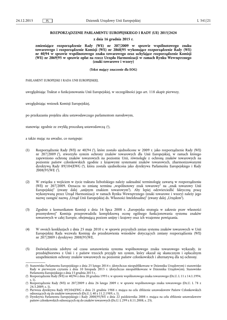 24.12.2015 Dziennik Urzędowy Unii Europejskiej PL L 341/21 ROZPORZĄDZENIE PARLAMENTU EUROPEJSKIEGO I RADY (UE) 2015/2424 z dnia 16 grudnia 2015 r. zmieniające rozporządzenie Rady (WE) nr 207/2009 w sprawie wspólnotowego znaku towarowego i rozporządzenie Komisji (WE) nr 2868/95 wykonujące rozporządzenie Rady (WE) nr 40/94 w sprawie wspólnotowego znaku towarowego oraz uchylające rozporządzenie Komisji (WE) nr 2869/95 w sprawie opłat na rzecz Urzędu Harmonizacji w ramach Rynku Wewnętrznego (znaki towarowe i wzory) (Tekst mający znaczenie dla EOG) PARLAMENT EUROPEJSKI I RADA UNII EUROPEJSKIEJ, uwzględniając Traktat o funkcjonowaniu Unii Europejskiej, w szczególności jego art. 118 akapit pierwszy, uwzględniając wniosek Komisji Europejskiej, po przekazaniu projektu aktu ustawodawczego parlamentom narodowym, stanowiąc zgodnie ze zwykłą procedurą ustawodawczą (1), a także mając na uwadze, co następuje: (1) Rozporządzenie Rady (WE) nr 40/94 (2), które zostało ujednolicone w 2009 r. jako rozporządzenie Rady (WE) nr 207/2009 (3), stworzyło system ochrony znaków towarowych dla Unii Europejskiej, w ramach którego zapewniono ochronę znaków towarowych na poziomie Unii, równolegle z ochroną znaków towarowych na poziomie państw członkowskich zgodnie z krajowymi systemami znaków towarowych, zharmonizowanymi dyrektywą Rady 89/104/EWG (4), która została ujednolicona jako dyrektywa Parlamentu Europejskiego i Rady 2008/95/WE (5). (2) W związku z wejściem w życie traktatu lizbońskiego należy uaktualnić terminologię zawartą w rozporządzeniu (WE) nr 207/2009. Oznacza to zmianę terminu „wspólnotowy znak towarowy” na „znak towarowy Unii Europejskiej” (zwany dalej „unijnym znakiem towarowym”). Aby lepiej odzwierciedlić faktyczną pracę wykonywaną przez Urząd Harmonizacji w ramach Rynku Wewnętrznego (znaki towarowe i wzory) należy jego nazwę zastąpić nazwą „Urząd Unii Europejskiej ds. Własności Intelektualnej” (zwany dalej „Urzędem”). (3) Zgodnie z komunikatem Komisji z dnia 16 lipca 2008 r. „Europejska strategia w zakresie praw własności przemysłowej” Komisja przeprowadziła kompleksową ocenę ogólnego funkcjonowania systemu znaków towarowych w całej Europie, obejmującą poziom unijny i krajowy oraz ich wzajemne powiązania. (4) W swoich konkluzjach z dnia 25 maja 2010 r. w sprawie przyszłych zmian systemu znaków towarowych w Unii Europejskiej Rada wezwała Komisję do przedstawienia wniosków dotyczących zmiany rozporządzenia (WE) nr 207/2009 i dyrektywy 2008/95/WE. (5) Doświadczenia zdobyte od czasu ustanowienia systemu wspólnotowego znaku towarowego wykazały, że przedsiębiorstwa z Unii i z państw trzecich przyjęły ten system, który okazał się skutecznym i opłacalnym uzupełnieniem ochrony znaków towarowych na poziomie państw członkowskich i alternatywą dla tej ochrony. (1) Stanowisko Parlamentu Europejskiego z dnia 25 lutego 2014 r. (dotychczas nieopublikowane w Dzienniku Urzędowym) i stanowisko Rady w pierwszym czytaniu z dnia 10 listopada 2015 r. (dotychczas nieopublikowane w Dzienniku Urzędowym). Stanowisko Parlamentu Europejskiego z dnia 15 grudnia 2015 r.. (2) Rozporządzenie Rady (WE) nr 40/94 z dnia 20 grudnia 1993 r. w sprawie wspólnotowego znaku towarowego (Dz.U. L 11 z 14.1.1994, s. 1). (3) Rozporządzenie Rady (WE) nr 207/2009 z dnia 26 lutego 2009 r. w sprawie wspólnotowego znaku towarowego (Dz.U. L 78 z 24.3.2009, s. 1). (4) Pierwsza dyrektywa Rady 89/104/EWG z dnia 21 grudnia 1988 r. mająca na celu zbliżenie ustawodawstw Państw Członkowskich odnoszących się do znaków towarowych (Dz.U. L 40 z 11.2.1989, s. 1). (5) Dyrektywa Parlamentu Europejskiego i Rady 2008/95/WE z dnia 22 października 2008 r. mająca na celu zbliżenie ustawodawstw państw członkowskich odnoszących się do znaków towarowych (Dz.U. L 299 z 8.11.2008, s. 25). L 341/22 PL Dziennik Urzędowy Unii Europejskiej 24.12.2015 (6) Krajowe znaki towarowe pozostają jednak nadal niezbędne dla przedsiębiorstw, które nie chcą chronić swoich znaków towarowych na poziomie Unii lub które nie są w stanie uzyskać ogólnounijnej ochrony, podczas gdy nie ma żadnych przeszkód dla objęcia ich ochroną krajową. Do każdej osoby ubiegającej się o ochronę znaku towarowego powinno należeć podjęcie decyzji o skorzystaniu tylko z ochrony krajowej w postaci znaku towarowego w jednym lub większej liczbie państw członkowskich, tylko z ochrony w postaci unijnego znaku towarowego bądź też o skorzystaniu z obydwu tych opcji. (7) Podczas gdy ocena ogólnego funkcjonowania systemu wspólnotowego znaku towarowego potwierdziła, że wiele aspektów tego systemu, w tym podstawowe zasady, na których jest on oparty, wytrzymało próbę czasu i nadal zaspokaja potrzeby i oczekiwania przedsiębiorców, Komisja stwierdziła w swoim komunikacie zatytułowanym „Jednolity rynek w obszarze praw własności intelektualnej” z dnia 24 maja 2011 r., że istnieje potrzeba modernizacji systemu znaków towarowych w Unii poprzez uczynienie go bardziej skutecznym, efektywnym i spójnym jako całość i poprzez dostosowanie go do ery internetu. (8) Równolegle z ulepszeniami i zmianami systemu unijnego znaku towarowego należy dokonać dalszej harmonizacji przepisów prawa i praktyk dotyczących krajowych znaków towarowych i dostosować je w odpowiednim zakresie do systemu unijnego znaku towarowego, by stworzyć – w miarę możliwości – jednakowe warunki rejestracji i ochrony znaków towarowych w całej Unii. (9) Aby umożliwić większą elastyczność przy jednoczesnym zapewnieniu większej pewności prawa w odniesieniu do sposobów przedstawiania znaków towarowych, wymóg graficznej przedstawialności powinien zostać usunięty z definicji unijnego znaku towarowego. Należy dopuścić możliwość przedstawiania oznaczenia w dowolnej stosownej formie, z wykorzystaniem ogólnie dostępnej techniki, a więc niekon
