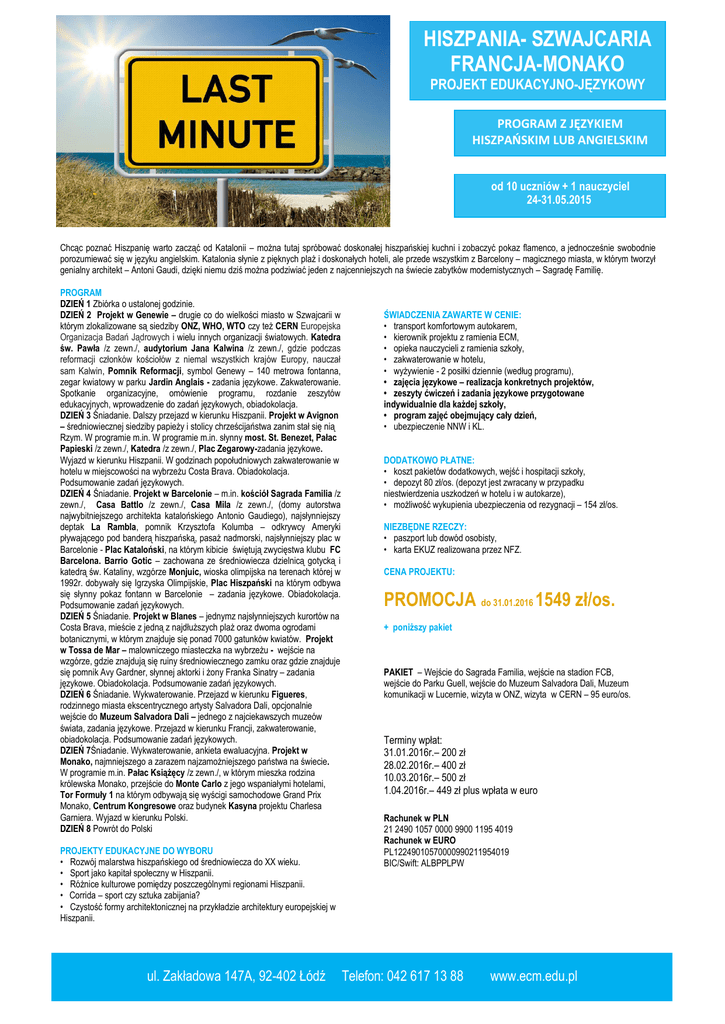 HISZPANIA- SZWAJCARIA FRANCJA-MONAKO PROJEKT EDUKACYJNO-JĘZYKOWY PROGRAM Z JĘZYKIEM HISZPAŃSKIM LUB ANGIELSKIM od 10 uczniów + 1 nauczyciel 24-31.05.2015 Chcąc poznać Hiszpanię warto zacząć od Katalonii – można tutaj spróbować doskonałej hiszpańskiej kuchni i zobaczyć pokaz flamenco, a jednocześnie swobodnie porozumiewać się w języku angielskim. Katalonia słynie z pięknych plaż i doskonałych hoteli, ale przede wszystkim z Barcelony – magicznego miasta, w którym tworzył genialny architekt – Antoni Gaudi, dzięki niemu dziś można podziwiać jeden z najcenniejszych na świecie zabytków modernistycznych – Sagradę Familię. PROGRAM DZIEŃ 1 Zbiórka o ustalonej godzinie. DZIEŃ 2 Projekt w Genewie – drugie co do wielkości miasto w Szwajcarii w którym zlokalizowane są siedziby ONZ, WHO, WTO czy też CERN Europejska Organizacja Badań Jądrowych i wielu innych organizacji światowych. Katedra św. Pawła /z zewn./, audytorium Jana Kalwina /z zewn./, gdzie podczas reformacji członków kościołów z niemal wszystkich krajów Europy, nauczał sam Kalwin, Pomnik Reformacji, symbol Genewy – 140 metrowa fontanna, zegar kwiatowy w parku Jardin Anglais - zadania językowe. Zakwaterowanie. Spotkanie organizacyjne, omówienie programu, rozdanie zeszytów edukacyjnych, wprowadzenie do zadań językowych, obiadokolacja. DZIEŃ 3 Śniadanie. Dalszy przejazd w kierunku Hiszpanii. Projekt w Avignon – średniowiecznej siedziby papieży i stolicy chrześcijaństwa zanim stał się nią Rzym. W programie m.in. W programie m.in. słynny most. St. Benezet, Pałac Papieski /z zewn./, Katedra /z zewn./, Plac Zegarowy-zadania językowe. Wyjazd w kierunku Hiszpanii. W godzinach popołudniowych zakwaterowanie w hotelu w miejscowości na wybrzeżu Costa Brava. Obiadokolacja. Podsumowanie zadań językowych. DZIEŃ 4 Śniadanie. Projekt w Barcelonie – m.in. kościół Sagrada Familia /z zewn./, Casa Battlo /z zewn./, Casa Mila /z zewn./, (domy autorstwa najwybitniejszego architekta katalońskiego Antonio Gaudiego), najsłynniejszy deptak La Rambla, pomnik Krzysztofa Kolumba – odkrywcy Ameryki pływającego pod banderą hiszpańską, pasaż nadmorski, najsłynniejszy plac w Barcelonie - Plac Kataloński, na którym kibicie świętują zwycięstwa klubu FC Barcelona. Barrio Gotic – zachowana ze średniowiecza dzielnicą gotycką i katedrą św. Kataliny, wzgórze Monjuic, wioska olimpijska na terenach której w 1992r. dobywały się Igrzyska Olimpijskie, Plac Hiszpański na którym odbywa się słynny pokaz fontann w Barcelonie – zadania językowe. Obiadokolacja. Podsumowanie zadań językowych. DZIEŃ 5 Śniadanie. Projekt w Blanes – jednymz najsłynniejszych kurortów na Costa Brava, mieście z jedną z najdłuższych plaż oraz dwoma ogrodami botanicznymi, w którym znajduje się ponad 7000 gatunków kwiatów. Projekt w Tossa de Mar – malowniczego miasteczka na wybrzeżu - wejście na wzgórze, gdzie znajdują się ruiny średniowiecznego zamku oraz gdzie znajduje się pomnik Avy Gardner, słynnej aktorki i żony Franka Sinatry – zadania językowe. Obiadokolacja. Podsumowanie zadań językowych. DZIEŃ 6 Śniadanie. Wykwaterowanie. Przejazd w kierunku Figueres, rodzinnego miasta ekscentrycznego artysty Salvadora Dali, opcjonalnie wejście do Muzeum Salvadora Dali – jednego z najciekawszych muzeów świata, zadania językowe. Przejazd w kierunku Francji, zakwaterowanie, obiadokolacja. Podsumowanie zadań językowych. DZIEŃ 7Śniadanie. Wykwaterowanie, ankieta ewaluacyjna. Projekt w Monako, najmniejszego a zarazem najzamożniejszego państwa na świecie. W programie m.in. Pałac Książęcy /z zewn./, w którym mieszka rodzina królewska Monako, przejście do Monte Carlo z jego wspaniałymi hotelami, Tor Formuły 1 na którym odbywają się wyścigi samochodowe Grand Prix Monako, Centrum Kongresowe oraz budynek Kasyna projektu Charlesa Garniera. Wyjazd w kierunku Polski. DZIEŃ 8 Powrót do Polski PROJEKTY EDUKACYJNE DO WYBORU • Rozwój malarstwa hiszpańskiego od średniowiecza do XX wieku. • Sport jako kapitał społeczny w Hiszpanii. • Różnice kulturowe pomiędzy poszczególnymi regionami Hiszpanii. • Corrida – sport czy sztuka zabijania? • Czystość formy architektonicznej na przykładzie architektury europejskiej w Hiszpanii. ul. Zakładowa 147A, 92-402 Łódź ŚWIADCZENIA ZAWARTE W CENIE: • transport komfortowym autokarem, • kierownik projektu z ramienia ECM, • opieka nauczycieli z ramienia szkoły, • zakwaterowanie w hotelu, • wyżywienie - 2 posiłki dziennie (według programu), • zajęcia językowe – realizacja konkretnych projektów, • zeszyty ćwiczeń i zadania językowe przygotowane indywidualnie dla każdej szkoły, • program zajęć obejmujący cały dzień, • ubezpieczenie NNW i KL. DODATKOWO PŁATNE: • koszt pakietów dodatkowych, wejść i hospitacji szkoły, • depozyt 80 zł/os. (depozyt jest zwracany w przypadku niestwierdzenia uszkodzeń w hotelu i w autokarze), • możliwość wykupienia ubezpieczenia od rezygnacji – 154 zł/os. NIEZBĘDNE RZECZY: • paszport lub dowód osobisty, • karta EKUZ realizowana przez NFZ. CENA PROJEKTU: PROMOCJA do 31.01.2016 1549 zł/os. + poniższy pakiet PAKIET – Wejście do Sagrada Familia, wejście na stadion FCB, wejście do Parku Guell, wejście do Muzeum Salvadora Dali, Muzeum komunikacji w Lucernie, wizyta w ONZ, wizyta w CERN – 95 euro/os. Terminy wpłat: 31.01.2016r.– 200 zł 28.02.2016r.– 400 zł 10.03.2016r.– 500 zł 1.04.2016r.– 449 zł plus wpłata w euro Rachunek w PLN 21 2490 1057 0000 9900 1195 4019 Rachunek w EURO PL12249010570000990211954019 BIC/Swift: ALBPPLPW Telefon: 042 617 13 88 www.ecm.edu.pl