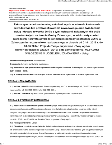 1z3 http://bzp1.portal.uzp.gov.pl/index.php?ogloszenie=show&pozycja=22... Ogłoszenie powiązane: Ogłoszenie nr 196352-2012 z dnia 2012-06-12 r. Ogłoszenie o zamówieniu - Zakroczym Przedmiotem zamówienia jest świadczenie usług szkoleniowych w zakresie kształcenia zawodowego lub przekwalifikowania zawodowego oraz świadczenie usług i dostaw towarów ściśle z tymi usługami związanych dla osób zamieszkałych na... Termin składania ofert: 2012-06-20 Zakroczym: wiadczenie usług szkoleniowych w zakresie kształcenia zawodowego lub przekwalifikowania zawodowego oraz świadczenie usług i dostaw towarów ściśle z tymi usługami związanych dla osób zamieszkałych na terenie Gminy Zakroczym, w wieku aktywności zawodowej korzystających ze świadczeń pomocy społecznej GOPS w Zakroczymiu - uczestników realizowanego w okresie od 01.01.2012 r. do 30.06.2014r. Projektu Twoja przyszłość - Twój wybór Numer ogłoszenia: 229208 - 2012; data zamieszczenia: 02.07.2012 OGŁOSZENIE O UDZIELENIU ZAMÓWIENIA - Usługi Zamieszczanie ogłoszenia: obowiązkowe. Ogłoszenie dotyczy: zamówienia publicznego. Czy zamówienie było przedmiotem ogłoszenia w Biuletynie Zamówień Publicznych: tak, numer ogłoszenia w BZP: 196352 - 2012r. Czy w Biuletynie Zamówień Publicznych zostało zamieszczone ogłoszenie o zmianie ogłoszenia: tak. SEKCJA I: ZAMAWIAJĄCY I. 1) NAZWA I ADRES: Gminny Ośrodek Pomocy Społecznej, ul. O.H. Koźmińskiego 15, 05-170 Zakroczym, woj. mazowieckie, tel. 0-22 785 22 99, faks 0-22 785 35 04. I. 2) RODZAJ ZAMAWIAJĄCEGO: Inny: gminna samorządowa jednostka organziacyjna. SEKCJA II: PRZEDMIOT ZAMÓWIENIA II.1) Nazwa nadana zamówieniu przez zamawiającego: wiadczenie usług szkoleniowych w zakresie kształcenia zawodowego lub przekwalifikowania zawodowego oraz świadczenie usług i dostaw towarów ściśle z tymi usługami związanych dla osób zamieszkałych na terenie Gminy Zakroczym, w wieku aktywności zawodowej korzystających ze świadczeń pomocy społecznej GOPS w Zakroczymiu - uczestników realizowanego w okresie od 01.01.2012 r. do 30.06.2014r. Projektu Twoja przyszłość - Twój wybór. II.2) Rodzaj zamówienia: Usługi. II.3) Określenie przedmiotu zamówienia: świadczenie usług szkoleniowych w zakresie kształcenia zawodowego lub przekwalifikowania zawodowego oraz świadczenie usług i dostaw towarów ściśle z tymi usługami związanych dla osób zamieszkałych na terenie Gminy Zakroczym, w wieku aktywności zawodowej korzystających ze świadczeń pomocy społecznej GOPS w Zakroczymiu - uczestników realizowanego w okresie od 01.01.2012 r. do 2012-07-02 13:27 2z3 http://bzp1.portal.uzp.gov.pl/index.php?ogloszenie=show&pozycja=22... 30.06.2014r. Projektu Twoja przyszłość - Twój wybór współfinansowanego ze środków Unii Europejskiej w ramach Europejskiego Funduszu Społecznego w ramach Poddziałania 7.1.1 POKL, Rozwój i upowszechnianie aktywnej integracji przez ośrodki pomocy społecznej ( dalej Projekt) . Uczestnikami Projektu jest : w roku 2012 12 osób; w roku 2013- 12 osób ,; w roku 2014- 10 osób (osoby niepełnosprawne). W ramach przedmiotu zamówienia wykonawca zobowiązuje się do: a) przygotowania szczegółowego programu, planu i harmonogramu oraz materiałów szkoleniowych i dydaktycznych, w tym materiały pomocnicze i piśmienne (notatnik, długopis, teczka) i wydanie każdemu z uczestników Projektu w latach 2012-2014 zeszytu, teczki, długopisu oraz materiałów z każdego warsztatu, b) realizacji poszczególnych zadań, w tym szkoleń, kursów i doradztwa przez wykwalifikowaną kadrę dydaktyczną i specjalistów w danej dziedzinie, z uwzględnieniem specyfiki osób szkolonych c) koordynacji oraz nadzoru merytorycznego i metodycznego nad realizowanymi zadaniami, d) bieżącej współpracy z Zamawiającym w zakresie związanym z realizacją zamówienia, e) prowadzenia dokumentacji związanej z realizacją zamówienia, w tym dokumentacji szkoleń, kursów, doradztwa, ściśle wg wytycznych Zamawiającego, f) zapewnienia sal szkoleniowych dla potrzeb realizowanych szkoleń, kursów i doradztwa, zlokalizowanych w Zakroczymiu, odpowiednich dla pomieszczenia wszystkich uczestników w ilości odpowiadającej liczbie osób uczestniczących w Projekcie w danym roku w okresie 2012-2014, g) organizacji w 2014r. wyjazdu edukacyjno - leczniczego dla osób niepełnosprawnych i opiekunów, połączonego z warsztatami, w tym zapewnienie transportu, zakwaterowanie w ośrodku rehabilitacyjno - wypoczynkowym, pełne całodzienne wyżywienie dla wszystkich uczestników, organizacja warsztatów podczas wyjazdu, organizacja czasu wolnego podczas wyjazdu ( w tym mion. 3 zabiegi rehabilitacyjne dla uczestników), zapewnienie opiekuna wjazdu , h) zapewnienia i udostępnienia sprzętu dydaktycznego do prowadzenia zajęć, w tym w szczególności: rzutnik multimedialny - minimum 1 sztuka, flipchart- minimum 1 sztuka, i) zapewnienia materiałów szkoleniowych, dydaktycznych, pomocniczych i piśmiennych dla wszystkich uczestników szkoleń, kursów i warsztatów, w ilości odpowiadającej liczbie osób uczestniczących w Projekcie w danym roku w okresie 2012-2014, j) zapewnienia wyżywienia w formie cateringu - obiady, przerwy kawowe tj. w formie przerwy kawowej (kawa, herbata, dodatki, ciastka) dla wszystkich w danym roku realizowania usługi uczestników szkoleń, kursów i warsztatów w każdym dniu prowadzenia zajęć oraz w przypadku obiadów obowiązek zapewnienia dotyczy wszystkich dni szkoleniowych z zajęciami 6 godzinnymi oraz wycieczek, k) zapewnienia ubezpieczenia NNW dla wszystkich uczestników szkoleń, kursów i warsztatów w ilości odpowiadającej liczbie uczestników w danym roku realizowania Projektu w okresie 2012-2014; l) wydania uczestnikom szkoleń, kursów i warsztatów świadectw końcowych na zakończenie udziału w szkoleniach, kursach, warsztatach, m) stosowania odpowiednich działań informacyjnych i promocyjnych zgodnie z 