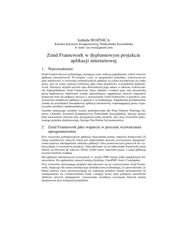 Izabela WOŹNICA Katedra Inżynierii Komputerowej, Politechnika Koszalińska E–mail: [email protected] Zend Framework w dyplomowym projekcie aplikacji internetowej 1. Wprowadzenie Zend Framework jest technologią zyskującą coraz większą popularność wśród twórców aplikacji internetowych. W związku z tym, że programiści potrafiący wykorzystywać jego możliwości w tworzeniu rozbudowanych aplikacji są często poszukiwani na rynku pracy, jest on coraz częściej wybierany jako rama projektowa w projektach dyplomowych. Niniejszy artykuł zawiera opis doświadczeń jego autora w zakresie wykorzystania funkcjonalności Zend Framework, które zdobyto w trakcie prac nad inżynierską pracą dyplomową. Omówione zostały najważniejsze zagadnienia, których znajomość konieczna była do podjęcia decyzji o zastosowaniu Zend Framework w projekcie oraz stworzenia modułowej aplikacji w oparciu o tę technologię. Zagadnienia przedstawione zostały na przykładzie bazodanowej aplikacji internetowej wspomagającej pracę wypożyczalni nośników multimedialnych. Autorka niniejszego artykułu wyraża podziękowania dla Pana Doktora Walerego Susłowa z Katedry Inżynierii Komputerowej Politechniki Koszalińskiej, którego pomoc była nieoceniona zarówno przy przygotowywaniu artykułu, jak i przy tworzeniu opisywanego projektu dyplomowego, którego Pan Doktor był promotorem. 2. Zend Framework jako wsparcie w procesie wytwarzania oprogramowania Przy tworzeniu rozbudowanych aplikacji nieocenioną pomoc stanowią frameworki [2] (ramy projektowe), których celem jest usprawnienie procesu wytwarzania oprogramowania poprzez udostępnienie szkieletu aplikacji i klas pomocniczych gotowych do wykorzystania w tworzonym projekcie. Zdecydowanie się na odpowiedni framework może okazać się kluczem do sukcesu. Dobry wybór może usprawnić pracę, a samą aplikację uczynić bardziej wydajną. Dla aplikacji internetowych tworzonych w języku PHP istnieje kilka popularnych frameworków. Do najbardziej znanych należą Symfony, CakePHP, Zend i CodeIgniter. Przy tworzeniu omawianego projektu zdecydowano się na wykorzystanie Zend Framework, będącego dla autora nieniejszego artykułu nową technologią, co spowodowało, że blisko połowa czasu przeznaczonego na realizację projektu została przeznaczona na zaznajomienie się z frameworkiem Zend, z drugiej strony takie podejście umożliwiło zdobycie nowych umiejętności i poszerzenie wachlarza rozwiązań, którymi można dysponować przy kolejnych projektach. 176 Izabela Woźnica Decyzja o wyborze Zend Framework jako ramy projektowej w projekcie została podjęta, po przeanalizowaniu opinii o nim dostępnych zarówno w literaturze jak i na forach internetowych. Powody, dla których zdecydowano się na zastosowanie frameworka Zend, to: • • • • Duża swoboda pozostawiona programiście. Tak samo jak inne ramy projektowe dla języka PHP, Zend automatyzuje i usprawnia prace programistyczne. Wyróżnia go fakt, że jest on nie tyle w pełni gotową strukturą aplikacji, co zestawem powiązanych i świetnie współpracujących ze sobą klas. Ponadto powiązanie klas jest na tyle elastyczne, że pozostawia programiście dużą swobodę w wyborze gotowych rozwiązań, które można zastosować w projekcie. w zależności od punktu widzenia ta cecha może stanowić zarówno zaletę jak i wadę Zend Framework – z jednej strony pozostawiając duży wybór użytkownikowi stanowi on framework bardzo elastyczny, z drugiej natomiast skonfigurowanie fundamentów tworzonego systemu wymaga większego nakładu pracy i czasu. Usprawnienie procesu tworzenia aplikacji. Faktem jest, że poznanie Zend Framework może okazać się czasochłonne, jednak rozwiązania, które niesie on za sobą, w znaczący sposób mogą zwiększyć funkcjonalność tworzonej aplikacji i usprawnić sam proces jej tworzenia. Stosunkowo łatwy sposób wdrożenia wzorca MVC (Model – View – Controler) w tworzonych aplikacjach [1]. Interfejs komunikacji pomiędzy elementami poszczególnych warstw zapewnia sam framework. Do projektantów i programistów należy natomiast uzupełnienie powstałej struktury systemu dostosowaną do konkretnego projektu logiką biznesową, opracowanie sposobu zachowania aplikacji oraz stworzenie odpowiednich widoków i bibliotek pomocniczych. Pozostałe cechy frameworka takie jak: dobrze przetestowana baza kodu, obsługa technologii takich jak Ajax, wsparcie dla usług sieciowych (web services), czy bardzo rozbudowana baza ciągle rozwijanych komponentów [2]. Dzięki wspomnianym rozwiązaniom możliwości Zend Framework stają się jeszcze większe. Wspomniane cechy Zend Framework są źródłem wielu dyskusji odbywających się na forach internetowych pomiędzy projektantami aplikacji internetowych na temat tego, kiedy warto stosować framework Zend [4]. Uwzględniając doświadczenia nabyte w trakcie realizacji omawianego projektu, można uznać Zend Framework za dobre rozwiązanie, jeżeli ważna jest duża dowolność w wyborze modułów i klas, które zostaną wykorzystane w projekcie oraz kontrola nad tworzoną aplikacją, natomiast priorytetem nie jest jak najkrótszy czas ukończenia projektu. 3. Początki pracy z frameworkiem Zend Jeżeli nie posiada się wcześniejszego doświadczenia w tworzeniu aplikacji internetowych z wykorzystaniem Zend Framework, opanowanie umiejętności pracy z tą technologią oraz stworzenie fundamentów aplikacji dostosowanych do potrzeb tworzonego systemu może być procesem czasochłonnym. w przypadku omawianego projektu czynności te pochłonęły blisko 50% czasu przeznaczonego na realizację tematu pracy dyplomowej. Zend Framework w dyplomowym projekcie aplikacji internetowej 177 Aby korzystać z Zend Framework, należało stworzyć samodzielnie strukturę katalogów projektu lub wykorzystać do tego celu dostarczone przez twórców frameworka narzędzie Zend Tool. Drugie rozwiązanie uznano za bardzo przy