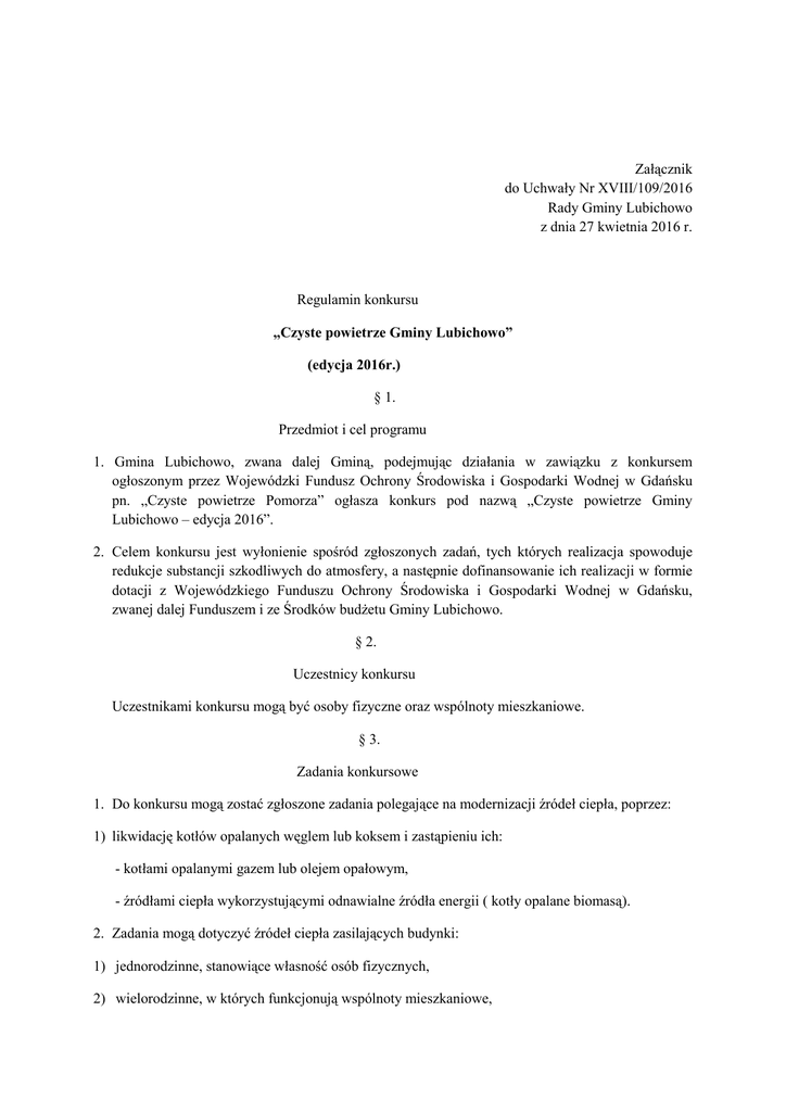 Załącznik do Uchwały Nr XVIII/109/2016 Rady Gminy Lubichowo z dnia 27 kwietnia 2016 r. Regulamin konkursu „Czyste powietrze Gminy Lubichowo” (edycja 2016r.) § 1. Przedmiot i cel programu 1. Gmina Lubichowo, zwana dalej Gminą, podejmując działania w zawiązku z konkursem ogłoszonym przez Wojewódzki Fundusz Ochrony Środowiska i Gospodarki Wodnej w Gdańsku pn. „Czyste powietrze Pomorza” ogłasza konkurs pod nazwą „Czyste powietrze Gminy Lubichowo – edycja 2016”. 2. Celem konkursu jest wyłonienie spośród zgłoszonych zadań, tych których realizacja spowoduje redukcje substancji szkodliwych do atmosfery, a następnie dofinansowanie ich realizacji w formie dotacji z Wojewódzkiego Funduszu Ochrony Środowiska i Gospodarki Wodnej w Gdańsku, zwanej dalej Funduszem i ze Środków budżetu Gminy Lubichowo. § 2. Uczestnicy konkursu Uczestnikami konkursu mogą być osoby fizyczne oraz wspólnoty mieszkaniowe. § 3. Zadania konkursowe 1. Do konkursu mogą zostać zgłoszone zadania polegające na modernizacji źródeł ciepła, poprzez: 1) likwidację kotłów opalanych węglem lub koksem i zastąpieniu ich: - kotłami opalanymi gazem lub olejem opałowym, - źródłami ciepła wykorzystującymi odnawialne źródła energii ( kotły opalane biomasą). 2. Zadania mogą dotyczyć źródeł ciepła zasilających budynki: 1) jednorodzinne, stanowiące własność osób fizycznych, 2) wielorodzinne, w których funkcjonują wspólnoty mieszkaniowe, 3) wielorodzinne, stanowiące własność Gminy. 3. Do konkursu mogą być zgłaszane tylko zadania nierozpoczęte, dla których została wykonana dokumentacja fotograficzna stanu istniejącego, przedstawiająca źródło ciepła przed modernizacją. § 4. Ogłoszenie konkursu, terminy 1. Wójt Gminy ogłoszenie o przeprowadzeniu konkursu umieszcza się na stronie internetowej Gminy pod adresem www.bip.lubichowo.pl. 2. Ogłoszenie zawiera: obowiązujący termin składania wniosków, wzór wniosku wraz z wymaganymi załącznikami i Regulaminem konkursu. 3. Gmina zastrzega sobie prawo do unieważnienia konkursu z przyczyn od niej niezależnych, poprzez ogłoszenie na stronie www.bip.lubichowo.pl komunikatu o unieważnieniu. 4. W przypadku nieuzyskania przez Gminę dofinansowania w ramach konkursu ogłoszonego przez Fundusz pn.”Czyste powietrze Pomorza”, zasady konkursu ulegają zmianie, w części odnoszącej się do dofinansowania ze środków budżetu Gminy będzie realizowana, zgodnie z § 7 ust. 5. 5. W przypadku niewyczerpania środków finansowych przeznaczonych na udzielenie dotacji Wójt Gminy może przeprowadzić konkurs uzupełniający. § 5. Forma zgłoszenia 1. Osoba ubiegające się o dofinansowanie zadań, o których mowa w § 3 winny złożyć wniosek w Urzędzie Gminy Lubichowo, w terminie określonym w ogłoszeniu o przeprowadzeniu konkursu. Za termin złożenia wniosku uznaje się datę wpływu wniosku do Urzędu. 2. Wniosek należy złożyć w formie pisemnej wraz z wymaganymi załącznikami. Formularz wniosku stanowi załącznik nr 1 do niniejszego Regulaminu. 3. Wnioski, złożone po obowiązującym terminie składania wniosków, pozostawione zostaną bez rozpatrzenia. 4. Wnioski niekompletne będą pozostawione bez rozpatrzenia. 5. Wnioski dotyczące zadań realizowanych przed terminem ogłoszenia konkursu, pozostawione zostaną bez rozpatrzenia. 6. Kompletne wnioski, właściwie wypełnione i zawierające niezbędne załączniki będą rozpatrywane według kolejności określonej w § 6. § 6. Kryteria wyboru zadań 1. Wnioski oceniane są przez komisję oceniającą, z uwzględnieniem wymogów niniejszego Regulaminu, stosując zasady określone przez Wojewódzki Fundusz Ochrony Środowiska i Gospodarki Wodnej w Gdańsku, dla konkursu „Czyste powietrze Pomorza (edycja 2016)”. 2. W przypadku gdy kwota przeznaczona na udzielenie dotacji nie jest wystarczająca z uwagi na zbyt dużą ilość złożonych wniosków o przyznanie dotacji, o przyznaniu dotacji w pierwszej kolejności będzie decydował planowany efekt ekologiczny wyrażony w redukcji emisji zanieczyszczeń (mg/rok), a następnie daty wpływu kompletnego wniosku do Urzędu Gminy Lubichowo. 3. W przypadku rezygnacji osoby ubiegającej się o dofinansowanie zadania, zakwalifikowanego do udzielenia dotacji, dotacja może zostać przyznana kolejnej osobie spełniającej warunki udzielenia dotacji. § 7. Zasady dofinansowania zadań 1. Kwota dotacji ze środków Funduszu dla danego źródła ciepła, wynosi nie więcej niż 30% kosztów kwalifikowanych jego modernizacji i uzależniona jest od rodzaju paliwa zastosowanego w miejsce węgla lub koksu. W zależności od przyjętego rozwiązania dotacja ze środków Funduszu wynosi nie więcej niż: 1) kotły opalane gazem, olejem opałowym lub biomasą: a) 5 000 zł na jedno źródło ciepła zasilające pojedynczego odbiorcę, b) 12 500 zł w przypadku kotłowni zasilającej budynek wielorodzinny. 2. Łączna kwota dofinansowania o jaką może wnioskować Gmina ze środków Funduszu na realizację zadań zgłoszonych w ramach niniejszego konkursu, nie może przekroczyć kwoty 300 000 zł. 3. Kwota dotacji ze środków budżetu Gminy wynosić będzie 5% kosztów kwalifikowanych jego modernizacji wynikających z przedstawionych rachunków i faktur dokumentujących wysokość kosztów kwalifikowanych, jednak nie więcej niż 600 zł. 4. Ostateczna kwota dofinansowania jest zależna od poziomu dofinansowania uzyskanego przez Gminę w ramach konkursu ogłoszonego przez Fundusz. 5. W przypadku odmowy udzielenia dotacji przez Fundusz dotacje będą udzielane ze środków budżetu Gminy w wysokości 5% kosztów kwalifikowanych, jednak nie więcej niż 600 zł. dla danego źródła ciepła, z uwzględnieniem wysokości środków zabezpieczonych na ten cel w budżecie Gminy. 6. Do wniosku muszą być dołączone następujące dokumenty: 1) kopia aktualnego dokumentu potwierdzającego tytuł prawny do budynku lub