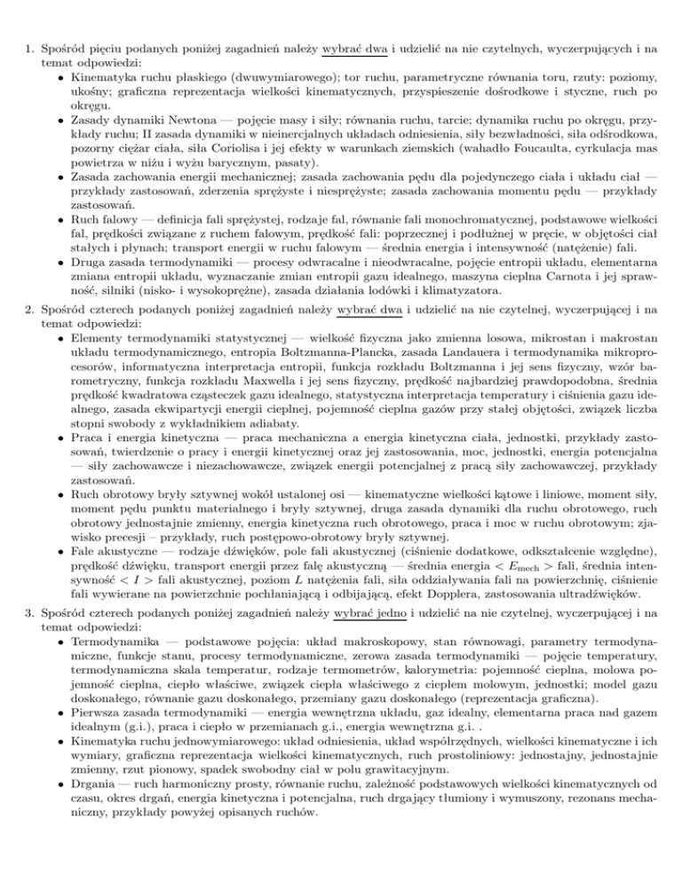 1. Spośród pięciu podanych poniżej zagadnień należy wybrać dwa i udzielić na nie czytelnych, wyczerpujących i na temat odpowiedzi: • Kinematyka ruchu płaskiego (dwuwymiarowego); tor ruchu, parametryczne równania toru, rzuty: poziomy, ukośny; graficzna reprezentacja wielkości kinematycznych, przyspieszenie dośrodkowe i styczne, ruch po okręgu. • Zasady dynamiki Newtona — pojęcie masy i siły; równania ruchu, tarcie; dynamika ruchu po okręgu, przykłady ruchu; II zasada dynamiki w nieinercjalnych układach odniesienia, siły bezwładności, siła odśrodkowa, pozorny ciężar ciała, siła Coriolisa i jej efekty w warunkach ziemskich (wahadło Foucaulta, cyrkulacja mas powietrza w niżu i wyżu barycznym, pasaty). • Zasada zachowania energii mechanicznej; zasada zachowania pędu dla pojedynczego ciała i układu ciał — przykłady zastosowań, zderzenia sprężyste i niesprężyste; zasada zachowania momentu pędu — przykłady zastosowań. • Ruch falowy — definicja fali sprężystej, rodzaje fal, równanie fali monochromatycznej, podstawowe wielkości fal, prędkości związane z ruchem falowym, prędkość fali: poprzecznej i podłużnej w pręcie, w objętości ciał stałych i płynach; transport energii w ruchu falowym — średnia energia i intensywność (natężenie) fali. • Druga zasada termodynamiki — procesy odwracalne i nieodwracalne, pojęcie entropii układu, elementarna zmiana entropii układu, wyznaczanie zmian entropii gazu idealnego, maszyna cieplna Carnota i jej sprawność, silniki (nisko- i wysokoprężne), zasada działania lodówki i klimatyzatora. 2. Spośród czterech podanych poniżej zagadnień należy wybrać dwa i udzielić na nie czytelnej, wyczerpującej i na temat odpowiedzi: • Elementy termodynamiki statystycznej — wielkość fizyczna jako zmienna losowa, mikrostan i makrostan układu termodynamicznego, entropia Boltzmanna-Plancka, zasada Landauera i termodynamika mikroprocesorów, informatyczna interpretacja entropii, funkcja rozkładu Boltzmanna i jej sens fizyczny, wzór barometryczny, funkcja rozkładu Maxwella i jej sens fizyczny, prędkość najbardziej prawdopodobna, średnia prędkość kwadratowa cząsteczek gazu idealnego, statystyczna interpretacja temperatury i ciśnienia gazu idealnego, zasada ekwipartycji energii cieplnej, pojemność cieplna gazów przy stałej objętości, związek liczba stopni swobody z wykładnikiem adiabaty. • Praca i energia kinetyczna — praca mechaniczna a energia kinetyczna ciała, jednostki, przykłady zastosowań, twierdzenie o pracy i energii kinetycznej oraz jej zastosowania, moc, jednostki, energia potencjalna — siły zachowawcze i niezachowawcze, związek energii potencjalnej z pracą siły zachowawczej, przykłady zastosowań. • Ruch obrotowy bryły sztywnej wokół ustalonej osi — kinematyczne wielkości kątowe i liniowe, moment siły, moment pędu punktu materialnego i bryły sztywnej, druga zasada dynamiki dla ruchu obrotowego, ruch obrotowy jednostajnie zmienny, energia kinetyczna ruch obrotowego, praca i moc w ruchu obrotowym; zjawisko precesji – przykłady, ruch postępowo-obrotowy bryły sztywnej. • Fale akustyczne — rodzaje dźwięków, pole fali akustycznej (ciśnienie dodatkowe, odkształcenie względne), prędkość dźwięku, transport energii przez falę akustyczną — średnia energia < Emech > fali, średnia intensywność < I > fali akustycznej, poziom L natężenia fali, siła oddziaływania fali na powierzchnię, ciśnienie fali wywierane na powierzchnie pochłaniającą i odbijającą, efekt Dopplera, zastosowania ultradźwięków. 3. Spośród czterech podanych poniżej zagadnień należy wybrać jedno i udzielić na nie czytelnej, wyczerpującej i na temat odpowiedzi: • Termodynamika — podstawowe pojęcia: układ makroskopowy, stan równowagi, parametry termodynamiczne, funkcje stanu, procesy termodynamiczne, zerowa zasada termodynamiki — pojęcie temperatury, termodynamiczna skala temperatur, rodzaje termometrów, kalorymetria: pojemność cieplna, molowa pojemność cieplna, ciepło właściwe, związek ciepła właściwego z ciepłem molowym, jednostki; model gazu doskonałego, równanie gazu doskonałego, przemiany gazu doskonałego (reprezentacja graficzna). • Pierwsza zasada termodynamiki — energia wewnętrzna układu, gaz idealny, elementarna praca nad gazem idealnym (g.i.), praca i ciepło w przemianach g.i., energia wewnętrzna g.i. . • Kinematyka ruchu jednowymiarowego: układ odniesienia, układ współrzędnych, wielkości kinematyczne i ich wymiary, graficzna reprezentacja wielkości kinematycznych, ruch prostoliniowy: jednostajny, jednostajnie zmienny, rzut pionowy, spadek swobodny ciał w polu grawitacyjnym. • Drgania — ruch harmoniczny prosty, równanie ruchu, zależność podstawowych wielkości kinematycznych od czasu, okres drgań, energia kinetyczna i potencjalna, ruch drgający tłumiony i wymuszony, rezonans mechaniczny, przykłady powyżej opisanych ruchów.