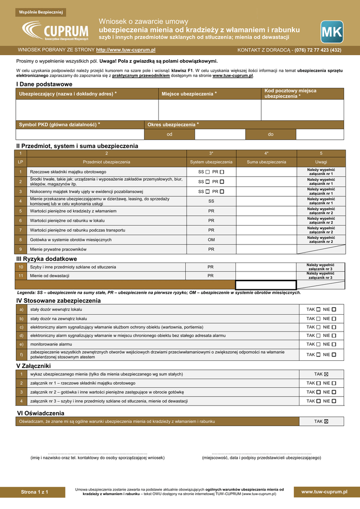 Wniosek o zawarcie umowy ubezpieczenia mienia od kradzieży z włamaniem i rabunku MK szyb i innych przedmiotów szklanych od stłuczenia; mienia od dewastacji KONTAKT Z DORADCĄ - (076) 72 77 423 (432) WNIOSEK POBRANY ZE STRONY http://www.tuw-cuprum.pl Prosimy o wypełnienie wszystkich pól. Uwaga! Pola z gwiazdką są polami obowiązkowymi. W celu uzyskania podpowiedzi należy przejść kursorem na szare pole i wcisnąć klawisz F1. W celu uzyskania większej ilości informacji na temat ubezpieczenia sprzętu elektronicznego zapraszamy do zapoznania się z praktycznym przewodnikiem dostępnym na stronie www.tuw-cuprum.pl. I Dane podstawowe Ubezpieczający (nazwa i dokładny adres) * Symbol PKD (główna działalność) * Miejsce ubezpieczenia * Kod pocztowy miejsca ubezpieczenia * Okres ubezpieczenia * od do II Przedmiot, system i suma ubezpieczenia 1 2 3* 4* 5 LP Przedmiot ubezpieczenia System ubezpieczenia Suma ubezpieczenia Uwagi 1 Rzeczowe składniki majątku obrotowego SS PR Należy wypełnić załącznik nr 1 2 Środki trwałe, takie jak: urządzenia i wyposażenie zakładów przemysłowych, biur, sklepów, magazynów itp. SS PR Należy wypełnić załącznik nr 1 3 Niskocenny majątek trwały ujęty w ewidencji pozabilansowej SS PR Należy wypełnić załącznik nr 1 4 Mienie przekazane ubezpieczającemu w dzierżawę, leasing, do sprzedaży komisowej lub w celu wykonania usługi SS 5 Wartości pieniężne od kradzieży z włamaniem PR 6 Wartości pieniężne od rabunku w lokalu PR 7 Wartości pieniężne od rabunku podczas transportu PR 8 Gotówka w systemie obrotów miesięcznych OM 9 Mienie prywatne pracowników PR Należy wypełnić załącznik nr 1 Należy wypełnić załącznik nr 2 Należy wypełnić załącznik nr 2 Należy wypełnić załącznik nr 2 Należy wypełnić załącznik nr 2 III Ryzyka dodatkowe 10 Szyby i inne przedmioty szklane od stłuczenia PR 11 Mienie od dewastacji PR Należy wypełnić załącznik nr 3 Należy wypełnić załącznik nr 3 Legenda: SS – ubezpieczenie na sumy stałe, PR – ubezpieczenie na pierwsze ryzyko; OM – ubezpieczenie w systemie obrotów miesięcznych. IV Stosowane zabezpieczenia a) stały dozór wewnątrz lokalu TAK NIE b) stały dozór na zewnątrz lokalu TAK NIE c) elektroniczny alarm sygnalizujący włamanie służbom ochrony obiektu (wartownia, portiernia) TAK NIE d) elektroniczny alarm sygnalizujący włamanie w miejscu chronionego obiektu bez stałego adresata alarmu TAK NIE e) monitorowanie alarmu TAK NIE f) zabezpieczenie wszystkich zewnętrznych otworów wejściowych drzwiami przeciwwłamaniowymi o zwiększonej odporności na włamanie potwierdzonej stosownym atestem TAK NIE V Załączniki 1 wykaz ubezpieczanego mienia (tylko dla mienia ubezpieczanego wg sum stałych) 2 załącznik nr 1 – rzeczowe składniki majątku obrotowego TAK NIE 3 załącznik nr 2 – gotówka i inne wartości pieniężne zastępujące w obrocie gotówkę TAK NIE 4 załącznik nr 3 – szyby i inne przedmioty szklane od stłuczenia, mienie od dewastacji TAK NIE TAK VI Oświadczenia Oświadczam, że znane mi są ogólne warunki ubezpieczenia mienia od kradzieży z włamaniem i rabunku …………………………………………………………….. (imię i nazwisko oraz tel. kontaktowy do osoby sporządzającej wniosek) Strona 1 z 1 TAK …………………………………………………………….. (miejscowość, data i podpisy przedstawicieli ubezpieczającego) Umowa ubezpieczenia zostanie zawarta na podstawie aktualnie obowiązujących ogólnych warunków ubezpieczenia mienia od kradzieży z włamaniem i rabunku – tekst OWU dostępny na stronie internetowej TUW-CUPRUM (www.tuw-cuprum.pl) www.tuw-cuprum.pl