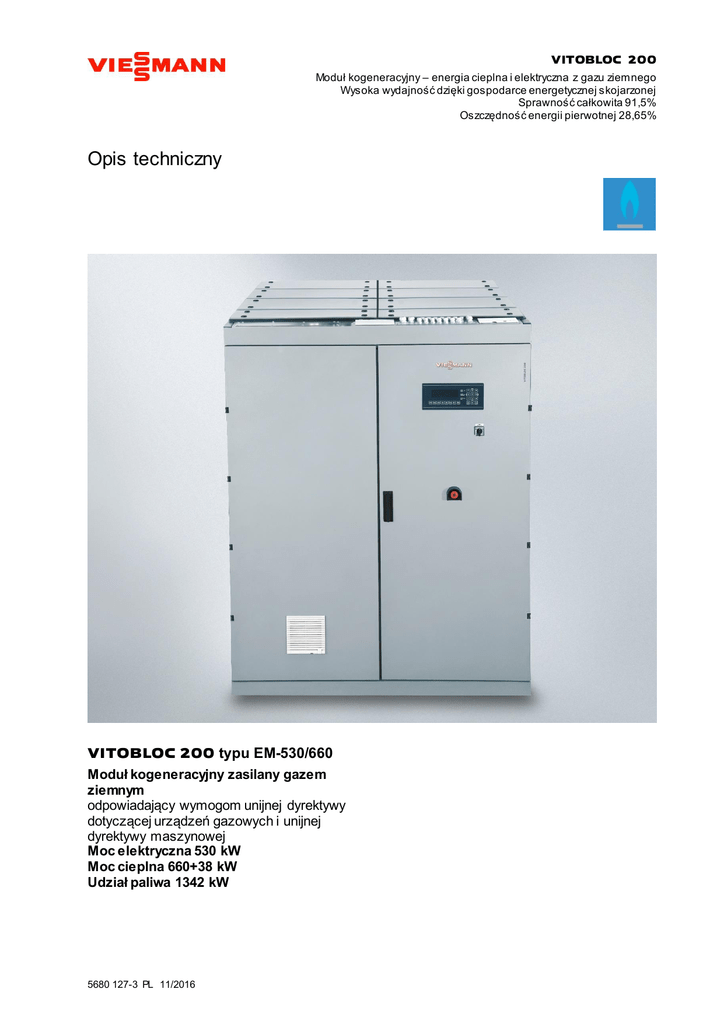 VITOBLOC 200 Moduł kogeneracyjny – energia cieplna i elektryczna z gazu ziemnego Wysoka wydajność dzięki gospodarce energetycznej skojarzonej Sprawność całkowita 91,5% Oszczędność energii pierwotnej 28,65% Opis techniczny VITOBLOC 200 typu EM-530/660 Moduł kogeneracyjny zasilany gazem ziemnym odpowiadający wymogom unijnej dyrektywy dotyczącej urządzeń gazowych i unijnej dyrektywy maszynowej Moc elektryczna 530 kW Moc cieplna 660+38 kW Udział paliwa 1342 kW 5680 127-3 PL 11/2016 Stopka redakcyjna Urządzenie s pełnia podstawowe wymogi zawarte we właściwych normach, wytycznych i dyrektywach. Zgodność została wykazana. Odpowiednie dokumenty i oryginał deklaracji zgodności znajdują się u producenta. WSKAZÓWKA! Moduł kogeneracyjny Vitobloc 200 nie nadaje się do eksploatacji przy częstotliwości napięcia 60 Hz. Tym samym nie jest on dostępny na rynku amerykańskim i kanadyjskim. Ważne ogólne wskazówki dotyczące użytkowania Przedstawienie wskazówek Urządzenie techniczne użytkować wyłącznie zgodnie z przeznaczeniem i przestrzegając instrukcji montażu, obsługi i serwisu. Konserwację i naprawę mogą przeprowadzać tylko upoważnieni pracownicy specjalistyczni. Urządzenie techniczne eksploatować wyłącznie w konfiguracjach z wyposażeniem dodatkowym oraz z częściami zamiennymi, które są podane w instrukcjach montażu, obsługi i serwisu. Innych konfiguracji, wyposażenia dodatkowego i części zużywalnych używać tylko wtedy, gdy są one wyraźnie przeznaczone do przewidzianego zastosowania i nie mają negatywnego wpływu na moc i wydajność oraz spełnianie wymogów bezpieczeństwa. Wskazówki zamieszczone w dokumentacji służą zapewnieniu bezpieczeństwa i należy ich przestrzegać. Zmiany techniczne zastrzeżone! Ten znak ostrzega przed szkodami osobowymi. UWAGA! Ten znak ostrzega przed stratami materialnymi i zanieczyszczeniem środowiska. WSKAZÓWKA! Tym symbolem oznaczane są wskazówki mające na celu ułatwienie pracy i zapewnienie bezpiecznej eksploatacji. 5680 127-3 PL Jest to część oryginalnej instrukcji obsługi. Wskutek ciągłego rozwoju, ilustracje, funkcjonalności urządzenia oraz dane techniczne mogą się nieznacznie różnić. NIEBEZPIECZEŃSTWO! 2 VITOBLOC 200 EM-530/660 Spis treści Informacje ogólne ................................................................................ 4 1.1 1.2 1.3 1.4 1.5 Cel zastosowania ...............................................................................................................4 Moc trwała w eksploatacji równoległej do sieci .............................................................5 Eksploatacja zastępcza sieci............................................................................................5 Emisja substancji szkodliwych ........................................................................................5 Bilans energetyczny ..........................................................................................................6 2 Opis wyrobu ......................................................................................... 7 2.1 2.2 2.3 Silnik gazowy z zapłonem iskrowym wraz z wyposażeniem dodatkowym.................7 Komponenty modułu .........................................................................................................7 Lista kontrolna eksploatacji zastępczej sieci ...............................................................13 3 Konserwacja i naprawa..................................................................... 14 4 Dane techniczne................................................................................. 15 4.1 4.2 4.3 4.4 4.5 Parametry eksploatacyjne modułu kogeneracyjnego .................................................15 Dane techniczne kompletnego modułu kogeneracyjnego..........................................17 Wymiary, masy i kolory ...................................................................................................19 Ustawienie w miejscu pracy ...........................................................................................20 Proporcja uruchomień do wyłączeń ..............................................................................20 5 Ogólne informacje dotyczące projektowania i eksploatacji ....... 22 6 Wykaz haseł........................................................................................ 23 7 Deklaracja zgodności........................................................................ 24 8 Instrukcja skrócona ........................................................................... 25 5680 127-3 PL 1 VITOBLOC 200 EM-530/660 3 Informacje ogólne 1 Informacje ogólne 1.1 Cel zastosowania Moduł kogeneracyjny jest kompletną, gotową do podłączenia jednostką wyposażoną w chłodzony powietrzem generator synchroniczny do wytwarzania prądu trójfazowego 400 V, 50 Hz i ciepłej wody użytkowej o poziomie temperatury na zasilaniu/powrocie 85/65°C przy pełnym obciążeniu oraz standardowym rozrzucie temperatur 20 K. Każdy moduł kogeneracyjny może pracować zarówno termicznie, jak i elektrycznie w zależności od obciążenia w zakresie obciążenia elektrycznego 50 – 100% (co odpowiada 60 – 100% mocy cieplnej). Podstawowy zakres dostawy – wyposażenie seryjne Układ oczyszczania spalin spełniająca wymogi wartości granicznych NOx i CO określonych w przepisach technicznych o utrzymywaniu czystości powietrza TA-Luft 2002 - Instalacja sterująca, wbudowana bezpośrednio w moduł kogeneracyjny. Dzięki modułowej konstrukcji nie jest konieczne dodatkowe miejsce na okablowanie oraz dodatkowe instalacje sterujące. - Przesył danych, interfejs DDC do przesyłania parametrów modułu kogeneracyjnego do systemu sterowania budynkiem jako komponent sprzętowy RS 232 z protokołem transmisji danych 3964 R (bez RK512). - Instalacja sterująca łącznie z rozdzielnią napięcia generatora, elementem sterującym, kontrolnym i