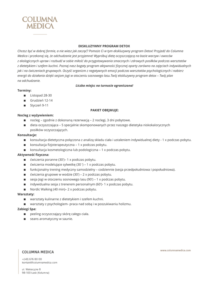 EKSKLUZYWNY PROGRAM DETOX Chcesz być w dobrej formie, a nie wiesz jak zacząć? Pomoże Ci w tym ekskluzywny program Detox! Przyjedź do Columna Medica i przekonaj się, że odchudzanie jest przyjemne! Wypróbuj dietę oczyszczającą na bazie warzyw i owoców z ekologicznych upraw i rozbudź w sobie miłość do przygotowywania smacznych i zdrowych posiłków podczas warsztatów z dietetykiem i szefem kuchni. Poznaj nasz bogaty program aktywności fizycznej oparty zarówno na zajęciach indywidualnych jak i na ćwiczeniach grupowych. Oczyść organizm z negatywnych emocji podczas warsztatów psychologicznych i nabierz energii do działania dzięki sesjom jogi w otoczeniu sosnowego lasu.Twój ekskluzywny program detox – Twój plan na odchudzanie. Liczba miejsc na turnusie ograniczona! Terminy: Listopad 28-30 Grudzień 12-14 Styczeń 9-11 PAKIET OBEJMUJE: Nocleg z wyżywieniem: nocleg – zgodnie z dokonaną rezerwacją – 2 noclegi, 3 dni pobytowe. dieta oczyszczająca – 5 specjalnie skomponowanych przez naszego dietetyka niskokalorycznych posiłków oczyszczających. Konsultacje: konsultacja dietetyczna połączona z analizą składu ciała i ustaleniem indywidualnej diety - 1 x podczas pobytu. konsultacja fizjoterapeutyczna – 1 x podczas pobytu. konsultacja kosmetologiczna lub podologiczna – 1 x podczas pobytu. Aktywność fizyczna: ćwiczenia poranne (30')– 1 x podczas pobytu. ćwiczenia modelujące sylwetkę (30 ') – 1 x podczas pobytu. funkcjonalny trening medyczny samodzielny – codziennie (sesja przedpołudniowa i popołudniowa). ćwiczenia grupowe w wodzie (30') – 2 x podczas pobytu. sesja Jogi w otoczeniu sosnowego lasu (90') – 1 x podczas pobytu. indywidualna sesja z trenerem personalnym (60')- 1 x podczas pobytu. Nordic Walking (40 min)– 2 x podczas pobytu. Warsztaty: warsztaty kulinarne z dietetykiem i szefem kuchni. warsztaty z psychologiem- praca nad sobą i w poszukiwaniu holizmu. Zabiegi Spa: peeling oczyszczający skórę całego ciała. seans aromatyczny w saunie. Strefa Medical Wellness: Pakiet obejmuje nieograniczony dostęp do strefy Medical Wellness:basen z systemem hydromasaży i przeciwprądem, sauna sucha i parowa, słoneczna łąka – opalające solarium, jacuzzi, prysznic wrażeń. Dodatkowe informacje: dostęp do strzeżonego parkingu bezprzewodowy Internet na terenie całego obiektu Cena: 599zł/osoba *Powyższa kwota dotyczy 1 doby hotelowej w pokoju dwuosobowym. Pakiet obejmuje min. 2 doby. Dopłata do pokoju jednoosobowego wynosi 90zł/doba. Dopłata do apartamentu 409zł/doba. Przedłuż swój pobyt i zyskaj! Podczas pobytu 13 dniowego – 5 % rabatu Podczas pobytu 19 dniowego – 7 % rabatu REGULAMIN: Ostateczną decyzję co do wyboru odpowiedniego programu odchudzania podejmuje lekarz,dietetyk oraz fizjoterapeuta, po przeprowadzeniu wstępnego badania lekarskiego, fizjoterapeutycznego oraz po konsultacji dietetycznej. Konsultacje specjalistyczne nie mogą być zamienione na inne konsultacje lub zabiegi. Niewykorzystanie któregokolwiek elementu wchodzącego w skład pakietu nie powoduje zmniejszenia jego wartości. Dopuszcza się zamianę zabiegu lub pakietu zabiegów na inny zabieg lub zabiegi będące w ofercie Columna Medica, wyłącznie z udokumentowanych przyczyn zdrowotnych Pacjenta. Warsztaty z psychologiem zawarte w pakiecie organizowane są dla min 5 osób. W przypadku przyjazdu mniejszej ilości osób na pakiet detox warsztaty z psychologiem zawarte w pakiecie zamienione zostaną na masaż wellness pleców (20') x 1 podczas pobytu NASZE REKOMENDACJE: Podczas pobytu istnieje możliwość skorzystania z dodatkowych usług za dodatkową opłatą m.in.: dodatkowe badania Testy Imu Pro i KyberKompakt zabiegi Icoone – seria min. 5 zabiegów w cenie 190 zł / zabieg zabiegów z zakresu medycyny estetycznej specjalistycznych zabiegów kosmetycznych zakupu kosmetyków celem utrzymania efektów relaksacji