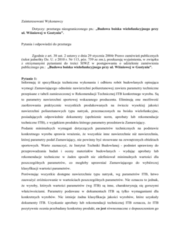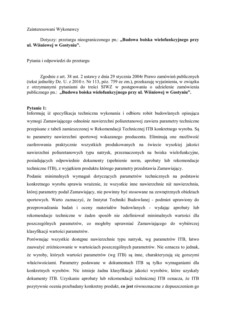 Zainteresowani Wykonawcy Dotyczy: przetargu nieograniczonego pn.: „Budowa boiska wielofunkcyjnego przy ul. Wiśniowej w Gostyniu”. Pytania i odpowiedzi do przetargu Zgodnie z art. 38 ust. 2 ustawy z dnia 29 stycznia 2004r Prawo zamówień publicznych (tekst jednolity Dz. U. z 2010 r. Nr 113, póz. 759 ze zm.), przekazuję wyjaśnienia, w związku z otrzymanymi pytaniami do treści SIWZ w postępowaniu o udzielenie zamówienia publicznego pn.: „Budowa boiska wielofunkcyjnego przy ul. Wiśniowej w Gostyniu”. Pytanie 1: Informuję iż specyfikacja techniczna wykonania i odbioru robót budowlanych opisująca wymogi Zamawiającego odnośnie nawierzchni poliuretanowej zawiera parametry techniczne przepisane z tabeli zamieszczonej w Rekomendacji Technicznej ITB konkretnego wyrobu. Są to parametry nawierzchni sportowej wskazanego producenta. Eliminują one możliwość zaoferowania praktycznie wszystkich produkowanych na świecie wysokiej jakości nawierzchni poliuretanowych typu natrysk, przeznaczonych na boiska wielofunkcyjne, posiadających odpowiednie dokumenty (spełnienie norm, aprobaty lub rekomendacje techniczne ITB), z wyjątkiem produktu którego parametry przedstawia Zamawiający. Podanie minimalnych wymagań dotyczących parametrów technicznych na podstawie konkretnego wyrobu sprawia wrażenie, że wszystkie inne nawierzchnie niż nawierzchnia, której parametry podał Zamawiający, nie powinny być stosowane na zewnętrznych obiektach sportowych. Warto zaznaczyć, że Instytut Techniki Budowlanej - podmiot uprawiony do przeprowadzania badań i oceny materiałów budowlanych - wydając aprobaty lub rekomendacje techniczne w żaden sposób nie zdefiniował minimalnych wartości dla poszczególnych parametrów, co mogłoby uprawniać Zamawiającego do wybiórczej klasyfikacji wartości parametrów. Porównując wszystkie dostępne nawierzchnie typu natrysk, wg parametrów ITB, łatwo zauważyć zróżnicowanie w wartościach poszczególnych parametrów. Nie oznacza to jednak, że wyroby, których wartości parametrów (wg ITB) są inne, charakteryzują się gorszymi właściwościami. Parametry podawane w dokumentach ITB są tylko wymaganiami dla konkretnych wyrobów. Nic istnieje żadna klasyfikacja jakości wyrobów, które uzyskały dokumenty ITB. Uzyskanie aprobaty lub rekomendacji technicznej ITB oznacza, że ITB pozytywnie ocenia przebadany konkretny produkt, co jest równoznaczne z dopuszczeniem go do użycia. Zamawiający stawia się w pozycji jednostki kompetentnej do decydowania, które parametry (wg dokumentacji technicznych ITB) i jakie ich wartości są odpowiednie, nie mając do tego żadnych uprawnień, a jednocześnie podważając kompetencje podmiotu merytorycznie właściwego do przeprowadzania tego typu ocen i dopuszczania na rynek wyrobów budowlanych. Odrzuca bowiem produkty, które zostały dopuszczone przez ITB. Utrzymanie dotychczasowych, niezasadnych - jak wskazano powyżej - wymogów formułujących w stosunku do nawierzchni poliuretanowej konkretne parametry oraz ich wartości, nie tylko ogranicza ale eliminuje z niniejszego postępowania konkurencyjność, naruszając fundamentalną zasadę Systemu zamówień publicznych - sformułowaną w art. 7 ustawy Prawo zamówień publicznych zasadę zachowania uczciwej konkurencji oraz równego traktowania wykonawców. Naruszenie to, w przypadku jego nie usunięcia, obarcza niniejsze postępowanie podstawową wadą, powodującą konieczność jego unieważnienia, a w przypadku zawarcia umowy - jej nieważność od samego początku, co stwierdza sąd prawomocnym orzeczeniem, na wniosek organu kontrolującego prawidłowość przeprowadzenia postępowania przetargowego i udzielenia zamówienia. Ze względu na powyższe proszę o dopuszczenie wszystkich nawierzchni poliuretanowych typu natrysk, przebadanych, ocenionych i dopuszczonych do użycia przez powołane do tego kompetentne organy, t. j. nawierzchni dla których wydano: - aprobatę lub Rekomendację Techniczną ITB, - Kartę Techniczną, - atest higieniczny. Dopuszczenie nawierzchni poliuretanowych posiadających ww. dokumenty zapewni Zamawiającemu dobrą jakość nawierzchni a jednocześnie pozwoli uniknąć naruszeń w procedurze przetargowej. Odpowiedź: W odpowiedzi na Państwa pytanie informuję, że parametry techniczne opisane w dokumentacji projektowej zostały dobrane tak, aby zagwarantować dobre warunki uprawiania sportu użytkownikom boiska oraz zapewnić długą żywotność nawierzchni. W dokumentacji projektowej oraz STWiOR podano parametry z tolerancją, która zapewnia Zamawiającemu otrzymanie nawierzchni dobrej jakości. Zmiana parametrów spowoduje pogorszenie warunków użytkowych i wytrzymałościowych co w konsekwencji będzie nie korzystne dla Zamawiającego. Pytanie 2: Czy Zamawiający dopuszcza zastosowanie innej nawierzchni o porównywalnych parametrach jak określone w dokumentacji projektowej i STWiOR? Odpowiedź: W odpowiedzi na Państwa pytanie informuję, że parametry techniczne opisane w dokumentacji projektowej zostały dobrane tak, aby zagwarantować dobre warunki uprawiania sportu użytkownikom boiska oraz zapewnić długą żywotność nawierzchni. W dokumentacji projektowej oraz STWiOR podano parametry z tolerancją, która zapewnia Zamawiającemu otrzymanie nawierzchni dobrej jakości. Zmiana parametrów spowoduje pogorszenie warunków użytkowych i wytrzymałościowych co w konsekwencji będzie nie korzystne dla Zamawiającego. Pytanie 3: W dokumentacji projektowej oraz STWiOR Zamawiający żąda aby oferowana nawierzchnia posiadała następujące dokumenty: 1. Certyfikat IAAF 2. Rekomendacja ITB lub wyniki innego niezależnego laboratorium potwierdzające wymagania Inwestora 3. Atest higieniczny PZH 4. Aktualne badania na zgodność z PN-EN 14877 5. Autoryzacja producenta systemu. 6. Karta techniczna systemu 7. Badania na bezpieczeństwo ekologiczne systemu. Czy Zamawiający żąda załączenia tych dokumentów d