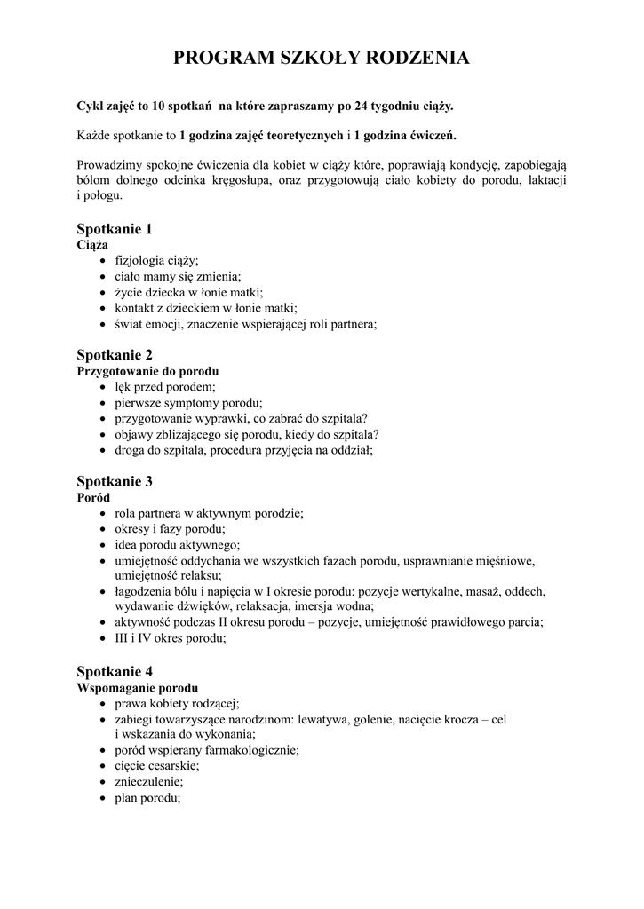 PROGRAM SZKOŁY RODZENIA Cykl zajęć to 10 spotkań na które zapraszamy po 24 tygodniu ciąży. Każde spotkanie to 1 godzina zajęć teoretycznych i 1 godzina ćwiczeń. Prowadzimy spokojne ćwiczenia dla kobiet w ciąży które, poprawiają kondycję, zapobiegają bólom dolnego odcinka kręgosłupa, oraz przygotowują ciało kobiety do porodu, laktacji i połogu. Spotkanie 1 Ciąża fizjologia ciąży; ciało mamy się zmienia; życie dziecka w łonie matki; kontakt z dzieckiem w łonie matki; świat emocji, znaczenie wspierającej roli partnera; Spotkanie 2 Przygotowanie do porodu lęk przed porodem; pierwsze symptomy porodu; przygotowanie wyprawki, co zabrać do szpitala? objawy zbliżającego się porodu, kiedy do szpitala? droga do szpitala, procedura przyjęcia na oddział; Spotkanie 3 Poród rola partnera w aktywnym porodzie; okresy i fazy porodu; idea porodu aktywnego; umiejętność oddychania we wszystkich fazach porodu, usprawnianie mięśniowe, umiejętność relaksu; łagodzenia bólu i napięcia w I okresie porodu: pozycje wertykalne, masaż, oddech, wydawanie dźwięków, relaksacja, imersja wodna; aktywność podczas II okresu porodu – pozycje, umiejętność prawidłowego parcia; III i IV okres porodu; Spotkanie 4 Wspomaganie porodu prawa kobiety rodzącej; zabiegi towarzyszące narodzinom: lewatywa, golenie, nacięcie krocza – cel i wskazania do wykonania; poród wspierany farmakologicznie; cięcie cesarskie; znieczulenie; plan porodu; Spotkanie 5 Wycieczka w ramach zajęć organizujemy zwiedzanie oddziału położniczo-ginekologicznego; Spotkanie 6 Pierwsze chwile razem ocena stanu noworodka po porodzie; postępowanie z dzieckiem na sali porodowej; skóra do skóry – rola pierwszego kontaktu oraz znaczenie wczesnego przystawienia do piersi; szczepienia, zabiegi i badania wykonywane w oddziale; znaczenie kontaktu fizycznego rodziców z dzieckiem; budowanie więzi emocjonalnej, rola ojca w rozwoju dziecka; pierwsza pomoc; Spotkanie 7 Pierwsze dni w domu – ćwiczenia praktyczne bezpieczny pokój i otoczenie dziecka; prawidłowe trzymanie i noszenie dziecka; przewijanie, ubieranie; kąpiel, pielęgnacja; pielęgnacja kikuta; Spotkanie 8 Połóg charakterystyka okresu połogu; syndrom baby blues; pierwsze godziny po porodzie; zasady pielęgnacji i higieny; powody do niepokoju; powrót do aktywności seksualnej; ćwiczenia w połogu; wizyta patronażowa ; Spotkanie 9 Karmienie znaczenie karmienia piersią dla więzi między matką a dzieckiem; dlaczego warto karmić piersią? - rola naturalnego pokarmu dla zdrowia dziecka i matki; fizjologia procesu wytwarzania pokarmu; przeciwwskazania do karmienia piersią ze strony matki i dziecka; sztuka karmienia piersią - jak postępować, aby był pokarm; najwygodniejsze pozycje do karmienia – ćwiczenia; czy moje dziecko się najada? - monitorowanie przebiegu karmienia; kiedy odciągać pokarm? Odciąganie i przechowywanie mleka kobiecego; jak podawać odciągnięty pokarm dziecku? - pomocne akcesoria w karmieniu piersią karmienie mieszane; prawidłowa dieta karmiącej mamy; Spotkanie 10 Zdrowie maleństwa stany przejściowe u noworodka: fizjologiczny spadek masy ciała, żółtaczka fizjologiczna, stolce przejściowe; szczepienia; co mówi niemowlę, gdy płacze? powody do niepokoju; czy moje dziecko ma kolkę? czy moje dziecko ulewa? czy moje dziecko ma zaparcie? czy moje dziecko ma biegunkę? czy moje dziecko ma alergię pokarmową? gdy maleństwo jest chore; niepokojące objawy - kiedy trzeba zwrócić się o pomoc? jak i kiedy wprowadzać nowe pokarmy? - zasady rozszerzania jadłospisu dziecka; masaż niemowlęcy; Na zajęcia prosimy przynieść: zaświadczenie od lekarza o braku przeciwwskazań do ćwiczeń w szkole rodzenia; grube skarpety (na salę wchodzimy bez butów) lub pantofle; wygodny strój (typu dresy, getry itp.) Zajęcia odbywają się w poniedziałek od godziny 1600 do 1800 w budynku szpitala ul. Mickiewicza 168 tel. 16 6328169 lub 500222254 Szkoła Rodzenia mieści się na parterze -1 (kierunek Bufet) Zapisy przed rozpoczęciem zajęć.