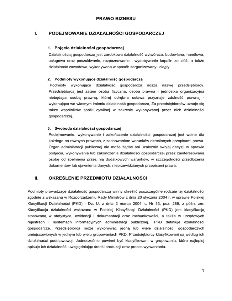 PRAWO BIZNESU I. PODEJMOWANIE DZIAŁALNOŚCI GOSPODARCZEJ 1. Pojęcie działalności gospodarczej Działalnością gospodarczą jest zarobkowa działalność wytwórcza, budowlana, handlowa, usługowa oraz poszukiwanie, rozpoznawanie i wydobywanie kopalin ze złóż, a także działalność zawodowa, wykonywana w sposób zorganizowany i ciągły. 2. Podmioty wykonujące działalność gospodarczą Podmioty wykonujące działalność gospodarczą noszą nazwę przedsiębiorcy. Przedsiębiorcą jest zatem osoba fizyczna, osoba prawna i jednostka organizacyjna niebędąca osobą prawną, której odrębna ustawa przyznaje zdolność prawną wykonująca we własnym imieniu działalność gospodarczą. Za przedsiębiorców uznaje się także wspólników spółki cywilnej w zakresie wykonywanej przez nich działalności gospodarczej. 3. Swoboda działalności gospodarczej Podejmowanie, wykonywanie i zakończenie działalności gospodarczej jest wolne dla każdego na równych prawach, z zachowaniem warunków określonych przepisami prawa. Organ administracji publicznej nie może żądać ani uzależnić swojej decyzji w sprawie podjęcia, wykonywania lub zakończenia działalności gospodarczej przez zainteresowaną osobę od spełnienia przez nią dodatkowych warunków, w szczególności przedłożenia dokumentów lub ujawnienia danych, nieprzewidzianych przepisami prawa. II. OKREŚLENIE PRZEDMIOTU DZIAŁALNOŚCI Podmioty prowadzące działalność gospodarczą winny określić poszczególne rodzaje tej działalności zgodnie z wskazaną w Rozporządzeniu Rady Ministrów z dnia 20 stycznia 2004 r. w sprawie Polskiej Klasyfikacji Działalności (PKD) - Dz. U. z dnia 2 marca 2004 r., Nr 33, poz. 289, z późn. zm. Klasyfikacja działalności wskazana w Polskiej Klasyfikacji Działalności (PKD) jest klasyfikacją stosowaną w statystyce, ewidencji i dokumentacji oraz rachunkowości, a także w urzędowych rejestrach i systemach informacyjnych administracji publicznej. PKD definiuje działalności gospodarcze. Przedsiębiorca może wykonywać jedną lub wiele działalności gospodarczych umiejscowionych w jednym lub wielu grupowaniach PKD. Przedsiębiorcy klasyfikowani są według ich działalności podstawowej. Jednocześnie powinni być klasyfikowani w grupowaniu, które najlepiej opisuje ich działalność, uwzględniając środki produkcji oraz proces wytwarzania. 1 III. 1. FORMA PRAWNA PROWADZENIA DZIAŁALNOŚCI GOSPODARCZEJ Osoba fizyczna jako przedsiębiorca - indywidualne prowadzenie działalności gospodarczej - prowadzenie działalności gospodarczej jako wspólnik spółki cywilnej SPÓŁKA CYWILNA Pojęcie: Stosunek obligacyjny oparty na umowie, w którym wspólnicy zobowiązują się do osiągnięcia wspólnego celu gospodarczego przez działanie w sposób oznaczony, w szczególności przez wniesienie wkładów. Forma umowy: pisemna dla celów dowodowych, w takiej formie również wszelkie zmiany umowy Wkład wspólnika: Pieniężny – jego przedmiotem są pieniądze będące w obiegu prawnym Niepieniężny – każde dobro przedstawiające jakąkolwiek wartość majątkową, jeżeli jest zbywalne i może stać się ekonomicznym podłożem działalności spółki, np.: wniesienie własności rzeczy, wierzytelności, praw na dobrach niematerialnych, świadczenie usług. Wniesienie wkładu polega na przeniesieniu własności wnoszonych rzeczy na wszystkich wspólników. Jeżeli umowa spółki nie stanowi inaczej wkłady wspólników mają jednakową wartość. Udział wspólnika: Wkłady wniesione do spółki ich pożytki i surogaty, jak też inne składniki majątkowe nabyte w czasie obowiązywania spółki stanowią wspólny majątek wspólników. Majątek ten jest odrębny od majątku osobistego każdego ze wspólników i ma charakter WSPÓLNOŚCI ŁĄCZNEJ, co oznacza: • Niepodzielność majątku, • Brak określenia wysokości udziałów przysługujących poszczególnym wspólnikom, • Że każdy wspólnik jest współwłaścicielem majątku jako całości, • Nienaruszalność majątku wspólnego (wierzyciel wspólnika nie może żądać zaspokojenia z jego udziału w majątku wspólnym, wspólnik nie może w czasie trwania spółki żądać podziału majątku wspólnego). Prowadzenie spraw spółki i jej reprezentacja: Wspólnicy mogą kwestie te dowolnie uregulować w umowie, jeżeli tego nie uczynią obowiązują następujące zasady: • Każdy wspólnik jest uprawniony i zobowiązany do prowadzenia spraw spółki, • Każdy wspólnik może bez uprzedniej uchwały wspólników prowadzić sprawy, które nie przekraczają zakresu zwykłych czynności spółki. Jeżeli jednak przed zakończeniem takiej sprawy 2 chociażby jeden z pozostałych wspólników sprzeciwi się jej prowadzeniu potrzebna jest uchwała wspólników, • Każdy wspólnik może bez uprzedniej uchwały wspólników wykonać czynność nagłą, której zaniechanie mogłoby narazić spółkę na niepowetowane straty, • Każdy wspólnik jest umocowany do reprezentowania spółki w takich granicach, w jakich jest uprawniony do prowadzenia jej spraw. Udział wspólnika w zyskach i stratach spółki: • Wspólnik może żądać podziału i wypłaty zysku dopiero po rozwiązaniu spółki, jednakże gdy spółka została zawarta na czas dłuższy wspólnicy mogą żądać podziału i wypłaty zysków z końcem każdego roku obrachunkowego. • Każdy wspólnik jest uprawniony do równego udziału w zyskach i w tym samym stosunku uczestniczy w stratach, bez względu na rodzaj i wartość wkładu. W umowie spółki można inaczej ustalić stosunek udziału w zyskach i stratach. Można nawet zwolnić niektórych wspólników od udziału w startach. Natomiast nie można wyłączyć wspólnika od udziału w zyskach. • Ustalony w umowie stosunek udziału wspólnika w zyskach odnosi się w razie wątpliwości także do udziału w stratach. Solidarna odpowiedzialność wspólników za zobowiązania spółki. Zna