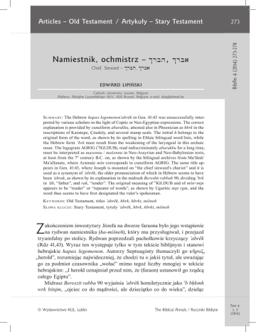 Namiestnik, ochmistrz – $rbh, $rba Chief, Steward – $rbh, $rba EDWARD LIPIŃSKI 273 BibAn 4 (2014) 273-278 Articles – Old Testament / Artykuły – Stary Testament Catholic University, Leuven, Belgium Address: Adolphe Lacomblélaan 50/11, 1030 Brussel, Belgium; e-mail: [email protected] S u m m a ry : The Hebrew hapax legomenon’abrēk in Gen. 41:43 was unsuccessfully interpreted by various scholars in the light of Coptic or Neo-Egyptian expressions. The correct explanation is provided by cuneiform abarakku, attested also in Phoenician as hbrk in the inscriptions of Karatepe, Çineköy, and several stamp seals. The initial h belongs to the original form of the word, as shown by its spelling in Eblaic bilingual word lists, while the Hebrew form ’brk must result from the weakening of the laryngeal in this archaic noun. The logogram AGRIG (lúIGI.DUB), read indiscriminately abarakku for a long time, must be interpreted as masennu / mašennu in Neo-Assyrian and Neo-Babylonian texts, at least from the 7th century B.C. on, as shown by the bilingual archives from Ma‘lānā/ Ma’allanate, where Aramaic mšn corresponds to cuneiform AGRIG. The same title appears in Gen. 41:43, where Joseph is mounted on “the chief steward’s chariot” and it is used as a synonym of ’abrēk, the older pronunciation of which in Hebrew seems to have been ’abrak, as shown by its explanation in the midrash Bereshit rabbah 90, dividing ’brk in ’āb, “father”, and rak, “tender”. The original meaning of lúIGI.DUB and of mšn<mtn appears to be “reader” or “repeater of words”, as shown by Ugaritic mtn rgm, and the word thus seems to have first designated the ruler’s spokesman. K ey wor ds: Old Testament, titles ’abrēk, hbrk, hbrkt, mišneh S łowa k lucze : Stary Testament, tytuły ’abrēk, hbrk, hbrkt, mišneh Z akończeniem inwestytury Józefa na dworze faraona było jego wstąpienie na rydwan namiestnika (ha-mišneh), który mu przysługiwał, i przejazd tryumfalny po stolicy. Rydwan poprzedzali pachołkowie krzyczący ’abrēk (Rdz 41,43). Wyraz ten występuje tylko w tym tekście biblijnym i stanowi hebrajskie hapax legomenon. Autorzy Septuaginty tłumaczyli go κῆρυξ, „herold”, rozumiejąc najwidoczniej, że chodzi tu o jakiś tytuł, ale uważając go za podmiot czasownika „wołać” mimo tegoż liczby mnogiej w tekście hebrajskim: „I herold oznajmiał przed nim, że (faraon) ustanowił go rządcą całego Egiptu”. Midrasz Bereszit rabba 90 wyjaśnia ’abrēk homiletycznie jako ’b bḥkmh wrk bšnjm, „ojciec co do mądrości, ale dzieciątko co do wieku”, dzieląc © Wydawnictwo KUL , Lublin The Biblical Annals / Roczniki Biblijne Tom 4, z. 2 (2014) 274 Edward Lipiński Articles – OT ’abrēk na dwa wyrazy ’āb, „ojciec”, i rak, „delikatny”. Św. Hieronim znał już tę egzegezę homiletyczną i oczywiście nie uznawał jej za wyjaśnienie słowa ’abrēk 1. Jest ona jednak ważna, gdyż wskazuje na ówczesną wymowę ’abrak tego wyrazu, poświadczoną o pół tysiąclecia przed ’abrēk tekstu masoreckiego. Jeszcze starsze wyjaśnienie, bo sięgające zapewne I w. n.e., czytamy w Targumie Onkelosa: dēn ’abbā lemalkā, „Oto ojciec dla króla”, czyli „wszechwładny minister”. Wyraz ’abbā jest tu użyty w sensie przenośnym, jak w tytule wiceprzewodniczącego Sanhedrynu: ’ab bēt dīn 2. Był on drugim co do godności po przewodniczącym, który nosił tytuł nāśī’, podobnie jak Józef był namiestnikiem faraona. Świadczy to, jak zobaczymy, że jeszcze rozumiano wówczas znaczenie wyrazu ’abrēk. Dobre jest zatem polskie tłumaczenie Stowarzyszenia Pardes: „I wołali przed nim: Wicekról!” 3. Wyjaśnienie podane tam w przypisie jest jednak niespójne i przekład powstał zapewne niezależnie od niego. Jest on widocznie oparty na Targumie Onkelosa. Targum Neofiti 1 czyta natomiast jḥj ’bwj d-mlk’, „Niech żyje ojciec króla!”, co zapewne świadczy o utracie właściwego sensu tłumaczenia targumicznego. Nie jest to zaskakujące, gdyż język Neofiti 1 wskazuje na okres bizantyjski, ok. IV/V w. n.e. Wulgata tłumaczy ut omnes genuflecterent, „niech wszyscy klękają”, idąc za przykładem Akwili i za Orygenesem. Uważali oni ’brk za tryb rozkazujący hebrajskiego czasownika bārak, „klękać”, co przyjmuje jeszcze jedno z najnowszych tłumaczeń polskich: „a słudzy mieli wołać przed nim: «Na kolana!»” 4. Jest to oczywiście wyjaśnienie błędne, gdyż litera ’alef stoi mu na przeszkodzie. Egiptolodzy doszukiwali się więc wyrazu egipskiego w przekonaniu, że opowiadanie biblijne posiada rzeczywiście jakieś zaplecze egipskie. Gdy hieroglify egipskie, kursywne pisma hieratyczne i demotyczne nie były jeszcze odszyfrowane, szukano rozwiązania w języku koptyjskim. Znany hebraista włoski Giovanni Bernardo de Rossi (1742–1831) zaproponował więc w 1808 r. koptyjską etymologię wyrazu ’abrēk, dzieląc go na dwa słowa: ape rek, tj. „schylać głowę” 5. Egipskiej etymologii doszukał się sto lat później Wilhelm Spiegelberg, sądząc, że ’abrēk odpowiada neoegipskiemu wyrażeniu ἰb r-k, „serce do ciebie”, w znaczeniu „uwaga!” 6. Wyjaśnienie to przyjmowali 1 2 3 4 5 6 Vol. 4, no. 2 (2014) Hieronymus, Hebraicae quaestiones in libro Geneseos (CCSL 72; Turnhout 1959), reprodukcja tekstu P. de Lagarde (Leipzig 1868); Liber Hebraicarum quaestionum in Genesim: PL XXIII, 998. Miszna, Taanit II, 1. Chumasz Pardes Lauder. Księga Pierwsza: Bereszit (Kraków 2001) 262. Pismo Święte Starego i Nowego Testamentu (Częstochowa 2011) 110. J. de Rossi, Etymologiae Aegypticae (Roma 1808) 1, 339. W. Spiegelberg, Äegyptologische Randglossen zum Alten Testament (Strassburg 1904) 14-18. The Biblical Annals / Roczniki Biblijne 275 $rbh, $rba jeszcze Roland de Vaux w 1951 r. 7 i Édouard Dhorme w 1957 r., w tłumaczeniu Starego Testamentu tzw. Bible de la Pléiade. 