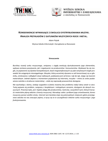 KONSEKWENCJE WYNIKAJĄCE Z EWOLUCJI DYSTRYBUOWANIA MUZYKI. ANALIZA PRZYKŁADÓW Z GATUNKÓW MUZYCZNYCH ROCK I METAL. Adam Piętak Wyższa Szkoła Informatyki i Zarządzania w Rzeszowie Streszczenie Burzliwy rozwój rynku muzycznego, związany z ciągłą ewolucją dystrybuowania jego elementów, wpływa zarówno pozytywnie, jak i negatywnie na producentów i konsumentów. Wydawać by się mogło, że pojawienie się dysków kompaktowych, kaset magnetofonowych czy płyt winylowych mogło prowadzić do osiągnięcia nieosiągalnego. Muzyka, którą wcześniej słyszano w sali koncertowej czy w głośniku, emitowana z odległych stacji radiowych, podawana jest od teraz z rąk do rąk, stając się tworem materialnym. Jednak dopiero z momentem pojawienia się Internetu, muzyka – mimo że znów pozbawiona nośnika o strukturze materialnej – stała się naprawdę powszechnie dostępna. Nie wychodząc z domu, siedząc wygodnie w fotelu możemy bez problemu nabyć dany utwór w sieci. Tutaj pojawia się problem, związany z bezpłatnym i nielegalnym zarazem, dostępem do danych muzycznych. Piractwo było, jest i będzie plagą dla producentów, twórców, wszystkich tych, których korzyści materialne płyną właśnie z branży muzycznej. Nieradząc sobie z próbami jego zniwelowania, biznes muzyczny ponosi wielkie straty. Internet tym bardziej staje się potencjalnym miejscem gdzie przestępstwo odciska na nas znaczące piętno, a tyczy się to w szczególności właśnie rynku muzycznego i jego funkcjonowania. www.think.wsiz.rzeszow.pl, ISSN 2082-1107, Nr 1 (17) 2014, s. 1-15 Konsekwencje wynikające z ewolucji dystrybuowania muzyki. Analiza przykładów z gatunków muzycznych rock i metal Consequences of music distribution evolution. Analysis of examples from rock and metal music Summary Turbulent development of the music market along with the constant evolution of the distribution of its elements influences both positively and negatively producers and consumers. It seems that the emergence of compact discs, cassette tapes or vinyls could have led to achieving the unachievable. Music, which was previously only heard in concert halls or speakers, broadcast from distant radio stations, is now passed between people, becoming a material creation. Only when the internet did emerge, music, although deprived of material data carrier, became truly freely available. Without leaving home, sitting comfortably in armchairs, we can purchase music online without any problem. But here, a problem with free and illegal access to music data emerges. Music piracy was, is and will be an epidemic for producers, artists and everyone who benefits from the music industry. Not being able to eliminate the problem, music industry is suffering major losses. Internet is more and more becoming potential place where a crime leaves a mark on us, especially with regards to music industry and its performance. 1. Początki dystrybucji fonograficznej, pierwsze urządzenia rejestrujące dźwięk Kiedy w grudniu 1877 roku amerykański wynalazca, Tomasz Edison, wynalazł fonograf, nikt jeszcze nie myślał o muzyce metalowej. Zapoczątkowana w ten sposób pierwsza na świecie rejestracja dźwięku, dała olbrzymie pole do popisu naśladowcom zainspirowanym pomysłem Edisona. Ponieważ pierwotna koncepcja fonografu nie zakładała, że będzie służył on do rejestracji muzyki i czerpania z niej korzyści materialnych, 10 lat później Emile Berliner opatentował gramofon, domowe urządzenie do obsługi płaskich dysków. Możliwość wzbogacenia się pomysłodawcy nie polegała wyłącznie na sprzedawaniu urządzenia. Kluczem do komercyjnego sukcesu miało się okazać przemysłowe kopiowanie materiału zapisanego na nośniku. Z biegiem lat, gdy ekspansja popularności sprzętów umożliwiających w domowych warunkach odtwarzanie nagrań muzycznych, podejmowano coraz to częstsze próby rozwoju i rozpowszechniania nowo powstałej technologii. O ile w Stanach Zjednoczonych firmy Columbia i Victor miały pieczę nad przyznawaniem patentów na produkcję sprzętów służących do rejestracji dźwięków, o tyle sytuacja w Europie umożliwiała producentom kolejne udoskonalenia i masową produkcję odtwarzaczy i nośników1. Od tego momentu egzystencja u boku pnącej się coraz wyżej branży fonograficznej symbolizowała prestiż i każdy, bez względu na pochodzenie i kulturę, mógł stać się jej częścią. Mocnymi miejscami produkcji stały się Niemcy, Rosja i Stany Zjednoczone, działające w myśl pomysłów Edisona i Berlinera. Jeszcze do końca XIX wieku patent na produkcję fonografu należał wyłącznie do Columbia Gramophone 1 Gałuszka P., Biznes Muzyczny, Placet, Warszawa 2009, s. 15-16. 7 Konsekwencje wynikające z ewolucji dystrybuowania muzyki. Analiza przykładów z gatunków muzycznych rock i metal Company, produkcją gramofonów zajmowała się Victor Talking Machine Company2. W celu kompletnego zawładnięcia światową produkcją obu urządzeń, firmy te zapoczątkowały wspólne korzystanie z patentów, co w efekcie spowodowało stopniowe spowolnienie rozwoju rynku. Sytuacja ta trwała do 1914, czyli do momentu wygaśnięcia patentów i pojawienia się nowych producentów urządzeń muzycznych. Dzięki temu zwiększyła się konkurencja, sytuacja na rynku znacznie się polepszyła, pojawiło się wiele rozmaitych nagrań i urządzeń. Firmy fonograficzne prężnie rozwijały swoje interesy, a wartość nagrań w samych Stanach Zjednoczonych przekraczała 100 mln dolarów3. Spadek dobrej passy zaczął dawać się we znaki z początkiem lat 30, kiedy to w wyniku interwencji rządu USA w postaci niewłaściwego zarządzania pieniędzmi i podażą kredytów, doszło do drastycznych zmian w sektorze gospodarczym4. Piętno kryzysu odcisnęło się w ogromnym stopniu na rynku fonograficznym. Kolejnym „gwoździem do trumny” dla fonograficznej dystrybucji stał się nowy wynalazek włoskiego fizyka Guglie