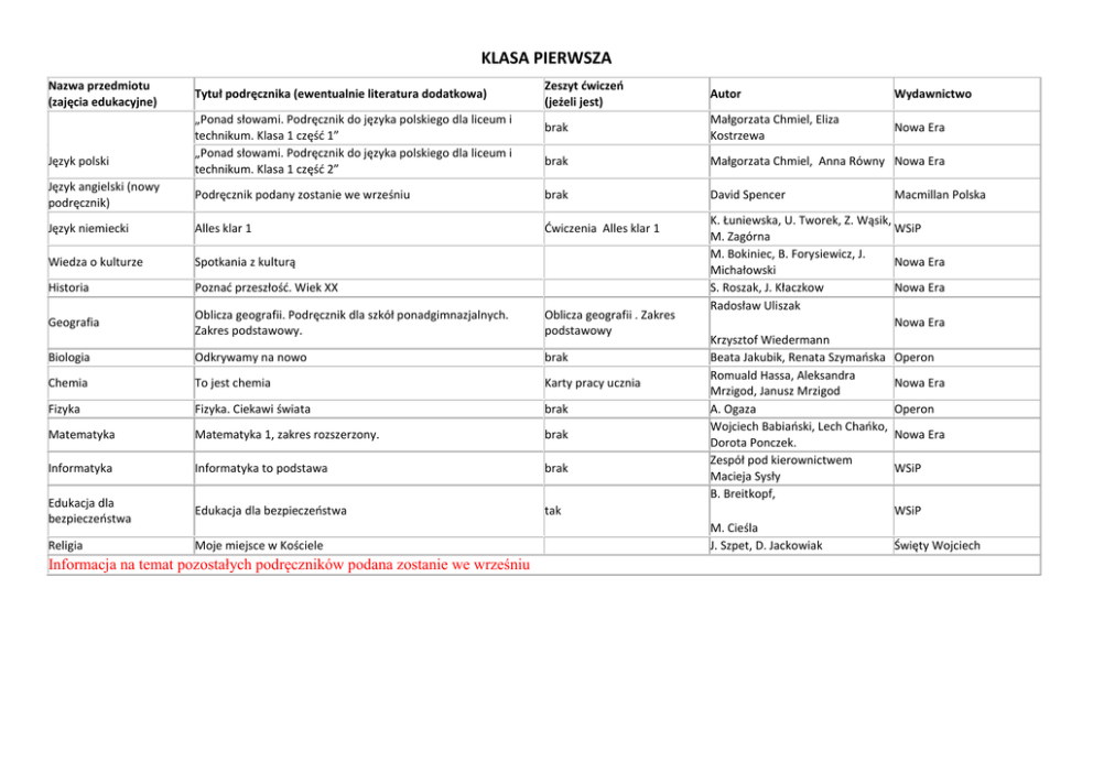KLASA PIERWSZA Nazwa przedmiotu (zajęcia edukacyjne) Język polski Tytuł podręcznika (ewentualnie literatura dodatkowa) „Ponad słowami. Podręcznik do języka polskiego dla liceum i technikum. Klasa 1 część 1” „Ponad słowami. Podręcznik do języka polskiego dla liceum i technikum. Klasa 1 część 2” Zeszyt ćwiczeń (jeżeli jest) Autor Wydawnictwo brak Małgorzata Chmiel, Eliza Kostrzewa Nowa Era brak Małgorzata Chmiel, Anna Równy Nowa Era David Spencer Język angielski (nowy podręcznik) Podręcznik podany zostanie we wrześniu brak Język niemiecki Alles klar 1 Ćwiczenia Alles klar 1 Wiedza o kulturze Spotkania z kulturą Historia Poznać przeszłość. Wiek XX Geografia Oblicza geografii. Podręcznik dla szkół ponadgimnazjalnych. Zakres podstawowy. Oblicza geografii . Zakres podstawowy Biologia Odkrywamy na nowo brak Chemia To jest chemia Karty pracy ucznia Fizyka Fizyka. Ciekawi świata brak Matematyka Matematyka 1, zakres rozszerzony. brak Informatyka Informatyka to podstawa brak Edukacja dla bezpieczeństwa Edukacja dla bezpieczeństwa tak Religia Moje miejsce w Kościele Informacja na temat pozostałych podręczników podana zostanie we wrześniu Macmillan Polska K. Łuniewska, U. Tworek, Z. Wąsik, WSiP M. Zagórna M. Bokiniec, B. Forysiewicz, J. Nowa Era Michałowski S. Roszak, J. Kłaczkow Nowa Era Radosław Uliszak Nowa Era Krzysztof Wiedermann Beata Jakubik, Renata Szymańska Operon Romuald Hassa, Aleksandra Nowa Era Mrzigod, Janusz Mrzigod A. Ogaza Operon Wojciech Babiański, Lech Chańko, Nowa Era Dorota Ponczek. Zespół pod kierownictwem WSiP Macieja Sysły B. Breitkopf, WSiP M. Cieśla J. Szpet, D. Jackowiak Święty Wojciech KLASA DRUGA Nazwa przedmiotu (zajęcia edukacyjne) Język polski Tytuł podręcznika (ewentualnie literatura dodatkowa) „Ponad słowami. Podręcznik do języka polskiego dla liceum i technikum. Klasa 2 część 1” Zeszyt ćwiczeń (jeżeli jest) brak Autor Wydawnictwo Małgorzata Chmiel, Anna Równy Nowa Era Małgorzata Chmiel, Ewa Mirkowska-Traugutt, Anna Równy David Spencer Nowa Era WSiP „Ponad słowami. Podręcznik do języka polskiego dla liceum i technikum. Klasa 2 część 2” brak Język angielski Gateway 2 Plus Gateway 3 Plus brak Język niemiecki alles klar Historia sztuki Sztuka i czas. Od prehistorii do rokoka. Krystyna Łuniewska, Urszula Tworek, Zofia Wąsik, Maria Zagórna Barbara Osińska Wiedza o społeczeństwie W centrum uwagi. Zakres podstawowy Arkadiusz Janicki Nowa Era Podstawy przedsiębiorczości Odkrywamy na nowo. orczości brak J. Korba, Z. Smutek Operon Matematyka Matematyka 2, zakres rozszerzony brak Wojciech Babiański, Lech Chańko, Dorota Ponczek. Nowa Era Religia Moje miejsce w świecie J. Szpet, D. Jackowiak Św. Wojciech Wykaz podręczników do przedmiotów zawodowych podany zostanie we wrześniu Macmillan Polska WSiP KLASA TRZECIA Nazwa przedmiotu (zajęcia edukacyjne) Tytuł podręcznika (ewentualnie literatura dodatkowa) Zeszyt ćwiczeń (jeżeli jest) brak Autor Wydawnictwo Małgorzata Chmiel, Ewa Mirkowska-Treugutt, Anna Równy Marta Umińska i in. Nowa Era Język polski „Ponad słowami. Podręcznik do języka polskiego dla liceum i technikum. Klasa 2 część 2” Język angielski Longman repetytorium maturalne. Poziom podstawowy 2015 Język niemiecki Genau! Historia sztuki Sztuka i czas. Od prehistorii do rokoka. Barbara Osińska Przyroda Przyroda. Część 1. brak M. Galikowski, M. Kaczmar Nowa Era Matematyka Matematyka 2, zakres rozszerzony brak Wojciech Babiański, Lech Chańko, Dorota Ponczek. Nowa Era Religia Moje miejsce w rodzinie J. Szpet, D. Jackowiak Św. Wojciech Wykaz podręczników do przedmiotów zawodowych podany zostanie we wrześniu brak Pearson LektorKlett WSiP KLASA CZWARTA Nazwa przedmiotu (zajęcia edukacyjne) Tytuł podręcznika (ewentualnie literatura dodatkowa) Język polski „Ponad słowami. Podręcznik do języka polskiego dla liceum i technikum. Klasa 3 Język angielski Longman repetytorium maturalne. Poziom podstawowy 2015 Język niemiecki Zeszyt ćwiczeń (jeżeli jest) brak Autor Wydawnictwo Małgorzata Chmiel, Robert Pruszczyński, Anna Równy Nowa Era brak Marta Umińska i in. Pearson Alles klar brak Krystyna Łuniewska, Urszula Tworek, Zofia Wąsik, Maria Zagórna WSiP Matematyka Matematyka 3, zakres rozszerzony brak Wojciech Babiański, Lech Chańko, Dorota Ponczek. Nowa Era Religia Moje miejsce w rodzinie J. Szpet, D. Jackowiak Św. Wojciech Przyroda Wykaz podręczników do przedmiotów zawodowych podany zostanie we wrześniu