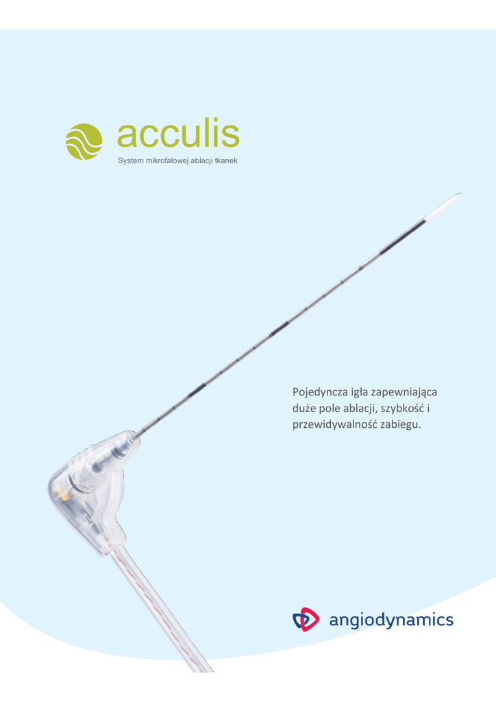 acculis System mikrofalowej ablacji tkanek Pojedyncza igła zapewniająca duże pole ablacji, szybkość i przewidywalność zabiegu. System AcculisMTA AplikatorAccu2ipMTA System ablacji mikrofalowej tkanek Acculis * MicrowaveTissueAblation (MTA), skonfigurowany do współpracy z igłami Accu2ipMTA składa się z generatora Sulis* V pMTA , opcjonalnych czujników temperatury MTATemperatureProbes, stacji kontroli temperatury AcculisLocal Control Station (LCS) oraz igiełAccu2ipMTA. System AcculisMTA służy do przekazywania energii do tkanek miękkich w celu koagulacji termicznej. System AcculisMTA zaprojektowano dla lekarzy posiadających umiejętności z zakresu przeprowadzania ablacji pod kontrolą technik obrazowych oraz dokonywania nakłućśródoperacyjnych pod kontrolą obrazu USG i/lub tomografii komputerowej. DLACZEGO ACCULIS? Pole ablacji Częstotliwość Wiarygodna średnica 2,45 GHz w porównaniu z 915 MHz Przewidywalne natężenie Duże pole ablacji Niemal sferyczny kształt pola Krótszy czas trwania procedury Mniej czujników Prędkość 4,5 x 5,5 cm ablacji w ciągu 6 minut† Większa moc = szybsza ablacja Uchwyt igły Koszulka igły Znacznik co centymetr, podwójny znacznik co 5 cm od końcówki Monitorowanie temperatury Monitorowanie temperatury cieczy chłodzącej w tym miejscu wewnątrz koszulki Uchwyt z rozgałęzieniem z komorami zasilania i powrotu cieczy chłodzącej Chłodzony przewód Końcówka promieniująca ostra tnąca końcówka zakończona trójgrańcem Pojedyncza igła zapewniająca duże pole ablacji, szybkość i przewidywalność zabiegu. Planowanie 4,5 cm x 5,5 cm W płaszczyźnie prostopadłej do igły, A oznacza ŚREDNICĘ KOAGULACJI Nakłucie Pod kontrolą tomografii komputerowej ABLACJI W 6 MINUT W płaszczyźnie igły, B oznacza DŁUGOŚĆ KOAGULACJI † Sferyczne pole ablacji 60 watów Czas ŚrednicaDługość 2 min 2,3 cm 2,7 cm 4 min 3,3 cm 3,7 cm 6 min 3,5 cm 4,0 cm 2 min 2,7 cm 3,2 cm 4 min 3,6 cm 4,1 cm 6 min 4,0 cm 4,7 cm 100 watów Po ablacji 140 watów Tkanka bydlęca, ex-vivo 2 min 2,9 cm 3,5 cm 4 min 4,1 cm 5,2 cm 6 min 4,5 cm 5,5 cm † Wyniki koagulacji wątroby pochodzą z koagulacji przeprowadzonych na modelach tkanek zwierzęcych ex-vivo. acculis System mikrofalowej ablacji tkanek Specyfikacja Generator Sulis VpMTA • Medyczny generatormikrofal 2,45 GHz • Ekran dotykowy • Moc od 60 W do 140 W • Monitorowanie energii odbitej • Pojedyncza igła • Częstotliwość pracy 2,45 GHz • Moc generatora od 60 W do 140 W • Igła i przewód chłodzony cieczą • Monitorowanie energii odbitej • Igła dostępna w trzech długościach: 14 cm, 19 cm i 29 cm Stacja kontroli temperatury AcculisLCS (Local Control Station) • system monitorowania temperatury igieł chłodzonych cieczą • Zintegrowany interfejs sterowania systemami igiełjednorazowych do ablacji mikrofalowej Acculis • Jeden moduł gromadzący wszystkie parametry: dane sygnału, mikrofal, cieczy chłodzącej i pompy Nazwa produktu Średnica Wózek Acculis Generator SulisVpMTA umieszczony jest na wózku. Przegubowe ramię pozwala umieścić stację AcculisLCS na granicy strefy sterylnej. Długość Nr części Nazwa produktu Nr części Generator Sulis V pMTA 806-010-US Standardowa igła pMTAAccu2i (z chłodzeniem) 1,8 mm. 14 cm. 900-600-US Średnia igła pMTAAccu2i (z chłodzeniem) 1,8 mm. 19 cm. 900-602-US Stacja LCS 806-011-US Długa igła pMTAAccu2i (z chłodzeniem) 1,8 mm. 29 cm. 900-601-US Wózek i ramię z monitorem 700-006 Czujniki temperatury MTA (czarne i szare) 18G 20 cm. 900-314 Przewody zasilające USA/Canada 10A/125v 800-017 WAŻNE INFORMACJE O ZAGROŻENIACH WSKAZANIA: Igła Accu2ipMTA z generatorem pMTA SulisV wersja oprogramowania 2.1.0 jest przeznaczona do śródoperacyjnej koagulacji tkanek miękkich. PRZECIWWSKAZANIA: Igieł Accu2ipMTA nie należy stosować u pacjentów z rozrusznikami serca i innymi wszczepianymi urządzeniami elektrycznymi. OSTRZEŻENIA I ŚRODKI OSTROŻNOŚCI: Nie wprowadzać igły dopóki nie zostanie ona podłączona i przygotowana a na wyświetlaczu stacji LSC nie pojawi się symbol gotowości (Ready). Jako ciecz chłodzącą stosować tylko sterylny roztwór soli. Zastosowania niesterylnego roztworu soli, wody lub innej cieczy w razie wycieku grozi uszkodzeniem ciała pacjenta. Zastosowanie mniejszego zbiornika na ciecz chłodzącą zwiększy tempo wzrostu jej temperatury. Nie włączać generatora dopóki w uchwycie igły nie będzie widoczny przepływ cieczy chłodzącej. NIE zginaćigły Accu2ipMTA, gdyż może to osłabić chłodzenie i uszkodzić przewód przewodzący mikrofale wewnątrz igły. NIE narażać ceramicznej końcówki igły na działanie sił poprzecznych podczas wprowadzania, działania i usuwania igły, gdyż może to spowodować pęknięcie powłoki ceramicznej i zranienie pacjenta albo osoby obsługującej urządzenie.Nieumieszczenie czujników temperatury i brak monitorowania temperatury sąsiadujących tkanek, ważnych struktur, przewodów, naczyń lub nerwów może doprowadzić do ich przypadkowego termicznego uszkodzenia. NIEwłączać generatora dopóki CZĘŚĆ AKTYWNA igły Accu2ipMTA nie jest całkowicie umieszczona w tkance, która ma być poddana zabiegowi. Jeśli igła nie jest odpowiednio umieszczona w wybranej tkance, może dojść do przypadkowego urazu termicznego u osoby przeprowadzającej zabieg albo przypadkowego termicznego uszkodzenia tkanek, ważnych struktur, przewodów, naczyń lub tkanek nerwowych. Niewłączać ponownie generatora przed wizualnym sprawdzeniem stanu igłypomiędzy kolejnymi użyciami. Ponowne włączenie generatora i zasilenie igły przed wizualnym sprawdzeniem jej stanu może skutkować niepotrzebne nakłucie pacjenta, ponieważ igła Accu2ipMTA może nie zadziałać. Nieusunięcie igły po wystąpieniu Błędu może wywołać uraz termiczny u osoby przeprowadzającej zabieg albo u pacjenta, ze względu na przewodzenie termiczne tkanki w ogrzanym polu koagulac