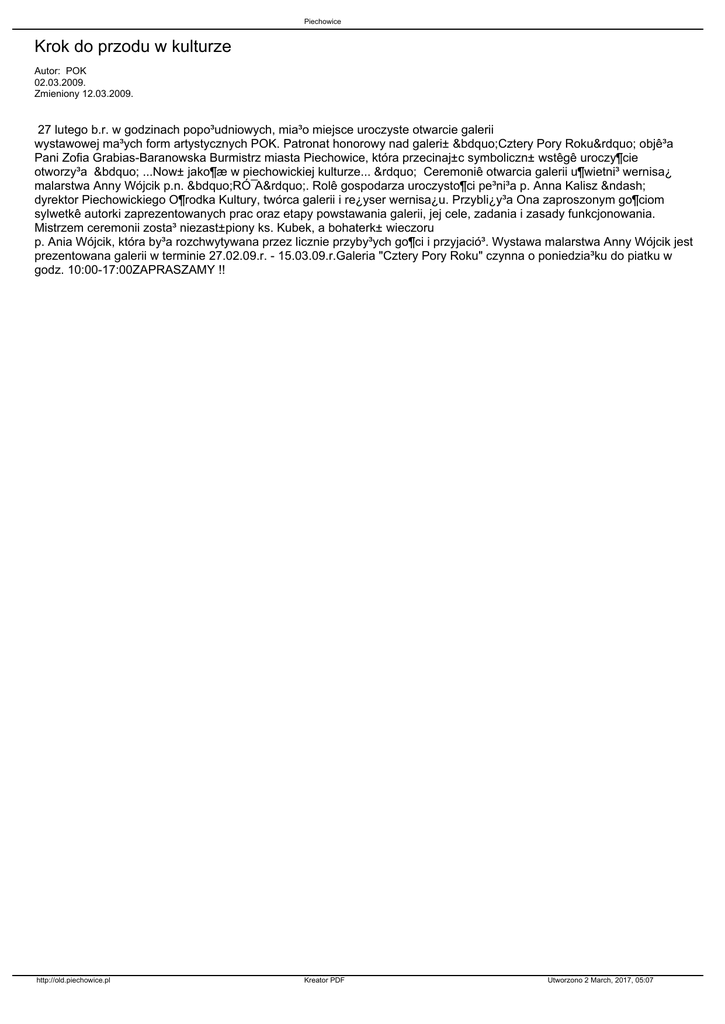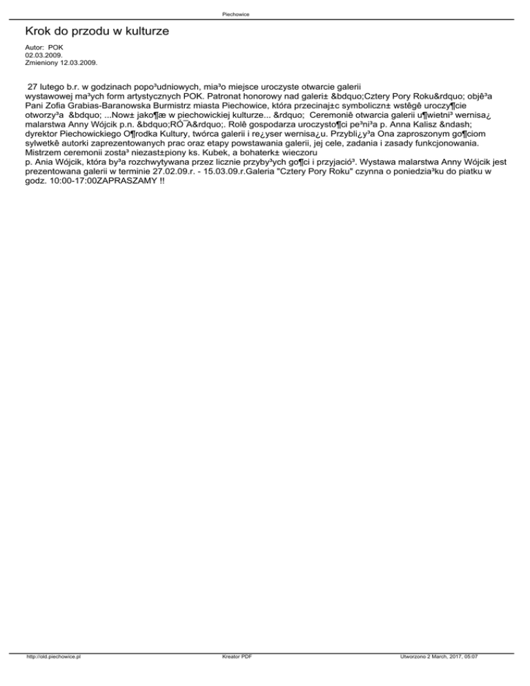Piechowice Krok do przodu w kulturze Autor: POK 02.03.2009. Zmieniony 12.03.2009. 27 lutego b.r. w godzinach popo³udniowych, mia³o miejsce uroczyste otwarcie galerii wystawowej ma³ych form artystycznych POK. Patronat honorowy nad galeri± „Cztery Pory Roku” objê³a Pani Zofia Grabias-Baranowska Burmistrz miasta Piechowice, która przecinaj±c symboliczn± wstêgê uroczy¶cie otworzy³a „ ...Now± jako¶æ w piechowickiej kulturze... ” Ceremoniê otwarcia galerii u¶wietni³ wernisa¿ malarstwa Anny Wójcik p.n. „RÓ¯A”. Rolê gospodarza uroczysto¶ci pe³ni³a p. Anna Kalisz – dyrektor Piechowickiego O¶rodka Kultury, twórca galerii i re¿yser wernisa¿u. Przybli¿y³a Ona zaproszonym go¶ciom sylwetkê autorki zaprezentowanych prac oraz etapy powstawania galerii, jej cele, zadania i zasady funkcjonowania. Mistrzem ceremonii zosta³ niezast±piony ks. Kubek, a bohaterk± wieczoru p. Ania Wójcik, która by³a rozchwytywana przez licznie przyby³ych go¶ci i przyjació³. Wystawa malarstwa Anny Wójcik jest prezentowana galerii w terminie 27.02.09.r. - 15.03.09.r.Galeria "Cztery Pory Roku" czynna o poniedzia³ku do piatku w godz. 10:00-17:00ZAPRASZAMY !! http://old.piechowice.pl Kreator PDF Utworzono 2 March, 2017, 05:07 Piechowice http://old.piechowice.pl Kreator PDF Utworzono 2 March, 2017, 05:07