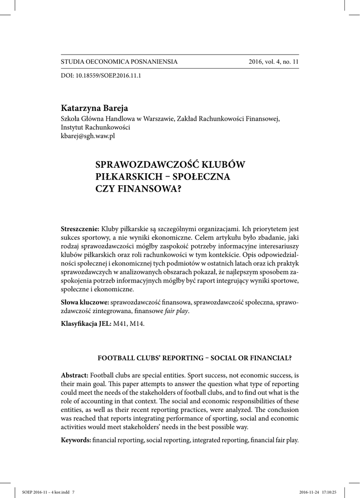 STUDIA OECONOMICA POSNANIENSIA 2016, vol. 4, no. 11 DOI: 10.18559/SOEP.2016.11.1 Katarzyna Bareja Szkoła Główna Handlowa w Warszawie, Zakład Rachunkowości Finansowej, Instytut Rachunkowości [email protected] SPRAWOZDAWCZOŚĆ KLUBÓW PIŁKARSKICH – SPOŁECZNA CZY FINANSOWA? Streszczenie: Kluby piłkarskie są szczególnymi organizacjami. Ich priorytetem jest sukces sportowy, a nie wyniki ekonomiczne. Celem artykułu było zbadanie, jaki rodzaj sprawozdawczości mógłby zaspokoić potrzeby informacyjne interesariuszy klubów piłkarskich oraz roli rachunkowości w tym kontekście. Opis odpowiedzialności społecznej i ekonomicznej tych podmiotów w ostatnich latach oraz ich praktyk sprawozdawczych w analizowanych obszarach pokazał, że najlepszym sposobem zaspokojenia potrzeb informacyjnych mógłby być raport integrujący wyniki sportowe, społeczne i ekonomiczne. Słowa kluczowe: sprawozdawczość finansowa, sprawozdawczość społeczna, sprawozdawczość zintegrowana, finansowe fair play. Klasyfikacja JEL: M41, M14. FOOTBALL CLUBS’ REPORTING – SOCIAL OR FINANCIAL? Abstract: Football clubs are special entities. Sport success, not economic success, is their main goal. This paper attempts to answer the question what type of reporting could meet the needs of the stakeholders of football clubs, and to find out what is the role of accounting in that context. The social and economic responsibilities of these entities, as well as their recent reporting practices, were analyzed. The conclusion was reached that reports integrating performance of sporting, social and economic activities would meet stakeholders’ needs in the best possible way. Keywords: financial reporting, social reporting, integrated reporting, financial fair play. SOEP 2016-11 – 4 kor.indd 7 2016-11-24 17:10:25 8 Katarzyna Bareja Wstęp Celem prowadzenia działalności gospodarczej jest przede wszystkim wypracowanie wyników ekonomicznych. Sprawozdawczość finansowa odwzorowuje efekty aktywności ekonomicznej. Z kolei kluby piłkarskie koncentrują się w swoich działaniach głównie na sukcesie sportowym. Inne priorytety funkcjonowania klubów mogą mieć określone konsekwencje dla sprawozdawczości tych organizacji. Celem opracowania było zbadanie, jaki rodzaj sprawozdawczości jest w stanie najpełniej zaspokoić potrzeby informacyjne interesariuszy klubów piłkarskich oraz określić rolę informacji z systemu rachunkowości dla zaspokojenia tych potrzeb. Dla osiągnięcia tak określonego celu przeprowadzono studia literaturowe z zakresu sprawozdawczości finansowej i sprawozdawczości społecznej. Przeanalizowano raporty podsumowujące dokonania klubów piłkarskich uczestniczących w rozgrywkach organizowanych przez Europejską Unię Piłkarską, a także regulacje ustanowione przez UEFA. Konkluzje zawarte w artykule zostały sformułowane na podstawie wnioskowania. 1. Sprawozdawczość jako wyraz informacyjnej funkcji rachunkowości Zmiana warunków ekonomicznych i społecznych prowadzenia działalności gospodarczej znajduje odzwierciedlenie w ewolucji rachunkowości. Spełniając funkcję informacyjną, poszerza ona zakres obserwowanych zjawisk. Rachunkowość społeczna jest odpowiedzią na zmianę świadomości podmiotów gospodarujących odnośnie do obszarów ich odpowiedzialności. Wywiązywanie się z odpowiedzialności ekonomicznej było, jest i będzie sednem prowadzenia działalności gospodarczej. Jednak dążeniu do maksymalizacji zysku czy maksymalizacji wartości dla właścicieli coraz częściej towarzyszy świadomość, że cele te nie mogą być realizowane kosztem innych interesariuszy. Społeczne i środowiskowe aspekty prowadzenia działalności, dostrzegane w nurcie społecznej odpowiedzialności biznesu i zrównoważonego rozwoju, są badane, obserwowane i opisywane przez rachunkowość odpowiedzialności społecznej. Współcześnie sprawozdanie finansowe jest tylko jednym z raportów o dokonaniach przedsiębiorstwa kierowanych do zewnętrznych użytkowników informacji o podmiocie gospodarczym. Sprawozdaniom finansowym z bardzo rozbudowaną narracją w ramach informacji dodatkowej towarzyszą sprawozdania segmentowe, sprawozdania o stanie kapitału ludzkiego, sprawozdania o ochronie środowiska, raporty ze społecznej odpowiedzialności biznesu czy SOEP 2016-11 – 4 kor.indd 8 2016-11-24 17:10:25 Sprawozdawczość klubów piłkarskich – społeczna czy finansowa 9 wreszcie raporty zintegrowane łączące wcześniej wymienione obszary sprawozdawczości podmiotów. Idea społecznej odpowiedzialności biznesu (corporate social responsibility – CRS) „polega na dobrowolnym, wychodzącym poza wymogi prawa, uwzględnianiu w działalności przedsiębiorstwa celów etycznych, społecznych i ekologicznych” [Krasodomska 2010, s. 335]. Odpowiedzialność narzucona lub wymuszona wiąże się z przymusem w działaniach odpowiedzialnych. Dopiero odpowiedzialność świadoma oznacza pełną odpowiedzialność [Kamela-Sowińska 2009, s. 215]. To właśnie świadomość i dobrowolność odpowiedzialności pozwalają lepiej zarysować relacje między sprawozdawczością finansową i sprawozdawczością społeczną. Sprawozdawczość finansowa ściśle wiąże się z odpowiedzialnością ekonomiczną podmiotów gospodarujących wobec otoczenia. Przez otoczenie należy rozumieć użytkowników zewnętrznych sprawozdań finansowych. Współcześnie ewoluujący system rachunkowości, w tym wypadku sprawozdawczości finansowej, ukierunkowany zostaje w większym stopniu na użytkowników, którzy są zaangażowani kapitałowo w podmiocie gospodarczym. Przyjmuje się założenie, że w związku z tym, iż ponoszą oni największe ryzyko, zaspokojenie ich potrzeb jest najważniejsze. Zakłada się równocześnie, że zaspokojenie ich oczekiwań spełni także oczekiwania powszechnego użytkownika sprawozdań finansowych. Z tego względu raporty finansowe mają być przede wszystkim przydat