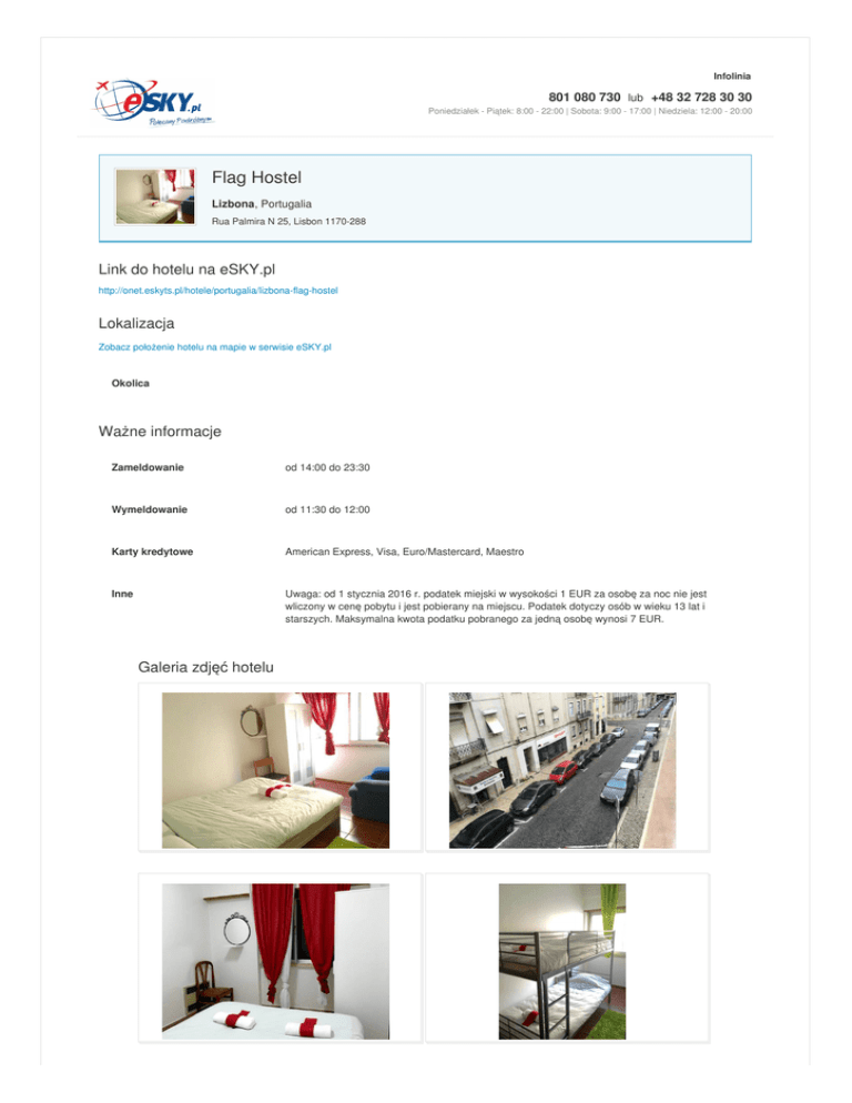 Infolinia 801 080 730 lub +48 32 728 30 30 Poniedziałek - Piątek: 8:00 - 22:00 | Sobota: 9:00 - 17:00 | Niedziela: 12:00 - 20:00 Flag Hostel Lizbona, Portugalia Rua Palmira N 25, Lisbon 1170-288 Link do hotelu na eSKY.pl http://onet.eskyts.pl/hotele/portugalia/lizbona-flag-hostel Lokalizacja Zobacz położenie hotelu na mapie w serwisie eSKY.pl Okolica Ważne informacje Zameldowanie od 14:00 do 23:30 Wymeldowanie od 11:30 do 12:00 Karty kredytowe American Express, Visa, Euro/Mastercard, Maestro Inne Uwaga: od 1 stycznia 2016 r. podatek miejski w wysokości 1 EUR za osobę za noc nie jest wliczony w cenę pobytu i jest pobierany na miejscu. Podatek dotyczy osób w wieku 13 lat i starszych. Maksymalna kwota podatku pobranego za jedną osobę wynosi 7 EUR. Galeria zdjęć hotelu Hotele – Bilety lotnicze – Tanie linie lotnicze – Ubezpieczenia Podróżne