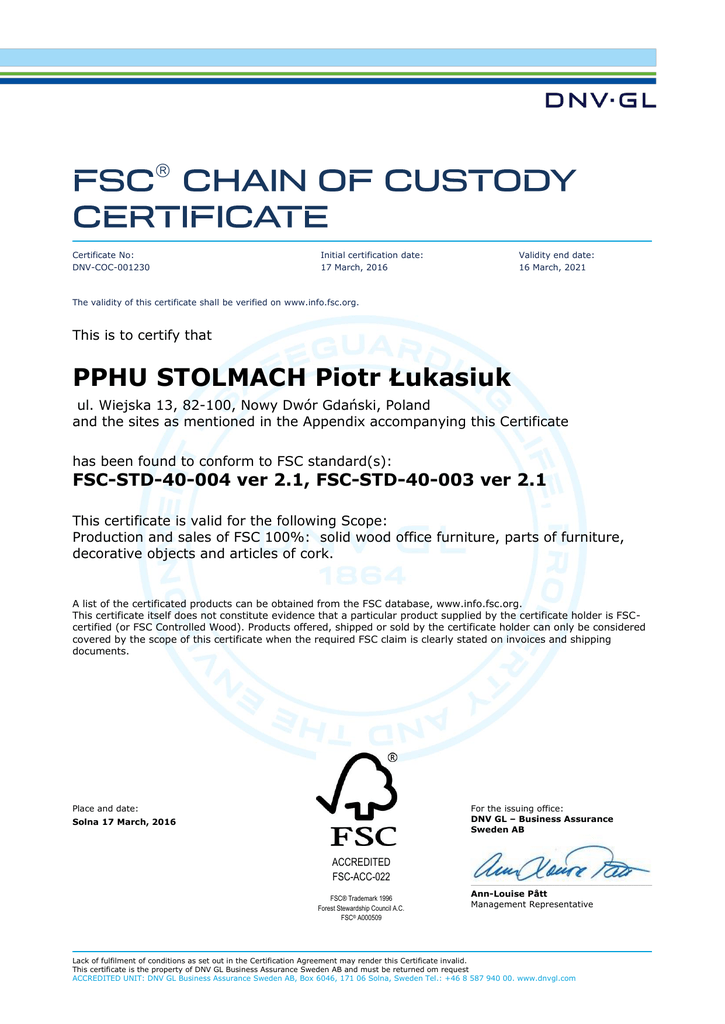 Certificate No: DNV-COC-001230 Initial certification date: 17 March, 2016 Validity end date: 16 March, 2021 The validity of this certificate shall be verified on www.info.fsc.org. This is to certify that PPHU STOLMACH Piotr Łukasiuk ul. Wiejska 13, 82-100, Nowy Dwór Gdański, Poland and the sites as mentioned in the Appendix accompanying this Certificate has been found to conform to FSC standard(s): FSC-STD-40-004 ver 2.1, FSC-STD-40-003 ver 2.1 This certificate is valid for the following Scope: Production and sales of FSC 100%: solid wood office furniture, parts of furniture, decorative objects and articles of cork. A list of the certificated products can be obtained from the FSC database, www.info.fsc.org. This certificate itself does not constitute evidence that a particular product supplied by the certificate holder is FSCcertified (or FSC Controlled Wood). Products offered, shipped or sold by the certificate holder can only be considered covered by the scope of this certificate when the required FSC claim is clearly stated on invoices and shipping documents. Place and date: For the issuing office: DNV GL – Business Assurance Sweden AB Solna 17 March, 2016 ACCREDITED FSC-ACC-022 FSC® Trademark 1996 Forest Stewardship Council A.C. FSC® A000509 ______________________________________________________________________________ Ann-Louise Pått Management Representative ACCREDITED Lack of fulfilment of conditions as set out in the Certification Agreement may render this Certificate invalid. This certificate is the property of DNV GL Business Assurance Sweden AB and must be returned om request ACCREDITED UNIT: DNV GL Business Assurance Sweden AB, Box 6046, 171 06 Solna, Sweden Tel.: +46 8 587 940 00. www.dnvgl.com Certificate No: DNV-COC-001230 Place and date: Solna 17 March, 2016 Appendix to Certificate Piotr Łukasiuk P.P.H.U. \"STOLMACH\" Locations included in the certification are as follows: Site Name PPHU STOLMACH Piotr Łukasiuk Address 13 Wiejska Str., 82-100 Nowy Dwór Gdański, Poland Stolmach PL s.c. Małgorzata i Piotr Łukasiuk 29 Morska Str. 82-100 Nowy Dwór Gdański, Poland Stolmach AG Małgorzata Łukasiuk 29 Morska Str. 82-100 Nowy Dwór Gdański, Poland Lack of fulfilment of conditions as set out in the Certification Agreement may render this Certificate invalid. This certificate is the property of DNV GL Business Assurance Sweden AB and must be returned om request ACCREDITED UNIT: DNV GL Business Assurance Sweden AB, Box 6046, 171 06 Solna, Sweden Tel.: +46 8 587 940 00. www.dnvgl.com Page 2 of 2