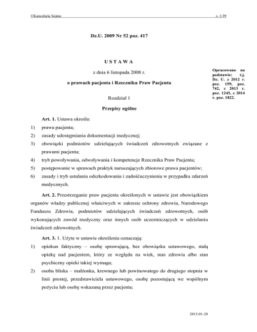 ©Kancelaria Sejmu s. 1/39 Dz.U. 2009 Nr 52 poz. 417 USTAWA Opracowano na podstawie: t.j. Dz. U. z 2012 r. poz. 159, poz. 742, z 2013 r. poz. 1245, z 2014 r. poz. 1822. z dnia 6 listopada 2008 r. o prawach pacjenta i Rzeczniku Praw Pacjenta Rozdział 1 Przepisy ogólne Art. 1. Ustawa określa: 1) prawa pacjenta; 2) zasady udostępniania dokumentacji medycznej; 3) obowiązki podmiotów udzielających świadczeń zdrowotnych związane z prawami pacjenta; 4) tryb powoływania, odwoływania i kompetencje Rzecznika Praw Pacjenta; 5) postępowanie w sprawach praktyk naruszających zbiorowe prawa pacjentów; 6) zasady i tryb ustalania odszkodowania i zadośćuczynienia w przypadku zdarzeń medycznych. Art. 2. Przestrzeganie praw pacjenta określonych w ustawie jest obowiązkiem organów władzy publicznej właściwych w zakresie ochrony zdrowia, Narodowego Funduszu Zdrowia, podmiotów udzielających świadczeń zdrowotnych, osób wykonujących zawód medyczny oraz innych osób uczestniczących w udzielaniu świadczeń zdrowotnych. Art. 3. 1. Użyte w ustawie określenia oznaczają: 1) opiekun faktyczny – osobę sprawującą, bez obowiązku ustawowego, stałą opiekę nad pacjentem, który ze względu na wiek, stan zdrowia albo stan psychiczny opieki takiej wymaga; 2) osoba bliska – małżonka, krewnego lub powinowatego do drugiego stopnia w linii prostej, przedstawiciela ustawowego, osobę pozostającą we wspólnym pożyciu lub osobę wskazaną przez pacjenta; 2015-01-28 ©Kancelaria Sejmu 3) s. 2/39 osoba wykonująca zawód medyczny – osobę wykonującą zawód medyczny, o której mowa w art. 2 ust. 1 pkt 2 ustawy z dnia 15 kwietnia 2011 r. o działalności leczniczej (Dz. U. Nr 112, poz. 654, Nr 149, poz. 887, Nr 174, poz. 1039 i Nr 185, poz. 1092); 4) pacjent – osobę zwracającą się o udzielenie świadczeń zdrowotnych lub korzystającą ze świadczeń zdrowotnych udzielanych przez podmiot udzielający świadczeń zdrowotnych lub osobę wykonującą zawód medyczny; 5) podmiot udzielający świadczeń zdrowotnych – podmiot wykonujący działalność leczniczą, o którym mowa w art. 2 ust. 1 pkt 5 ustawy z dnia 15 kwietnia 2011 r. o działalności leczniczej; 6) świadczenie zdrowotne – świadczenie zdrowotne, o którym mowa w art. 2 ust. 1 pkt 10 ustawy z dnia 15 kwietnia 2011 r. o działalności leczniczej; 7) (uchylony). 2. Ilekroć w ustawie jest mowa o lekarzu, rozumie się przez to także lekarza dentystę oraz felczera w zakresie wynikającym z przepisów o zawodzie felczera. Art. 4. 1. W razie zawinionego naruszenia praw pacjenta sąd może przyznać poszkodowanemu odpowiednią sumę tytułem zadośćuczynienia pieniężnego za doznaną krzywdę na podstawie art. 448 Kodeksu cywilnego. 2. W razie zawinionego naruszenia prawa pacjenta do umierania w spokoju i godności sąd może, na żądanie małżonka, krewnych lub powinowatych do drugiego stopnia w linii prostej lub przedstawiciela ustawowego, zasądzić odpowiednią sumę pieniężną na wskazany przez nich cel społeczny na podstawie art. 448 Kodeksu cywilnego. 3. Przepisu ust. 1 nie stosuje się do zawinionego naruszenia prawa pacjenta do: 1) przechowywania rzeczy wartościowych w depozycie podmiotu leczniczego wykonującego działalność leczniczą w rodzaju stacjonarne i całodobowe świadczenia zdrowotne; 2) informacji o rodzaju i zakresie świadczeń zdrowotnych udzielanych przez podmioty udzielające świadczeń zdrowotnych; 3) dostępu do dokumentacji medycznej dotyczącej jego stanu zdrowia; 4) zgłaszania działań niepożądanych produktów leczniczych. 2015-01-28 ©Kancelaria Sejmu s. 3/39 Art. 5. Kierownik podmiotu udzielającego świadczeń zdrowotnych lub upoważniony przez niego lekarz może ograniczyć korzystanie z praw pacjenta w przypadku wystąpienia zagrożenia epidemicznego lub ze względu na bezpieczeństwo zdrowotne pacjentów, a w przypadku praw, o których mowa w art. 33 ust. 1, także ze względu na możliwości organizacyjne podmiotu. Rozdział 2 Prawo pacjenta do świadczeń zdrowotnych Art. 6. 1. Pacjent ma prawo do świadczeń zdrowotnych odpowiadających wymaganiom aktualnej wiedzy medycznej. 2. Pacjent ma prawo, w sytuacji ograniczonych możliwości udzielenia odpowiednich świadczeń zdrowotnych, do przejrzystej, obiektywnej, opartej na kryteriach medycznych, procedury ustalającej kolejność dostępu do tych świadczeń. 3. Pacjent ma prawo żądać, aby udzielający mu świadczeń zdrowotnych: 1) lekarz zasięgnął opinii innego lekarza lub zwołał konsylium lekarskie; 2) pielęgniarka (położna) zasięgnęła opinii innej pielęgniarki (położnej). 4. Lekarz może odmówić zwołania konsylium lekarskiego lub zasięgnięcia opinii innego lekarza, jeżeli uzna, że żądanie, o którym mowa w ust. 3, jest bezzasadne. 5. Żądanie, o którym mowa w ust. 3, oraz odmowę, o której mowa w ust. 4, odnotowuje się w dokumentacji medycznej. 6. Przepisy ust. 4 i 5 stosuje się do pielęgniarki (położnej) w zakresie zasięgania opinii innej pielęgniarki (położnej). Art. 7. 1. Pacjent ma prawo do natychmiastowego udzielenia świadczeń zdrowotnych ze względu na zagrożenie zdrowia lub życia. 2. W przypadku porodu pacjentka ma prawo do uzyskania świadczeń zdrowotnych związanych z porodem. Art. 8. Pacjent ma prawo do świadczeń zdrowotnych udzielanych z należytą starannością przez podmioty udzielające świadczeń zdrowotnych w warunkach odpowiadających określonym w odrębnych przepisach wymaganiom fachowym i sanitarnym. Przy udzielaniu świadczeń zdrowotnych osoby wykonujące zawód medyczny kierują się zasadami etyki zawodowej określonymi przez właściwe samorządy zawodów medycznych. 2015-01-28 ©Kancelaria Sejmu s. 4/39 Rozdział 3 Prawo pacjenta do informacji Art. 9. 1. Pacjent ma prawo do informacji o swoim stanie zdrowia. 2. Pacjent, w tym małoletni, który ukończył 16 lat, lub jego ustawowy przedstawiciel mają prawo do uzyskania od lekarza przystę