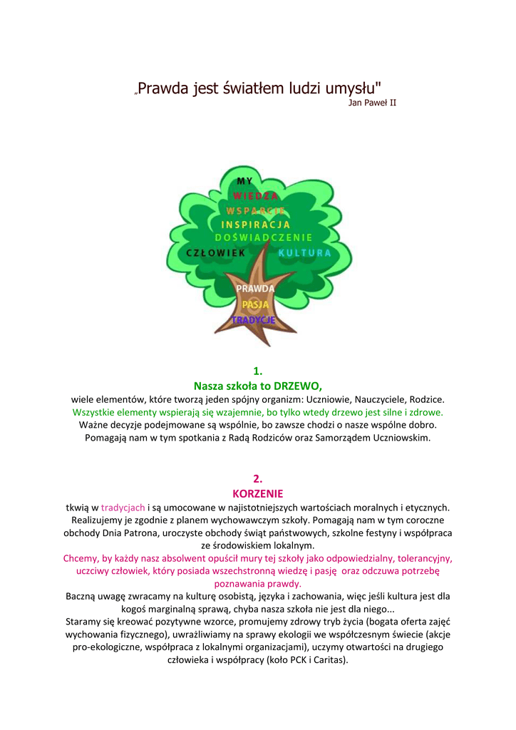 „ Prawda jest światłem ludzi umysłu" Jan Paweł II 1. Nasza szkoła to DRZEWO, wiele elementów, które tworzą jeden spójny organizm: Uczniowie, Nauczyciele, Rodzice. Wszystkie elementy wspierają się wzajemnie, bo tylko wtedy drzewo jest silne i zdrowe. Ważne decyzje podejmowane są wspólnie, bo zawsze chodzi o nasze wspólne dobro. Pomagają nam w tym spotkania z Radą Rodziców oraz Samorządem Uczniowskim. 2. KORZENIE tkwią w tradycjach i są umocowane w najistotniejszych wartościach moralnych i etycznych. Realizujemy je zgodnie z planem wychowawczym szkoły. Pomagają nam w tym coroczne obchody Dnia Patrona, uroczyste obchody świąt państwowych, szkolne festyny i współpraca ze środowiskiem lokalnym. Chcemy, by każdy nasz absolwent opuścił mury tej szkoły jako odpowiedzialny, tolerancyjny, uczciwy człowiek, który posiada wszechstronną wiedzę i pasję oraz odczuwa potrzebę poznawania prawdy. Baczną uwagę zwracamy na kulturę osobistą, języka i zachowania, więc jeśli kultura jest dla kogoś marginalną sprawą, chyba nasza szkoła nie jest dla niego... Staramy się kreować pozytywne wzorce, promujemy zdrowy tryb życia (bogata oferta zajęć wychowania fizycznego), uwrażliwiamy na sprawy ekologii we współczesnym świecie (akcje pro-ekologiczne, współpraca z lokalnymi organizacjami), uczymy otwartości na drugiego człowieka i współpracy (koło PCK i Caritas). Dzięki temu drzewo jest silne. 3. PIEŃ naszego drzewa jest solidny. Tworzą go wykwalifikowani, doświadczeni nauczyciele, dla których praca jest pasją i powołaniem. Nasza kadra nieustannie się kształci i rozwija, każdy chce być specjalistą w swojej dziedzinie. Współpracując ze sobą, osiągamy wysoki poziom nauczania, a także zapewniamy uczniom wszechstronną opiekę specjalistyczną, pedagogiczną, psychologiczną i terapeutyczną, dostosowaną do ich potrzeb. 4. KORONA jest rozłożysta, tworzy ją mnóstwo gałęzi, które sięgają niemal wszędzie, lecz docelowo łączą się w całość, by dać spójny obraz świata i wiedzy. Co to znaczy? Gałęzie to możliwości rozwoju: wiele ścieżek nauki, koła zainteresowań, kluby, akcje organizowane przez szkołę. Celem tych działań jest ukształtowanie pięknego młodego człowieka, którego wiedza byłaby głęboka i uporządkowana. Jak to robimy? Systematyczną pracą staramy się przygotowywać uczniów do dalszych etapów edukacji. Doskonale rozumiemy, że POWINNA BYĆ ONA SPÓJNYM PROCESEM INTERDYSCYPLINARNYM, który jest kontynuowany, a nie - ciągle rozpoczynany od nowa. Poprzez rozwijanie pasji, udział w projektach czy konkursach przedmiotowych kształcimy w uczniach umiejętność samodzielnej i niezależnej pracy, która z pewnością przyda im się w liceum i na studiach. Kładziemy nacisk na wszechstronny rozwój uczniów, co przynosi efekty: od kilku lat wyniki egzaminów plasują nas powyżej średniej krajowej i regionu. „NAUKA TO, W NASZYM WYDANIU, ZESPÓŁ TWIERDZEŃ SPÓJNYCH LOGICZNIE” Nasza MISJA: pozwolić czerpać PĄKOM z silnych i zdrowych KORZENI, by światu dać dojrzałe i pożywne OWOCE.