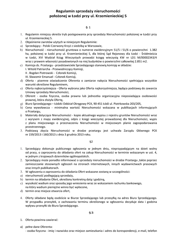 Regulamin sprzedaży nieruchomości położonej w Łodzi przy ul. Krzemienieckiej 5 §1 1. Regulamin niniejszy określa tryb postępowania przy sprzedaży Nieruchomości położonej w Łodzi przy ul. Krzemienieckiej 5. 2. Objaśnienie zwrotów użytych w niniejszym Regulaminie: a) Sprzedający - Polski Czerwony Krzyż z siedzibą w Warszawie, b) Nieruchomość - nieruchomość gruntowa o numerze ewidencyjnym 51/5 i 51/6 o powierzchni 1.382 ha, położonej w Łodzi przy ul. Krzemienieckiej 5, dla której Sąd Rejonowy dla Łodzi - Śródmieścia w Łodzi, XVI Wydział Ksiąg Wieczystych prowadzi księgę wieczystą KW nr LD1 M/00002343/4 wraz z prawem własności posadowionych na niej budynków o powierzchni całkowitej 2.851 m2. c) Komisja ds. Przetargu - przedstawiciele Sprzedającego stanowią komisję w składzie: I. Witold Patriarcha - Przewodniczący Komisji, II . Bogdan Piotrowski - Członek Komisji, III. Sławomir Emanuel - Członek Komisji, d) Oferta - pisemne oświadczenie Oferenta o zamiarze nabycia Nieruchomości spełniająca wszystkie warunki określone Regulaminem, e) Oferta najkorzystniejsza - Oferta wybrana jako Oferta najkorzystniejsza, będąca podstawą do zawarcia Umowy sprzedaży Nieruchomości, f) Oferent - osoba fizyczna, osoba prawna lub jednostka organizacyjna nieposiadająca osobowości prawnej, która złożyła Ofertę, g) Biuro Sprzedającego – Łódzki Oddział Okręgowy PCK, 90-451 Łódź ul. Piotrkowska 203/205, h) Cena wywoławcza - minimalna wartość Nieruchomości wskazana w publikacjach informujących o Przetargu, i) Materiały dotyczące Nieruchomości - kopie aktualnego wypisu z rejestru gruntów Nieruchomości wraz z wyrysem z mapy ewidencyjnej, odpis z księgi wieczystej prowadzonej dla Nieruchomości, wypis z planu miejscowego o przeznaczeniu Nieruchomości w miejscowym planie zagospodarowania przestrzennego. 3. Podstawą zbycia Nieruchomości w drodze przetargu jest uchwała Zarządu Głównego PCK nr 159/2013 i 160/2013 z dnia 3 grudnia 2013 roku. §2 1. Sprzedający dokonuje publicznego ogłoszenia w jednym dniu, nieprzypadającym na dzień wolny od pracy, o zaproszeniu do składania ofert na zakup Nieruchomości w terminie wskazanym w ust. 4, w jednym z krajowych dzienników ogólnopolskich. 2. Sprzedający może ponadto informować o sprzedaży nieruchomości w drodze Przetargu ,także poprzez zamieszczanie stosownych ogłoszeń na stronach internetowych, innych wydawnictwach prasowych oraz innych publikatorach. 3. W ogłoszeniu o zaproszeniu do składania Ofert wskazane zostaną w szczególności: a) nieruchomość podlegającą sprzedaży, b) termin na składanie Ofert, określony konkretną datą i godziną, c) wysokość wadium oraz sposoby jego wniesienia wraz ze wskazaniem rachunku bankowego, na który wadium pieniężne winno być wpłacone, d) termin oraz miejsce otwarcia ofert, 4. Oferty składane będą osobiście w Biurze Sprzedającego lub przesyłką na adres Biura Sprzedającego. W przypadku przesyłek, o zachowaniu terminu określonego w ogłoszeniu decyduje data i godzina wpływu przesyłki do Biura Sprzedającego. §3 1. Oferta powinna zawierać: a) pełne dane Oferenta: - osoba fizyczna - imię i nazwisko oraz miejsce zamieszkania i adres do korespondencji, e-mail, telefon kontaktowy oraz PESEL i NIP, - przedsiębiorca będący osobą fizyczną prowadzącą działalność gospodarczą - imię i nazwisko oraz miejsce zamieszkania i adres do korespondencji, nawę firmy, nr wpisu do ewidencji działalności gospodarczej, nazwę organu prowadzącego ewidencję, e-mail, telefon kontaktowy oraz PESEL, NIP, REGON, - jednostka organizacyjna nieposiadająca osobowości prawnej - dane wspólników (dla osób fizycznych, przedsiębiorców będących osobami fizycznymi, osoby prawnej wg wytycznych z niniejszego punktu), NIP, REGON, - osoba prawna - firmę, siedzibę i adres do korespondencji, e-mail, telefon kontaktowy oraz NIP i REGON, nr KRS; b) c) d) e) f) 2. a) b) c) d) e) f) g) 3. 4. 5. 6. 7. 8. datę sporządzenia Oferty, określenie przedmiotu sprzedaży, którego dotyczy Oferta, proponowaną cenę nabycia Nieruchomości, nie niższą od ceny wywoławczej, wskazanie okresu związania Ofertą, nie krótszego niż 3 miesiące. wskazanie innej niż organ upoważniony do reprezentowania Oferenta osoby (osób) upoważnionych do kontaktów w sprawie Oferty i podstaw jej umocowania. Do Oferty należy dołączyć: oryginał dokumentu potwierdzający wniesienie Wadium, dokumenty określające status prawny Oferenta oraz sposób jego reprezentacji, oświadczenie Oferenta zawierające informacje, czy oferent jest cudzoziemcem w rozumieniu przepisów ustawy z dnia 24 marca 1920 r. wraz z późniejszymi zmianami o nabywaniu nieruchomości przez cudzoziemców, w przypadku osób prawnych - oświadczenie Oferenta, że do dokonania nabycia Nieruchomości nie jest wymagana zgoda jakiegokolwiek organu tej osoby prawnej lub gdy taka zgoda jakiegokolwiek organu tej osoby prawnej jest wymagana - dokument zawierający zgodę na dokonanie nabycia Nieruchomości albo oświadczenie Oferenta, że wymagane zgody zostaną przedłożone przed terminem wyznaczonym do zawarcia Umowy sprzedaży w formie aktu notarialnego, pod rygorem uznania nie dopełnienia tego obowiązku za przyczynę nie zawarcia Umowy sprzedaży z przyczyn dotyczących Oferenta, ze skutkiem opisanym w § 4 ust. 7 Regulaminu, w przypadku osoby fizycznej lub przedsiębiorcy będącego osobą fizyczną prowadzącą działalność gospodarczą lub jednostki organizacyjnej nieposiadającej osobowości prawnej, w której chociaż jeden wspólnik jest osobą fizyczną lub przedsiębiorcą będącym osobą fizyczną prowadzącą działalność gospodarczą - oświadczenie, że Oferent lub wspólnik nie pozostaje w związku małżeńskim, a jeżeli Oferent pozostaje w związku małżeńskim, dokument zawierający zgodę współmałżonka na dokonanie nabycia Nieruchomości, w formie pisemnej z p