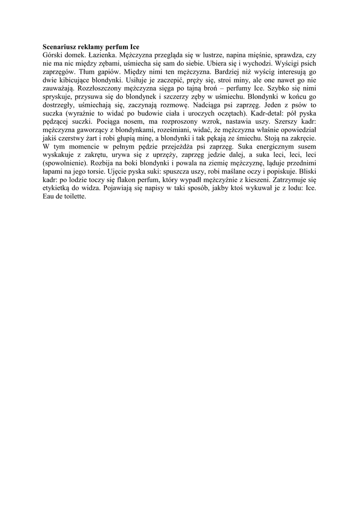 Scenariusz reklamy perfum Ice Górski domek. Łazienka. Mężczyzna przegląda się w lustrze, napina mięśnie, sprawdza, czy nie ma nic między zębami, uśmiecha się sam do siebie. Ubiera się i wychodzi. Wyścigi psich zaprzęgów. Tłum gapiów. Między nimi ten mężczyzna. Bardziej niż wyścig interesują go dwie kibicujące blondynki. Usiłuje je zaczepić, pręży się, stroi miny, ale one nawet go nie zauważają. Rozzłoszczony mężczyzna sięga po tajną broń – perfumy Ice. Szybko się nimi spryskuje, przysuwa się do blondynek i szczerzy zęby w uśmiechu. Blondynki w końcu go dostrzegły, uśmiechają się, zaczynają rozmowę. Nadciąga psi zaprzęg. Jeden z psów to suczka (wyraźnie to widać po budowie ciała i uroczych oczętach). Kadr-detal: pół pyska pędzącej suczki. Pociąga nosem, ma rozproszony wzrok, nastawia uszy. Szerszy kadr: mężczyzna gaworzący z blondynkami, roześmiani, widać, że mężczyzna właśnie opowiedział jakiś czerstwy żart i robi głupią minę, a blondynki i tak pękają ze śmiechu. Stoją na zakręcie. W tym momencie w pełnym pędzie przejeżdża psi zaprzęg. Suka energicznym susem wyskakuje z zakrętu, urywa się z uprzęży, zaprzęg jedzie dalej, a suka leci, leci, leci (spowolnienie). Rozbija na boki blondynki i powala na ziemię mężczyznę, ląduje przednimi łapami na jego torsie. Ujęcie pyska suki: spuszcza uszy, robi maślane oczy i popiskuje. Bliski kadr: po lodzie toczy się flakon perfum, który wypadł mężczyźnie z kieszeni. Zatrzymuje się etykietką do widza. Pojawiają się napisy w taki sposób, jakby ktoś wykuwał je z lodu: Ice. Eau de toilette.