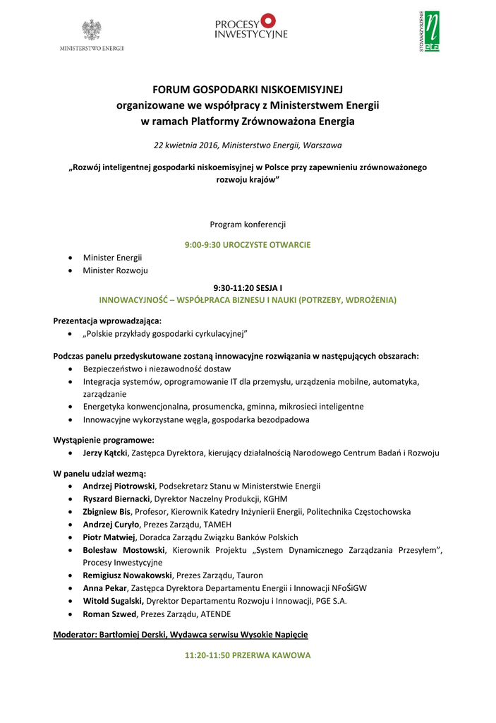 FORUM GOSPODARKI NISKOEMISYJNEJ organizowane we współpracy z Ministerstwem Energii w ramach Platformy Zrównoważona Energia 22 kwietnia 2016, Ministerstwo Energii, Warszawa „Rozwój inteligentnej gospodarki niskoemisyjnej w Polsce przy zapewnieniu zrównoważonego rozwoju krajów” Program konferencji 9:00-9:30 UROCZYSTE OTWARCIE Minister Energii Minister Rozwoju 9:30-11:20 SESJA I INNOWACYJNOŚĆ – WSPÓŁPRACA BIZNESU I NAUKI (POTRZEBY, WDROŻENIA) Prezentacja wprowadzająca: „Polskie przykłady gospodarki cyrkulacyjnej” Podczas panelu przedyskutowane zostaną innowacyjne rozwiązania w następujących obszarach: Bezpieczeństwo i niezawodność dostaw Integracja systemów, oprogramowanie IT dla przemysłu, urządzenia mobilne, automatyka, zarządzanie Energetyka konwencjonalna, prosumencka, gminna, mikrosieci inteligentne Innowacyjne wykorzystane węgla, gospodarka bezodpadowa Wystąpienie programowe: Jerzy Kątcki, Zastępca Dyrektora, kierujący działalnością Narodowego Centrum Badań i Rozwoju W panelu udział wezmą: Andrzej Piotrowski, Podsekretarz Stanu w Ministerstwie Energii Ryszard Biernacki, Dyrektor Naczelny Produkcji, KGHM Zbigniew Bis, Profesor, Kierownik Katedry Inżynierii Energii, Politechnika Częstochowska Andrzej Curyło, Prezes Zarządu, TAMEH Piotr Matwiej, Doradca Zarządu Związku Banków Polskich Bolesław Mostowski, Kierownik Projektu „System Dynamicznego Zarządzania Przesyłem”, Procesy Inwestycyjne Remigiusz Nowakowski, Prezes Zarządu, Tauron Anna Pekar, Zastępca Dyrektora Departamentu Energii i Innowacji NFoŚiGW Witold Sugalski, Dyrektor Departamentu Rozwoju i Innowacji, PGE S.A. Roman Szwed, Prezes Zarządu, ATENDE Moderator: Bartłomiej Derski, Wydawca serwisu Wysokie Napięcie 11:20-11:50 PRZERWA KAWOWA 11:50-13:30 SESJA II INTELIGENTNE SIECI W GOSPODARCE NISKOEMISYJNEJ Prezentacja wprowadzająca: „Rozwiązania Smart Grid w obszarze Internetu Rzeczy” Podczas panelu przedyskutowane zostaną następujące kwestie: Elastyczna i optymalna rozbudowa sieci, eksploatacja i sterowanie Odbiorcy przemysłowi i energetyka, zarzadzanie popytem Dynamiczne zarządzanie siecią i mocą Bilansowanie lokalne Sposoby finansowania W panelu udział wezmą: Andrzej Piotrowski, Podsekretarz Stanu w Ministerstwie Energii, Andrzej Curyło, Prezes Zarządu, TAMEH, Wojciech Drożdż, Prezes ds. Ekonomiczno-Finansowych, Enea Operator, Krzysztof Kołodziejczyk, Dyrektor ds. Rozwoju Biznesu Utilities, Globema, Lidia Kozłowska, Zastępca Prezesa, Urząd Komunikacji Elektronicznej, Grzegorz Nowaczewski, Prezes Zarządu, Virtual Power Plant, Krzysztof Perlicki, Profesor, Wydział Elektroniki i Technik Informacyjnych, Politechnika Warszawska, Andrzej Słodczyk, Wiceprezes Zarządu, Atende, Robert Stelmaszczyk, Prezes PTPiREE, Roman Targosz, Dyrektor ds. Projektów Energetycznych, Europejski Instytut Miedzi, Robert Zasina, Prezes Zarządu, Tauron Dystrybucja Moderator: Bartłomiej Derski, Wydawca serwisu Wysokie Napięcie 13:30-14:00 PRZERWA NA POCZĘSTUNEK 14:00-15:40 SESJA III ENERGETYKA ROZPROSZONA I KONWENCJONALNA A BEZPIECZEŃSTWO SYSTEMU ENERGETYCZNEGO Podczas panelu przedyskutowane zostaną następujące kwestie: Regionalne bezpieczeństwo energetyczne, plan Unii Wymiana transgraniczna energii i usługi sieciowe Uwarunkowania rozwojowe dedykowane dla energetyki rozproszonej i rozwiązań prosumenckich Elektrownie konwencjonalne i energetyka rozproszona na rzecz bezpieczeństwa energetycznego Czynniki energetycznego rozwoju lokalnego W panelu udział wezmą: Halina Bownik-Trymucha, Przewodnicząca Rady Programowej, Procesy Inwestycyjne, Ireneusz Łazor, Prezes Zarządu Towarowej Giełdy Energii, Henryk Majchrzak, Przewodniczący Polskiego Komitetu Światowej Rady Energetycznej, Stanisław Poręba, Partner, EY, Konstantin Staschus, Sekretarz Generalny, ENTSO-E, Daivis Virbickas, Prezes Zarządu, Litgrid Moderator: Wojciech Jakóbik, Redaktor Naczelny, Biznes Alert *Konferencję zorganizowano w ramach Projektu SDZP dofinansowanego ze środków Narodowego Centrum Badań i Rozwoju oraz Narodowego Funduszu Ochrony Środowiska i Gospodarki Wodnej w ramach programu „Gekon”.