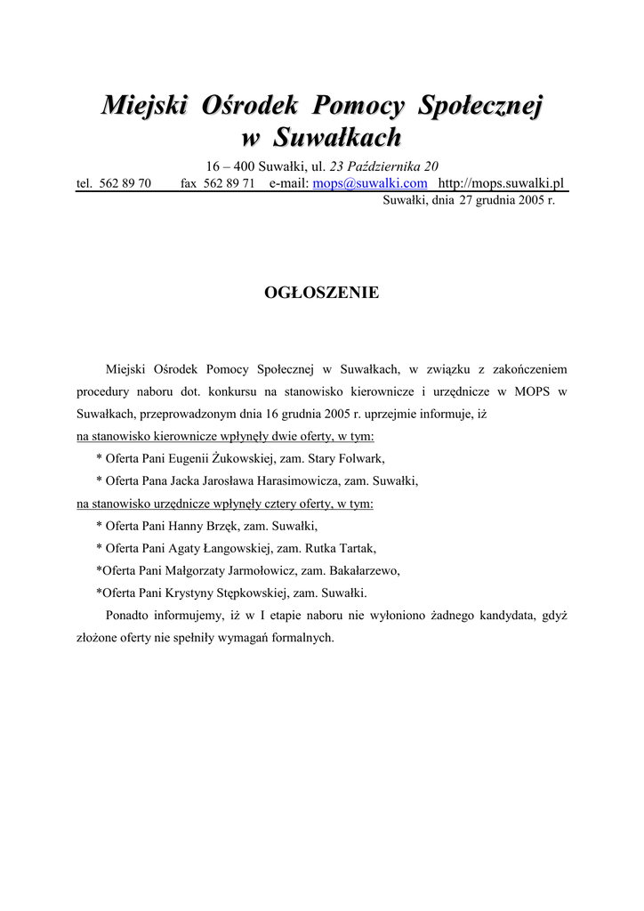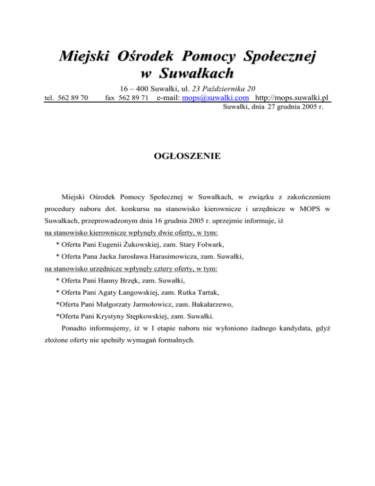 Miejski Ośrodek Pomocy Społecznej w Suwałkach tel. 562 89 70 16 – 400 Suwałki, ul. 23 Października 20 fax 562 89 71 e-mail: [email protected] http://mops.suwalki.pl Suwałki, dnia 27 grudnia 2005 r. OGŁOSZENIE Miejski Ośrodek Pomocy Społecznej w Suwałkach, w związku z zakończeniem procedury naboru dot. konkursu na stanowisko kierownicze i urzędnicze w MOPS w Suwałkach, przeprowadzonym dnia 16 grudnia 2005 r. uprzejmie informuje, iŜ na stanowisko kierownicze wpłynęły dwie oferty, w tym: * Oferta Pani Eugenii śukowskiej, zam. Stary Folwark, * Oferta Pana Jacka Jarosława Harasimowicza, zam. Suwałki, na stanowisko urzędnicze wpłynęły cztery oferty, w tym: * Oferta Pani Hanny Brzęk, zam. Suwałki, * Oferta Pani Agaty Łangowskiej, zam. Rutka Tartak, *Oferta Pani Małgorzaty Jarmołowicz, zam. Bakałarzewo, *Oferta Pani Krystyny Stępkowskiej, zam. Suwałki. Ponadto informujemy, iŜ w I etapie naboru nie wyłoniono Ŝadnego kandydata, gdyŜ złoŜone oferty nie spełniły wymagań formalnych.