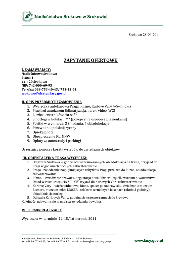 Nadleśnictwo Srokowo w Srokowie Srokowo 28-04-2011 ZAPYTANIE OFERTOWE I. ZAMAWIAJĄCY: Nadleśnictwo Srokowo Leśna 1 11-420 Srokowo NIP: 742-000-69-93 Tel/fax: 089-753-40-43/ 753-42-61 [email protected] II. OPIS PRZEDMIOTU ZAMÓWIENIA 1. Wycieczka autokarowa Praga, Pilzno, Karlove Vary 4-5-dniowa 2. Przejazd autokarem (klimatyzacja, barek, video, WC) 3. Liczba uczestników: 40 osób 4. 3 noclegi w hotelach *** (pokoje 2 i 3 osobowe z łazienkami) 5. Posiłki w wymiarze: 3 śniadania, 4 obiadokolacje 6. Przewodnik polskojęzyczny 7. Opieka pilota 8. Ubezpieczenie KL, NNW 9. Opłaty za autostrady i parkingi Uczestnicy ponoszą koszty wstępów do zwiedzanych obiektów III. ORIENTACYJNA TRASA WYCIECZKI: 1. Odjazd ze Srokowa w godzinach wczesno-rannych, obiadokolacja na trasie, przyjazd do Pragi w godzinach nocnych, zakwaterowanie 2. Praga - zwiedzanie najpiękniejszych zabytków Pragi przejazd do Pilzna, obiadokolacja zakwaterowanie 3. Pilzno – zwiedzanie browaru, degustacja piwa Pilzner Urquell, muzeum piwowarstwa, Obiad w restauracji „NA SPILCE” wyjazd do Karlovych Var i zakwaterowanie 4. Karlove Vary – wieża widokowa, Diana, spacer po uzdrowisku, zwiedzanie muzeum Bechera, muzeum szkła MOSER, relaks w termalnych basenach (około 3 godziny) obiadokolacja nocleg 5. Odjazd z Karlovych Var w godzinach wczesno-rannych do Srokowa Kolejność udawania się w miejsca zwiedzania dowolna. IV. TERMIN REALIZACJI: Wycieczka w terminie 12-15/16 sierpnia 2011 Nadleśnictwo Srokowo w Srokowie, ul. Leśna 1, 11-420 Srokowo tel.: +48 89 753 40 43, fax: +48 89 753 42 61, e-mail: [email protected] www.lasy.gov.pl Nadleśnictwo Srokowo w Srokowie V. KRYTERIUM WYBORU OFERTY: 1. Cena oferty (brutto) - znaczenie 100 % 2. Przy określaniu całkowitej ceny ofertowej brutto wycieczki należy wziąć pod uwagę opis przedmiotu zamówienia 3. Integralna częścią oferty jest wzór umowy do zaakceptowania przez zamawiającego oraz szczegółowy program wycieczki. Należy uwzględnić ewentualne inne koszty niezbędne do realizacji zamówienia. VI. MIEJSCE I TERMIN ZŁOŻENIA OFERTY: Ofertę należy złożyć w terminie do dnia 01 czerwca 2011 r. do godz. 15:00 droga mailową lub tradycyjnie pocztą na adres: NADLEŚNICTWO SROKOWO LEŚNA 1 11-420 SROKOWO [email protected] VII. ZAPYTANIA O PRZEDMIOT ZAMÓWIENIA: Wszelkich informacji dotyczących przedmiotu zamówienia udziela: Jolanta Kowalska tel. (89) 753-40-43 e-mail: [email protected] Lucyna Gąsiorek-Stypik - tel. (89)753-47-98 mail: [email protected] Nadleśnictwo Srokowo w Srokowie, ul. Leśna 1, 11-420 Srokowo tel.: +48 89 753 40 43, fax: +48 89 753 42 61, e-mail: [email protected] www.lasy.gov.pl