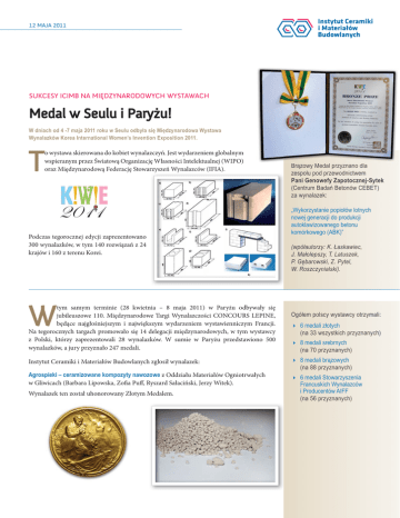 12 MAJA 2011 SUKCESY ICIMB NA MIĘDZYNARODOWYCH WYSTAWACH Medal w Seulu i Paryżu! W dniach od 4 -7 maja 2011 roku w Seulu odbyła się Międzynarodowa Wystawa Wynalazków Korea International Women’s Invention Exposition 2011. T o wystawa skierowana do kobiet wynalazczyń. Jest wydarzeniem globalnym wspieranym przez Światową Organizację Własności Intelektualnej (WIPO) oraz Międzynarodową Federację Stowarzyszeń Wynalazców (IFIA). Podczas tegorocznej edycji zaprezentowano 300 wynalazków, w tym 140 rozwiązań z 24 krajów i 160 z terenu Korei. W tym samym terminie (28 kwietnia – 8 maja 2011) w Paryżu odbywały się jubileuszowe 110. Międzynarodowe Targi Wynalazczości CONCOURS LEPINE, będące najgłośniejszym i największym wydarzeniem wystawienniczym Francji. Na tegorocznych targach promowało się 14 delegacji międzynarodowych, w tym wystawcy z Polski, którzy zaprezentowali 28 wynalazków. W sumie w Paryżu przedstawiono 500 wynalazków, a jury przyznało 247 medali. Brązowy Medal przyznano dla zespołu pod przewodnictwem Pani Genowefy Zapotocznej-Sytek (Centrum Badań Betonów CEBET) za wynalazek: „Wykorzystanie popiołów lotnych nowej generacji do produkcji autoklawizowanego betonu komórkowego (ABK)” (wpółautorzy: K. Łaskawiec, J. Małolepszy, T. Latuszek, P. Gębarowski, Z. Pytel, W. Roszczynialski). Ogółem polscy wystawcy otrzymali: 6 medali złotych (na 33 wszystkich przyznanych) 8 medali srebrnych (na 70 przyznanych) Instytut Ceramiki i Materiałów Budowlanych zgłosił wynalazek: 8 medali brązowych (na 88 przyznanych) Agrospieki – ceramizowane kompozyty nawozowe z Oddziału Materiałów Ogniotrwałych w Gliwicach (Barbara Lipowska, Zofia Puff, Ryszard Sałaciński, Jerzy Witek). 6 medali Stowarzyszenia Francuskich Wynalazców i Producentów AIFF (na 56 przyznanych) Wynalazek ten został uhonorowany Złotym Medalem.