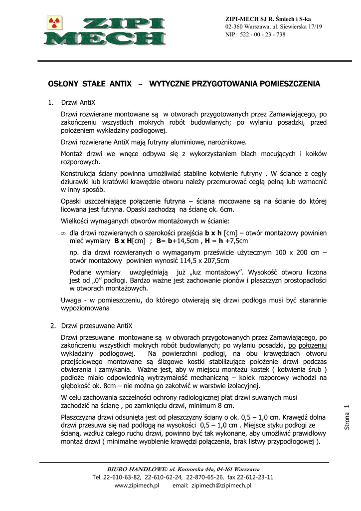 ZIPI-MECH SJ R. Śmiech i S-ka 02-360 Warszawa, ul. Siewierska 17/19 NIP: 522 - 00 - 23 - 738 OSŁONY STAŁE ANTIX – WYTYCZNE PRZYGOTOWANIA POMIESZCZENIA 1. Drzwi AntiX Drzwi rozwierane montowane są w otworach przygotowanych przez Zamawiającego, po zakończeniu wszystkich mokrych robót budowlanych; po wylaniu posadzki, przed położeniem wykładziny podłogowej. Drzwi rozwierane AntiX mają futryny aluminiowe, narożnikowe. Montaż drzwi we wnęce odbywa się z wykorzystaniem blach mocujących i kołków rozporowych. Konstrukcja ściany powinna umożliwiać stabilne kotwienie futryny . W ściance z cegły dziurawki lub kratówki krawędzie otworu należy przemurować cegłą pełną lub wzmocnić w inny sposób. Opaski uszczelniające połączenie futryna – ściana mocowane są na ścianie do której licowana jest futryna. Opaski zachodzą na ścianę ok. 6cm. Wielkości wymaganych otworów montażowych w ścianie: • dla drzwi rozwieranych o szerokości przejścia b x h [cm] – otwór montażowy powinien mieć wymiary B x H[cm] ; B= b+14,5cm , H = h +7,5cm np. dla drzwi rozwieranych o wymaganym prześwicie użytecznym 100 x 200 cm – otwór montażowy powinien wynosić 114,5 x 207,5cm Podane wymiary uwzględniają już „luz montażowy”. Wysokość otworu liczona jest od „0” podłogi. Bardzo ważne jest zachowanie pionów i płaszczyzn prostopadłości w otworach montażowych. Uwaga - w pomieszczeniu, do którego otwierają się drzwi podłoga musi być starannie wypoziomowana 2. Drzwi przesuwane AntiX W celu zachowania szczelności ochrony radiologicznej płat drzwi suwanych musi zachodzić na ścianę , po zamknięciu drzwi, minimum 8 cm. Płaszczyzna drzwi odsunięta jest od płaszczyzny ściany o ok. 0,5 – 1,0 cm. Krawędź dolna drzwi przesuwa się nad podłogą na wysokości 0,5 – 1,0 cm . Miejsce styku podłogi ze ścianą, wzdłuż całego ruchu drzwi, powinno być tak wykonane, aby umożliwić prawidłowy montaż drzwi ( minimalne wyoblenie krawędzi połączenia, brak listwy przypodłogowej ). BIURO HANDLOWE: ul. Komorska 44a, 04-161 Warszawa Tel. 22-610-63-82, 22-610-62-24, 22-870-65-26, fax 22-612-23-11 www.zipimech.pl email: [email protected] Strona 1 Drzwi przesuwane montowane są w otworach przygotowanych przez Zamawiającego, po zakończeniu wszystkich mokrych robót budowlanych; po wylaniu posadzki, po położeniu wykładziny podłogowej. Na powierzchni podłogi, na obu krawędziach otworu przejściowego montowane są ślizgowe kostki stabilizujące położenie drzwi podczas otwierania i zamykania. Ważne jest, aby w miejscu montażu kostek ( kotwienia śrub ) podłoże miało odpowiednią wytrzymałość mechaniczną – kołek rozporowy wchodzi na głębokość ok. 8cm – nie można go zakotwić w warstwie izolacyjnej. Wielkości wymaganych otworów montażowych pod drzwi przesuwane otwierane ręcznie: • dla drzwi przesuwanych o szerokości przejścia b x h [cm] – otwór montażowy powinien mieć wymiary B x H[cm] ; B= b+15cm , H = h cm np. wymiary otworu montażowego pod drzwi przesuwane ręcznie o prześwicie użytecznym 100x200cm wynoszą 115 x 200 cm. Otwór montażowy można wykończyć na gotowo przed montażem drzwi. Przy całkowitym otwarciu drzwi przesuwanych ręczne część płata drzwiowego z wystającym pochwytem przesłania światło otworu. Wielkości wymaganych otworów montażowych pod drzwi przesuwane z napędem: • dla drzwi przesuwanych elektrycznie o szerokości przejścia b x h [cm] – otwór montażowy powinien mieć wymiary B x H[cm] ; B= b+4cm , H = h+2 cm. Zaleca się stosowanie napędu elektrycznego dla drzwi o wadze powyżej 70 kg. Wykonanie okablowania zasilającego i sterującego leży o stronie Zamawiającego (wg. wytycznych dostawcy drzwi). Konstrukcja ściany, na której powieszone będą drzwi musi umożliwiać stabilne zakotwienie szyny nośnej. W pasie montażu szyny nie mogą przebiegać żadne instalacje techniczne. 3. Okno wglądowe AntiX Okno stałe między sterownią a gabinetem badań montowane jest w otworze przygotowanym przez Zamawiającego. Okno AntiX ma futrynę skrzynkową , obejmującą mur. Futryna wykonana jest z płyt AntiX i kształtowników aluminiowych. Wielkości wymaganego otworu montażowego w ścianie: • wielkość otworu montażowego zależy od wymiarów zastosowanej szyby ołowiowej. • dla szyby o wymiarach b x h [cm] – otwór montażowy powinien mieć wymiary B x H[cm] ; B= b+6 cm , H = h +6 cm np. dla okna z szybą 100 x 80cm – otwór montażowy powinien wynosić 106 x 86cm Panele ścienne AntiX Panele mocowane są poprzez system aluminiowych kształtowników bezpośrednio • do konstrukcji ściany murowanej. Pomieszczenia nie muszą być tynkowane, a dopuszczalne odchylenie od pionu i poziomu nie mogą przekraczać typowych wartości do muru spoinowanego. • do stalowej konstrukcji szkieletowej – dla ścianek typu lekkiego wykonywanych w systemie suchej zabudowy. Do konstrukcji szkieletu nośnego ścian typu lekkiego stosować typowe kształtowniki stalowe jak do ścianek typu gips-karton. Rozstaw szprosów pionowych – typowy, co ok. 60cm. Dodatkowo należy położyć szprosy poziome na wysokości: 0 cm, 100 cm, 195 cm, 210 cm od poziomu podłogi i pod sufitem. Otwory montażowe pod stolarkę wzmocnionym ( perforowanym ). otworową obramować ceownikiem BIURO HANDLOWE: ul. Komorska 44a, 04-161 Warszawa Tel. 22-610-63-82, 22-610-62-24, 22-870-65-26, fax 22-612-23-11 www.zipimech.pl email: [email protected] stalowym Strona 2 4. 4.1. Instalacje elektryczne i techniczne na ścianach: Przed położeniem paneli AntiX na ściany należy rozprowadzić instalacje elektryczne. W miejscach docelowego montażu gniazd elektrycznych i wyłączników wykuć w ścianie gniazdo pod puszkę i pozostawić zapas przewodu z luźno zawieszoną na przewodzie puszką. Puszki zostaną osadzone w ścianie w trakcie montażu paneli AntiX. Gniazdo pod puszką zostanie zabezpieczone ołowiem.