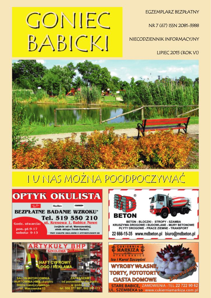 Adres wydawcy (redakcji): PUNKT REDAKCYJNY: Księgarnia "VERBUM" - Stare Babice, ul. Rynek 17 Redaguje Zespół w składzie: Michał Starnowski oraz Dariusz Smoliński, Tomasz Szuba i Piotr Dąbrowski Autor zdjęcia na okładce: Michał Starnowski ZGŁOSZENIA REKLAMOWE I OGŁOSZENIOWE: tel. 796-920-796; 796-020;796 lub [email protected] lub [email protected] Skład: ; Konto: mbank Druk: WAKACYJNA REKREACJA W BABICACH Sezon wakacyjny w pełni, pogoda dopisuje, wielu z nas właśnie wróciło z letnich wyjazdów lub dopiero je planuje. Jeśli nie zamierzamy wybrać się gdzieś dalej, w przyjemny i ciekawy sposób możemy spędzić czas w różnych miejscach na terenie naszej gminy i okolic. Postaramy się podrzucić Państwu kilka pomysłów. spacerując po Budzie zobaczymy gęsi, kozy i owieczki siłownia plenerowa w Latchorzewie. na tyłach kawiarni Czubak i Biblioteki Publicznej Zawsze otwarte są dla nas drzwi Puszczy Kampinoskiej pozostaje odpoczynek na Polanie Dwóch Stawów w Zielonkach Parcela, na Skwerze im. Chopina w Borzęcinie Dużym, przy stawie w Latchorzewie lub w Bliznem Naszą wyprawę możemy zacząć Polana w Lipkowie i Park za babickim kościołem. Ewa Ugorowska KSIĘGARNIA "VERBUM" POLECA... Marcin Wójcik - zawieszony na studiach za podrobienie podpisu. Zagrał kiedyś w teatrze rolę pół człowieka - pół pompki. Michał Wójcik - nie lubi szpitali, bo za dużo razy w nich przebywał. Lubi za to tatuaże. A poza tym wcale nie ma na imię Michał. Waldemar Wilkołek - musi się wyspać. Każdy Ryjek kosztuje go pięć lat życia. Występy w Ani Mru-Mru zaczął od grania na brzuchu. W samym środku wakacji coś "lekkostrawnego" ;-)… ANI MRU MRU O DWÓCH TAKICH CO BYŁO ICH TRZECH. kabaret. To zjawisko. Od 15 lat rozśmieszają miliony Polaków, Ani Mru-Mru to nie zwyczajny "Gdybyśmy byli początkującym kaba retem, a któryś z nas zapomniałby skeczu, dwóch pozostałych zrobiłoby wszystko, żeby go uratować. Po piętnastu latach na scenie, gdy widzimy kolegę stojącego - umownie - nad takim wiel kim szambem, to nas tak bawi, że po prostu trzeba podejść i go pchnąć. Zrobimy wszystko, żeby go pogrążyć." VERBUM BONUS: Gazety Babickiej w artykule podpisanym przez Pana Wójta, "lokalnego (-EJ) poety (-KI)": Drodzy klienci. Zrobimy to za Was. Wszystkie dostępne tytuły do szkoły podstawowej, gimnazjum, liceum, technikum a także zbiory zadań i arkuszy maturalnych, przygotujemy do odbioru w cią gu 24-48h. Przypominamy także, że w naszej księgarni działa CompNET Kontakt pod nr. tel. 602-799-668, www.peceserwis.pl. Dariusz Smoliński SHOEFITI - BUTY NA NIEBIE Czy zdarzyło się Wam kiedyś zobaczyć buty wiszące na sznurowadłach w różnych abstrakcyjnych miejscach - np. na liniach tele graficznych? Ich położenie w takich sytuacjach trudno nazwać przypadkowym a wiele osób nie mając wiedzy na temat tego symbolu podejrzewa, że to wandalizm, efekt głupiej zabawy lub dziwna instalacja artystyczna. Według pewnej legendy miejskiej jest to zjawisko nazywane "shoefiti". Dlaczego? na ulicy Ogrodniczej od lat na liniach telegraficznych unosi się para starych, znoszonych trampek. Ewa Ugorowska fot. Michał Starnowski (Babice Nowe) KONKURS NASZEGO NIECODZIENNIKA Uwaga, uwaga!!! Kolejna odsłona Naszego konkursu. do mieszkańca Klaudyna (ul. Lutosławskiego). zgłosił się w dniach 17-22 sierpnia 2015 roku Nasz konkurs, to wspaniała okazja do skorzystania z oferty Księgarni "Verbum" (kwota 50 zł.) i Tabliczek na Twoją Miarę (60 zł.). tabliczka niestety pozostała w Naszych rękach, choć powinna trafić SAMORZĄD MOIM RÓWIEŚNIKIEM Szkoda, że nie pamiętam tego dnia. 4 czerwca 1989 roku, prawie wolne wybory, ale pełne zwycięstwo wolności. "Solidarność" zadała komunistycznym władzom polityczny nokaut. 99% miejsc w Senacie i wszystkie 161 mandatów poselskich, o które mogli ubiegać się kandydaci bezpartyjni! Ten dzień zmienił nie tylko Polskę, ale i kawałek świata. Był to impuls do dalszych zmian w Polsce i Europie. Dopełnieniem reformy samorządowej to bezpośrednie wybory wójtów, burmistrzów i prezydentów miast. Pierwsze takie bezpośrednie wybory odbyły się w 2002 roku. Reforma odmieniła oblicze Polski. Władza dana mieszkańcom dała początek myślenia globalnego, a działania lokalnego. Reforma samorządowa realizowana była w dwóch etapach W miejsce istniejących w PRL rad narodowych wprowadzono rady gmin o znacznie szerszych uprawnieniach. powiaty i samorządowe województwa. Autorzy przepisów o samorządzie wraz z parlamentarzystami otwo rzyli bardzo ważny rozdział w budowaniu naszego kraju. Kinga Gajewska - Radna Sejmiku Województwa Mazowieckiego DOROTA SMOLIŃSKA PONOWNIE DYREKTOREM BABICKIEJ SZKOŁY 30 czerwca 2015 roku odbył się konkurs na stanowisko Dyrektora Szkoły Podstawowej w Starych Babicach do którego stanęło troje kandydatów, w tym obecna Dyrektor Dorota Smolińska. W wyniku głosowania Komisja Konkursowa powołała na przedmiotowe stanowisko dotychczasową Dyrektor Panią Dorotę Smoliń ską. Redakcja Gońca Babickiego serdecznie gra tuluje Pani Dyrektor. fot. Michał Starnowski JUŻ NIEDŁUGO ŚWIATEŁKA OKREŚLĄ TWOJĄ PRĘDKOŚĆ Coraz bliżej do uruchomienia świateł ostrzegawczo-informacyjnych na ul. Sienkiewicza w Starych Babicach. Jak już informowaliśmy wcześniej, na ulicy Sienkiewicza w Starych Babicach, w szczególności w okolicach sklepów Zefirek i Marcpol pojawiły się znaki informujące o możliwej kontroli fotoradarowej. Michał Starnowski TYMCZASEM NA LIPKOWSKIEJ POLANIE Od 2014 r. trwają prace związane z realizacją projektu "Budowa infrastruktury turystycznej na polanie Lipków - ograniczenie antropopresji na ekosystemy KPN" (POIS.05.01.00-00-460/12). Celem projektu jest ukierunkowanie ruchu turystycznego południowo-wschodniej części Kampinoskiego Parku Narodowego, stanowiącego jednocześnie obszar Natura 2000 PLC140001 "Puszcza Kampinoska", na polanę wyp