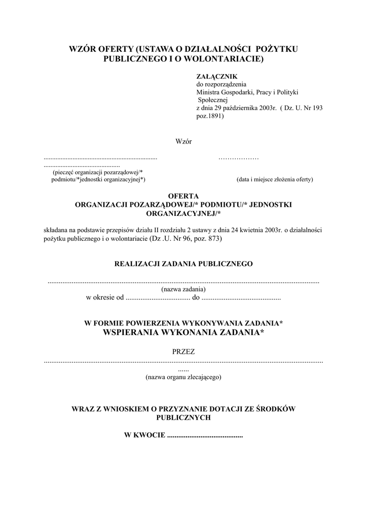 WZÓR OFERTY (USTAWA O DZIAŁALNOŚCI POŻYTKU PUBLICZNEGO I O WOLONTARIACIE) ZAŁĄCZNIK do rozporządzenia Ministra Gospodarki, Pracy i Polityki Społecznej z dnia 29 października 2003r. ( Dz. U. Nr 193 poz.1891) Wzór ................................................................... ............................................. ……………… (pieczęć organizacji pozarządowej/* podmiotu/*jednostki organizacyjnej*) (data i miejsce złożenia oferty) OFERTA ORGANIZACJI POZARZĄDOWEJ/* PODMIOTU/* JEDNOSTKI ORGANIZACYJNEJ/* składana na podstawie przepisów działu II rozdziału 2 ustawy z dnia 24 kwietnia 2003r. o działalności pożytku publicznego i o wolontariacie (Dz .U. Nr 96, poz. 873) REALIZACJI ZADANIA PUBLICZNEGO ................................................................................................................................................... (nazwa zadania) w okresie od ................................... do ........................................... W FORMIE POWIERZENIA WYKONYWANIA ZADANIA* WSPIERANIA WYKONANIA ZADANIA* PRZEZ ....................................................................................................................................................... ...... (nazwa organu zlecającego) WRAZ Z WNIOSKIEM O PRZYZNANIE DOTACJI ZE ŚRODKÓW PUBLICZNYCH W KWOCIE ......................................... I. Dane na temat organizacji pozarządowej/* podmiotu/* jednostki organizacyjnej /* 1) pełna nazwa............................................................................................................................................ 2) forma prawna ......................................................................................................................................... 3) numer w Krajowym Rejestrze Sądowym lub w innym rejestrze* ........................................................ 4) NIP .......................................................... REGON................................................................................ 5) data wpisu lub rejestracji........................................................................................................................ 6) inne dane ewidencyjne .......................................................................................................................... 7) dokładny adres: miejscowość................................ ul. ........................................................................... gmina ............................... powiat ................................... województwo ............................................... 8) tel. ................................................................. fax ................................................................................ e-mail: ............................................................... http:// ........................................................................... 9) nazwa banku i numer rachunku ........................................................................................................... ................................................................................................................................................................. ................................................................................................................................................................. 10) nazwiska i imiona oraz funkcje/stanowiska osób statutowo upoważnionych do reprezentowania organizacji pozarządowej/* podmiotu/* jednostki organizacyjnej /*w kontaktach zewnętrznych i posiadających zdolność do podejmowania zobowiązań finansowych w imieniu organizacji pozarządowej/* podmiotu/* jednostki organizacyjnej /*(zawierania umów) ..................................................................................................................................................... ....................................................................................................................................................... .................................................................................................................................................................... 11) nazwa, adres i telefon kontaktowy placówki bezpośrednio wykonującej zadanie, na które organizacja ubiega się o uzyskanie dotacji ....................................................................................................................................................... ....................................................................................................................................................... 12) osoba upoważniona do składania wyjaśnień i uzupełnień dotyczących oferty (imię i nazwisko oraz nr telefonu kontaktowego) ............................................................................................... 13) cele statutowe (przedmiot działalności statutowej): . 14) zakres prowadzonej działalności statutowej ): a) działalność nieodpłatna b) działalność odpłatna 15) jeżeli organizacja pozarządowa/* podmiot/* jednostka organizacyjna/* prowadzi działalność gospodarczą: a) numer wpisu do rejestru przedsiębiorców b) przedmiot działalności gospodarczej II. Opis zadania 1. Nazwa zadania 2. Miejsce wykonywania zadania 3. Szczegółowy zakres rzeczowy zadania 4. Cel zadania oraz rodzaj działań przy realizacji zadania 5. Deklaracja pobierania lub niepobierania wynagrodzenia od beneficjentów/adresatów 6. Opis kolejnych działań planowanych przy realizacji zadania. 7. Liczbowe określenia skali działań podejmowanych przy realizacji zadania (należy użyć miar adekwatnych dla danego zadania, np. liczba podopiecznych, liczba indywidualnych świadczeń udzielonych tygodniowo /miesięcznie) 8. Zakładane rezultaty realizacji zadania III. Kalkulacja przewidywanych kosztów realizacji zadania Całkowity koszt (w zł) w tym wnioskowana wielkość dotacji (w zł) w tym wie