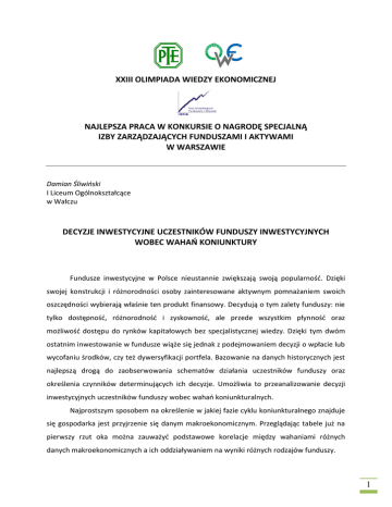 XXIII OLIMPIADA WIEDZY EKONOMICZNEJ NAJLEPSZA PRACA W KONKURSIE O NAGRODĘ SPECJALNĄ IZBY ZARZĄDZAJĄCYCH FUNDUSZAMI I AKTYWAMI W WARSZAWIE Damian Śliwioski I Liceum Ogólnokształcące w Wałczu DECYZJE INWESTYCYJNE UCZESTNIKÓW FUNDUSZY INWESTYCYJNYCH WOBEC WAHAŃ KONIUNKTURY Fundusze inwestycyjne w Polsce nieustannie zwiększają swoją popularnośd. Dzięki swojej konstrukcji i różnorodności osoby zainteresowane aktywnym pomnażaniem swoich oszczędności wybierają właśnie ten produkt finansowy. Decydują o tym zalety funduszy: nie tylko dostępnośd, różnorodnośd i zyskownośd, ale przede wszystkim płynnośd oraz możliwośd dostępu do rynków kapitałowych bez specjalistycznej wiedzy. Dzięki tym dwóm ostatnim inwestowanie w fundusze wiąże się jednak z podejmowaniem decyzji o wpłacie lub wycofaniu środków, czy też dywersyfikacji portfela. Bazowanie na danych historycznych jest najlepszą drogą do zaobserwowania schematów działania uczestników funduszy oraz określenia czynników determinujących ich decyzje. Umożliwia to przeanalizowanie decyzji inwestycyjnych uczestników funduszy wobec wahao koniunkturalnych. Najprostszym sposobem na określenie w jakiej fazie cyklu koniunkturalnego znajduje się gospodarka jest przyjrzenie się danym makroekonomicznym. Przeglądając tabele już na pierwszy rzut oka można zauważyd podstawowe korelacje między wahaniami różnych danych makroekonomicznych a ich oddziaływaniem na wyniki różnych rodzajów funduszy. 1 Giełda Notowania na GPW, jako barometr 60,00% gospodarki, są głównym czynnikiem wpły- 40,00% wającym na wyniki funduszy incesty- 20,00% cyjnych. Z tym, co dzieje się na parkiecie 0,00% najsilniej sprzężone są, jak wskazuje na to -20,00% juz sama nazwa, fundusze akcyjne. -40,00% Zależnośd miedzy roczną dynamiką WIG a rocznymi wynikami funduszy akcyjnych -60,00% Rok ilustruje wykres. 2002 2004 Dynamika WIG 2006 akcji polskich Stopy procentowe Stopy procentowe ustalane przez NBP mają decydujący wpływ na oprocentowanie lokat i obligacji. Razem z wzrostem stóp procentowych wzrasta także liczba firm próbujących finansowad się emisją skryptów dłużnych zamiast drogiego kredytu. Przy spadku oprocentowania analogicznie. Wpływa to dzieje na 18,00% 16,00% 14,00% 12,00% 10,00% 8,00% 6,00% 4,00% 2,00% 0,00% się 2001 2003 wyniki 2005 2007 Stopa referencyjna NBP dłużne złotowe funduszy gotówkowych i pieniężnych oraz gotówkowe i pieniężne dłużnych (wykres), które działają w sferze powyższych instrumentów finansowych. Dynamika PKB Im lepsza koniunktura w gospodarce, tym oczywiście wyższy wzrost PKB. Przekłada się to na zamożnośd społeczeostwa i ilośd posiadanych oszczędności, które może ono potencjalnie ulokowad w funduszach. Zwykle występuje dodatnia zależnośd między szybkim tempem rozwoju a silniejszym napływem środków do funduszy. Pieniądze wpłacone lub wypłacone rozkładają się równomiernie pomiędzy rodzaje funduszy, bez szczególnego faworyzowania jednego z nich. Dynamika PKB a saldo nabyć i odkupień 60000 50000 40000 30000 20000 10000 0 -10000 -20000 -30000 -40000 2001 2003 2005 2007 2009 Dynamika PKB Saldo nabyć i odkupień w mld PLN 2 Wpływ obecności alternatywnych form inwestowania Na powyższym wykresie można zauważyd pewną anomalię w postaci odwrotnej zależności miedzy dynamiką PKB a saldem wpływów środków do TFI, mimo że wcześniej podążały one proporcjonalnie, to przy wzroście dynamiki PKB saldo nabyd i odkupieo zaczęło maled. Miało to miejsce w latach 2002–2004 i należałoby się zastanowid nad przyczynami takiego zjawiska. Korekta na rynku akcji w tamtym czasie tylko częściowo spowodowała takie wyniki. Aby wyhamowad szybko rosnącą inflację oraz ostudzid nieco koniunkturę stopy procentowe były wysokie, spowodowało to wzrost konkurencyjności lokat bankowych, co stworzyło konkurencyjną ofertę dla inwestorów wobec inwestowania w TFI. Kolejną alternatywą były wchodzące na giełdę nowe spółki, w szczególności spółki prywatyzowane przez Skarb Paostwa, które zaabsorbowały znaczną częśd oszczędności Polaków. Zachowania uczestników funduszy inwestycyjnych charakteryzują się cyklicznością. Wynika to chodby z tego, że są sprzężone z cyklami koniunkturalnymi gospodarki. Zatem, co charakteryzuje rynek funduszy w zależności od poszczególnych faz cyklu? Przeanalizujmy każdą fazę klasycznego cyklu koniunkturalnego pod kątem wydarzeo związanych z funduszami inwestycyjnymi, czyli efektu makro wielu pojedynczych decyzji ich uczestników. Do umownego rozgraniczenia poszczególnych faz niech posłuży wykres wartości WIG z okresu od początku 2001 r. do kooca 2009 r., a do formułowania wniosków podstawą niech będą dane statystyczne. 1. Faza stagnacji Fazę stagnacji charakteryzuje bardzo niskie saldo nabyd i odkupieo jednostek uczestnictwa w funduszach. Pozostają one jednak na dodatnim poziomie. Inwestorzy nie są 3 skłonni inwestowad w bardziej ryzykowne produkty finansowe, które nie wykazują perspektyw szybkiego wzrostu. Istotnie, fundusze akcji i mieszane mają najsłabsze wyniki wśród ogółu funduszy inwestycyjnych, często nawet tracą na wartości. Fundusze o bardziej zachowawczej strategii, tj. dłużne, pieniężne i stabilnego wzrostu osiągają lepsze wyniki, i to ku nim skłaniają się inwestorzy. 2. Faza ożywienia Wraz z początkiem ożywienia wyniki funduszy akcyjnych i mieszanych zaczynają byd wyższe od pozostałych, mniej ryzykownych funduszy. Widząc perspektywy zysku coraz więcej osób jest skłonnych zainwestowad swoje pieniądze na rynku kapitałowym. Dzięki ożywieniu w gospodarce mają także większą ilośd gotówki, którą mogą zaoszczędzid. Następuje silny napływ środków do TFI. Systematycznie spada udział w rynku funduszy o mniejszym poziomie ryzyka na rzecz bardziej ryzykownych podmiotów, takich jak fundusze akcji. Dzięki ustabil