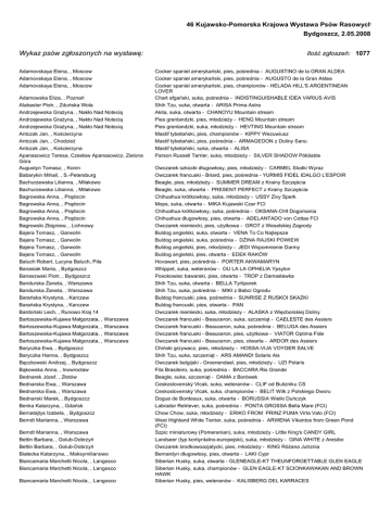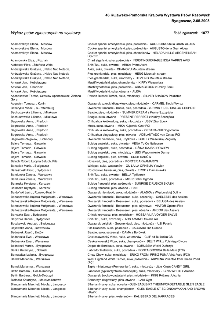 46 Kujawsko-Pomorska Krajowa Wystawa Psów Rasowych Bydgoszcz, 2.05.2008 Wykaz psów zgłoszonych na wystawę: Ilość zgłoszeń: 1077 Adamovskaya Elena, , Moscow Cocker spaniel amerykański, pies, pośrednia - AUGUSTINO de la GRAN ALDEA Adamovskaya Elena, , Moscow Adamovskaya Elena, , Moscow Adamowska Eliza, , Poznań Cocker spaniel amerykański, pies, pośrednia - AUGUSTO de la Gran Aldea Cocker spaniel amerykański, pies, championów - HELADA HILL'S ARGENTINEAN LOVER Chart afgański, suka, pośrednia - INDISTINGUISHABLE IDEA VARIUS AVIS Alabaster Piotr, , Zduńska Wola Andrzejewska Grażyna, , Nakło Nad Notecią Shih Tzu, suka, otwarta - ARISA Prima Astra Akita, suka, otwarta - CHANOYU Mountain stream Andrzejewska Grażyna, , Nakło Nad Notecią Pies grenlandzki, pies, młodzieży - HENG Mountain stream Andrzejewska Grażyna, , Nakło Nad Notecią Antczak Jan, , Kościerzyna Pies grenlandzki, suka, młodzieży - HEVTING Mountain stream Mastif tybetański, pies, championów - KIPPY Wezuwiusz Antczak Jan, , Chodzież Mastif tybetański, pies, pośrednia - ARMAGEDON z Doliny Sanu Antczak Jan, , Kościerzyna Apanasowicz Teresa, Czesław Apanasowicz, Zielona Góra Augustyn Tomasz, , Konin Mastif tybetański, suka, otwarta - ALISA Parson Russell Terrier, suka, młodzieży - SILVER SHADOW Półdiable Babarykin Mihail, , S.-Petersburg Bachurzewska Lilianna, , Miłakowo Owczarek francuski - Briard, pies, pośrednia - YURMIS FIDEL IDALGO L'ESPOIR Beagle, pies, młodzieży - SUMMER DREAM z Krainy Szczęścia Bachurzewska Lilianna, , Miłakowo Bagrowska Anna, , Prądocin Bagrowska Anna, , Prądocin Bagrowska Anna, , Prądocin Beagle, suka, otwarta - PRESENT PERFECT z Krainy Szczęścia Chihuahua krótkowłosy, suka, młodzieży - USSY Zivy Sperk Mops, suka, otwarta - MIKA Kujawski Czar FCI Chihuahua krótkowłosy, suka, pośrednia - OKSANA-CHI Dogomania Bagrowska Anna, , Prądocin Bagrowski Zbigniew, , Lichnowy Chihuahua długowłosy, pies, otwarta - ADELANTADO von Cottas FCI Owczarek niemiecki, pies, użytkowa - GROT z Weselskiej Zagrody Bajera Tomasz, , Garwolin Bajera Tomasz, , Garwolin Bajera Tomasz, , Garwolin Buldog angielski, suka, otwarta - VENA To Co Najlepsze Buldog angielski, suka, pośrednia - DŻINA RAJSKI POWIEW Buldog angielski, pies, młodzieży - JEDI Wspomnienie Darmy Bajera Tomasz, , Garwolin Baluch Robert, Lucyna Baluch, Piła Banasiak Maria, , Bydgoszcz Buldog angielski, pies, otwarta - EDEK RAKÓW Hovawart, pies, pośrednia - PORTER AKWAMARYN Whippet, suka, weteranów - OU LA LA OPHELIA Ypsylon Banaszwski Piotr, , Bydgoszcz Bandurska Żaneta, , Warszawa Bandurska Żaneta, , Warszawa Posokowiec bawarski, pies, otwarta - TROP z Damasławka Shih Tzu, suka, otwarta - BELLA Tyrliporek Shih Tzu, suka, pośrednia - MIKI z Babci Ogrodu Barańska Krystyna, , Karczew Barańska Krystyna, , Karczew Bardoński Lech, , Runowo Kraj 14 Bartoszewska-Kujawa Małgorzata, , Warszawa Bartoszewska-Kujawa Małgorzata, , Warszawa Bartoszewska-Kujawa Małgorzata, , Warszawa Bartoszewska-Kujawa Małgorzata, , Warszawa Baryczka Ewa, , Bydgoszcz Buldog francuski, pies, pośrednia - SUNRISE Z RUSKOI SKAZKI Buldog francuski, pies, otwarta - PAN Owczarek niemiecki, suka, młodzieży - ALASKA z Więcborskiej Doliny Owczarek francuski - Beauceron, suka, szczeniąt - CAELESTE des Assiers Owczarek francuski - Beauceron, suka, pośrednia - BELUGA des Assiers Owczarek francuski - Beauceron, pies, użytkowa - VIATOR Optima Fide Owczarek francuski - Beauceron, pies, otwarta - ARDOR des Assiers Chiński grzywacz, pies, młodzieży - HOSSA-VIJA VOYGER SALVE Baryczka Hanna, , Bydgoszcz Bączkowski Andrzej, , Bydgoszcz Bąkowska Anna, , Inowrocław Bednarek Józef, , Złotów Bednarska Ewa, , Warszawa Bednarska Ewa, , Warszawa Bednarski Marek, , Bydgoszcz Benka Katarzyna, , Gdańsk Bernatajtys Izabela, , Bydgoszcz Berndt Marianna, , Warszawa Shih Tzu, suka, szczeniąt - ARS AMANDI Solaris Ais Owczarek belgijski - Groenendael, pies, młodzieży - UZI Polaris Fila Brasileiro, suka, pośrednia - BACCARA Rio Grande Beagle, suka, szczeniąt - DAMA z Borówek Ceskoslovenský Vlcak, suka, weteranów - CLIF od Bulizniku CS Ceskoslovenský Vlcak, suka, championów - BELIT Wilk z Polskiego Dworu Dogue de Bordeaux, suka, otwarta - BORUSSIA Wielki Duńczyk Labrador Retriever, suka, pośrednia - PONTA GROSSA Bella Mare (FCI) Chow Chow, suka, młodzieży - ERIKO FROM PRINZ PUMA Virta Valo (FCI) West Highland White Terrier, suka, pośrednia - ARWENA Vikantos from Green Pond (FCI) Szpic miniaturowy (Pomeranian), suka, młodzieży - Little King's CANDY GIRL Landseer (typ kontyntalno-europejski), suka, młodzieży - GINA WHITE z Aresibo Owczarek środkowoazjatycki, pies, młodzieży - KING Różana Jutrznia Bernardyn długowłosy, pies, otwarta - LAKI Cypr Siberian Husky, suka, otwarta - GLENEAGLE-KT THEUNFORGETTABLE GLEN EAGLE Siberian Husky, suka, championów - GLEN EAGLE-KT SCIONKAWAKAN AND BROWN HAWK Siberian Husky, pies, weteranów - KALISBERG DEL KARRACES Berndt Marianna, , Warszawa Bettin Barbara, , Golub-Dobrzyń Bettin Barbara, , Golub-Dobrzyń Białecka Katarzyna, , Maksymilianowo Biancamaria Marchetti Nicola, , Langosco Biancamaria Marchetti Nicola, , Langosco Biancamaria Marchetti Nicola, , Langosco Owczarek szkocki długowłosy, pies, młodzieży - CARMEL Slodki Wyraz Biancamaria Marchetti Nicola, , Langosco Siberian Husky, pies, otwarta - GLEN EAGLE-KT THE EAGLE'S TATAUKA Bielas M., Marion Radstok, Wieniawa Bielecka Katarzyna, , Szczecin Lhasa Apso, pies, otwarta - Close To Perfection BARTJE Buldog angielski, pies, otwarta - Wielka Szansa X-BONO Bielskyte Silvija, , Lekeciai Chow Chow, suka, młodzieży - FOTUNA VIKTORIJA CUNAMI Bień Danuta, , Warszawa Bieńko Monika, , Gdynia Shih Tzu, suka, młodzieży - ARIKA Tyrliporek Yorkshire Terrier, suka, szczeniąt - HANA Qentika Bigaj Antoni, , Dobrcz Flat Coated Retriever, suka, młodzieży - Polka JA ANTOSIA Bijałd-Mikołajewicz Katarzyna, , Dąbrowa Bijałd-Mikołajewic