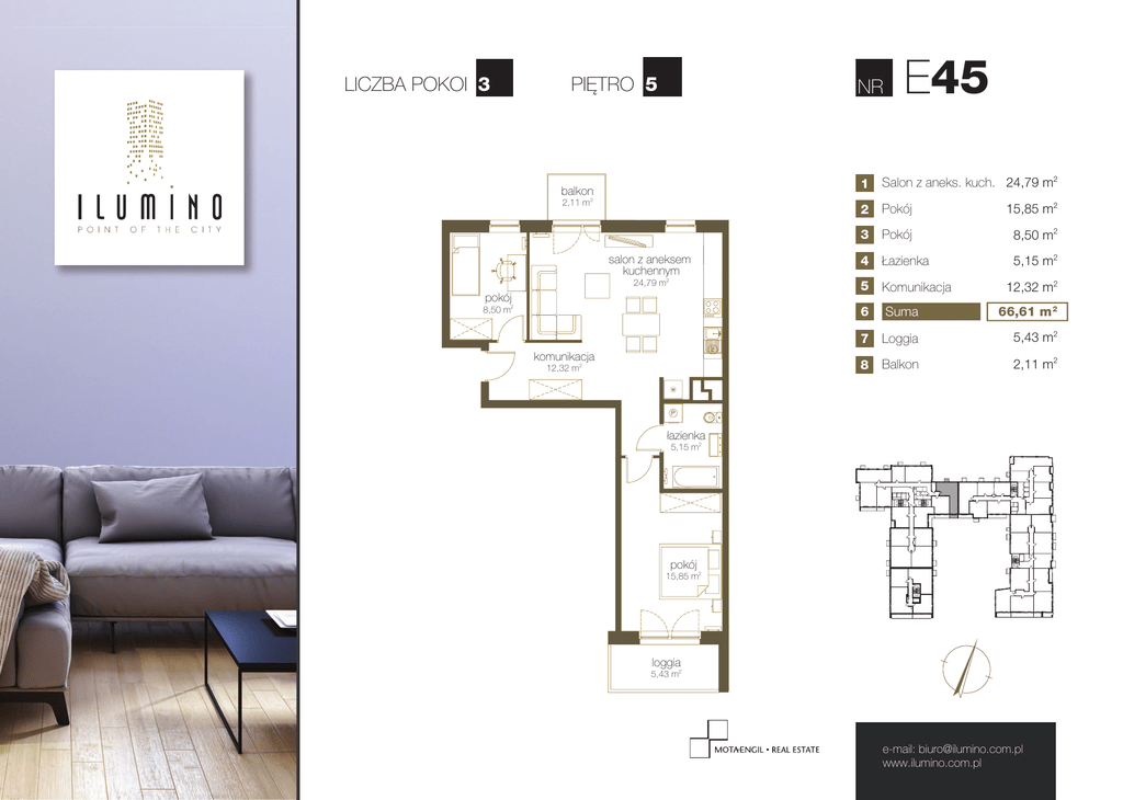 LICZBA POKOI 3 PIĘTRO 5 NR balkon 2,11 m 2 salon z aneksem kuchennym 24,79 m2 pokój 8,50 m2 E45 1 Salon z aneks. kuch. 24,79 m2 2 Pokój 15,85 m2 3 Pokój 8,50 m2 4 Łazienka 5,15 m2 5 Komunikacja 6 Suma 66,61 m 2 7 Loggia 5,43 m2 8 Balkon 2,11 m2 12,32 m2 ZM komunikacja 12,32 m2 P łazienka 5,15 m2 pokój 15,85 m2 loggia 5,43 m2 e-mail: [email protected] www.ilumino.com.pl