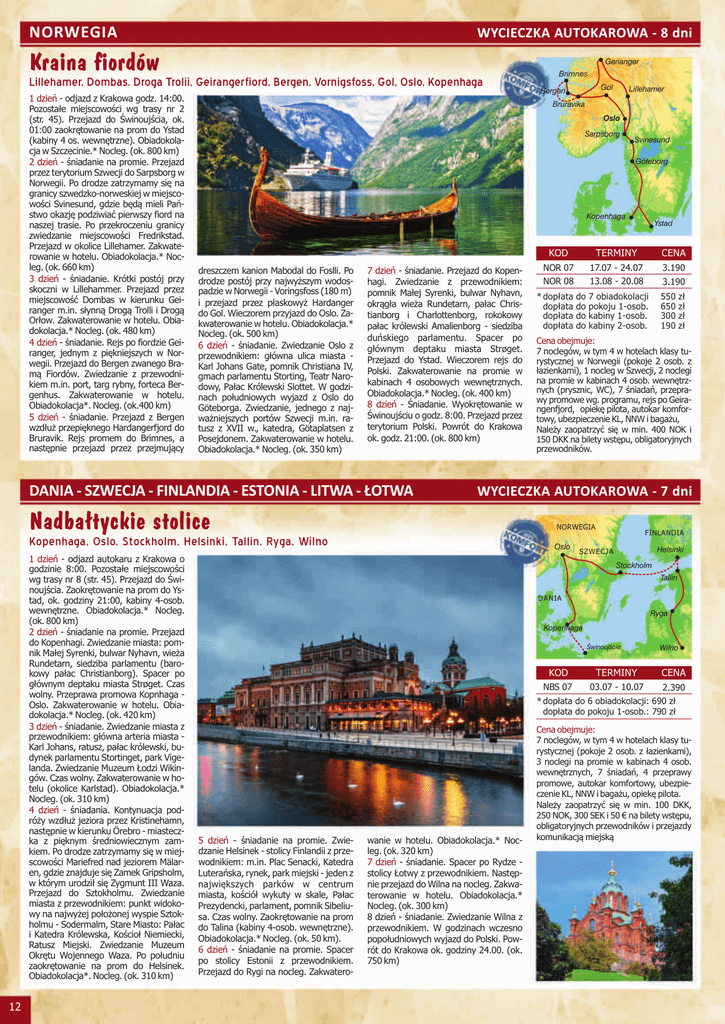 NORWEGIA WYCIECZKA AUTOKAROWA - 8 dni K r a i n a f i o r d ó w G e r i a n g e r Lillehamer, Dombas, Droga Trolii, Geirangerfiord, Bergen, Vornigsfoss, Gol, Oslo, Kopenhaga 1 dzieñ - odjazd z Krakowa godz. 14:00. Pozosta³e miejscowoœci wg trasy nr 2 (str. 45). Przejazd do Œwinoujœcia, ok. 01:00 zaokrêtowanie na prom do Ystad (kabiny 4 os. wewnêtrzne). Obiadokolacja w Szczecinie.* Nocleg. (ok. 800 km) 2 dzieñ - œniadanie na promie. Przejazd przez terytorium Szwecji do Sarpsborg w Norwegii. Po drodze zatrzymamy siê na granicy szwedzko-norweskiej w miejscowoœci Svinesund, gdzie bêd¹ mieli Pañstwo okazjê podziwiaæ pierwszy fiord na naszej trasie. Po przekroczeniu granicy zwiedzanie miejscowoœci Fredrikstad. Przejazd w okolice Lillehamer. Zakwaterowanie w hotelu. Obiadokolacja.* Nocleg. (ok. 660 km) 3 dzieñ - œniadanie. Krótki postój przy skoczni w Lillehammer. Przejazd przez miejscowoœæ Dombas w kierunku Geiranger m.in. s³ynn¹ Drog¹ Trolli i Drog¹ Or³ow. Zakwaterowanie w hotelu. Obiadokolacja.* Nocleg. (ok. 480 km) 4 dzieñ - œniadanie. Rejs po fiordzie Geiranger, jednym z piêkniejszych w Norwegii. Przejazd do Bergen zwanego Bram¹ Fiordów. Zwiedzanie z przewodnikiem m.in. port, targ rybny, forteca Bergenhus. Zakwaterowanie w hotelu. Obiadokolacja*. Nocleg. (ok.400 km) 5 dzieñ - œniadanie. Przejazd z Bergen wzd³u¿ przepiêknego Hardangerfjord do Bruravik. Rejs promem do Brimnes, a nastêpnie przejazd przez przejmuj¹cy dreszczem O s l o S a r p s b o r g S v i n e s u n d G ö t e b o r g K o p e n h a g a dreszczem kanion Mabodal do Foslli. Po drodze postój przy najwy¿szym wodospadzie w Norwegii - Voringsfoss (180 m) i przejazd przez p³askowy¿ Hardanger do Gol. Wieczorem przyjazd do Oslo. Zakwaterowanie w hotelu. Obiadokolacja.* Nocleg. (ok. 500 km) 6 dzieñ - œniadanie. Zwiedzanie Oslo z przewodnikiem: g³ówna ulica miasta Karl Johans Gate, pomnik Christiana IV, gmach parlamentu Storting, Teatr Narodowy, Pa³ac Królewski Slottet. W godzinach po³udniowych wyjazd z Oslo do Göteborga. Zwiedzanie, jednego z najwa¿niejszych portów Szwecji m.in. ratusz z XVII w., katedra, Götaplatsen z Posejdonem. Zakwaterowanie w hotelu. Obiadokolacja.* Nocleg. (ok. 350 km) 7 dzieñ - œniadanie. Przejazd do Kopenhagi. Zwiedzanie z przewodnikiem: pomnik Ma³ej Syrenki, bulwar Nyhavn, okr¹g³a wie¿a Rundetarn, pa³ac Christianborg i Charlottenborg, rokokowy pa³ac królewski Amalienborg - siedziba duñskiego parlamentu. Spacer po g³ównym deptaku miasta Strøget. Przejazd do Ystad. Wieczorem rejs do Polski. Zakwaterowanie na promie w kabinach 4 osobowych wewnêtrznych. Obiadokolacja.* Nocleg. (ok. 400 km) 8 dzieñ - Œniadanie. Wyokrêtowanie w Œwinoujœciu o godz. 8:00. Przejazd przez terytorium Polski. Powrót do Krakowa ok. godz. 21:00. (ok. 800 km) Y s t a d KOD TERMINY CENA NOR 07 NOR 08 17.07 - 24.07 13.08 - 20.08 3.190 3.190 7 obiadokolacji pokoju 1-osob. kabiny 1-osob. kabiny 2-osob. 550 650 300 190 * dop³ata dop³ata dop³ata dop³ata do do do do z³ z³ z³ z³ Cena obejmuje: 7 noclegów, w tym 4 w hotelach klasy turystycznej w Norwegii (pokoje 2 osob. z ³azienkami), 1 nocleg w Szwecji, 2 noclegi na promie w kabinach 4 osob. wewnêtrznych (prysznic, WC), 7 œniadañ, przeprawy promowe wg. programu, rejs po Geirangenfjord, opiekê pilota, autokar komfortowy, ubezpieczenie KL, NNW i baga¿u, Nale¿y zaopatrzyæ siê w min. 400 NOK i 150 DKK na bilety wstêpu, obligatoryjnych przewodników. WYCIECZKA AUTOKAROWA - 7 dni N a d b a łt y c k i e s t o l i c e NORWEGIA Kopenhaga, Oslo, Stockholm, Helsinki, Tallin, Ryga, Wilno 12 G o l L i l l e h a m e r B e r g e n B r u r a v i k a DANIA - SZWECJA - FINLANDIA - ESTONIA - LITWA - £OTWA 1 dzieñ - odjazd autokaru z Krakowa o godzinie 8:00. Pozosta³e miejscowoœci wg trasy nr 8 (str. 45). Przejazd do Œwinoujœcia. Zaokrêtowanie na prom do Ystad, ok. godziny 21:00, kabiny 4-osob. wewnêtrzne. Obiadokolacja.* Nocleg. (ok. 800 km) 2 dzieñ - œniadanie na promie. Przejazd do Kopenhagi. Zwiedzanie miasta: pomnik Ma³ej Syrenki, bulwar Nyhavn, wie¿a Rundetarn, siedziba parlamentu (barokowy pa³ac Christianborg). Spacer po gùównym deptaku miasta Str¸get. Czas wolny. Przeprawa promowa Kopnhaga Oslo. Zakwaterowanie w hotelu. Obiadokolacja.* Nocleg. (ok. 420 km) 3 dzieñ - œniadanie. Zwiedzanie miasta z przewodnikiem: g³ówna arteria miasta Karl Johans, ratusz, pa³ac królewski, budynek parlamentu Stortinget, park Vigelanda. Zwiedzanie Muzeum £odzi Wikingów. Czas wolny. Zakwaterowanie w hotelu (okolice Karlstad). Obiadokolacja.* Nocleg. (ok. 310 km) 4 dzieñ - œniadania. Kontynuacja podró¿y wzd³u¿ jeziora przez Kristinehamn, nastêpnie w kierunku Örebro - miasteczka z piêknym œredniowiecznym zamkiem. Po drodze zatrzymamy siê w miejscowoœci Mariefred nad jeziorem Mälaren, gdzie znajduje siê Zamek Gripsholm, w którym urodzi³ siê Zygmunt III Waza. Przejazd do Sztokholmu. Zwiedzanie miasta z przewodnikiem: punkt widokowy na najwy¿ej po³o¿onej wyspie Sztokholmu - Sodermalm, Stare Miasto: Pa³ac i Katedra Królewska, Koœcio³ Niemiecki, Ratusz Miejski. Zwiedzanie Muzeum Okrêtu Wojennego Waza. Po po³udniu zaokrêtowanie na prom do Helsinek. Obiadokolacja*. Nocleg. (ok. 310 km) B r i m n e s FINLANDIA O s l o SZWECJA H e l s i n k i S t o c k h o l m T a l l i n DANIA R y g a K o p e n h a g a Ś w i n o u j ś c i e W i l n o KOD TERMINY CENA NBS 07 03.07 - 10.07 2.390 * dop³ata do 6 obiadokolacji: 690 z³ dop³ata do pokoju 1-osob.: 790 z³ 5 dzieñ - œniadanie na promie. Zwiedzanie Helsinek - stolicy Finlandii z przewodnikiem: m.in. Plac Senacki, Katedra Luterañska, rynek, park miejski - jeden z najwiêkszych parków w centrum miasta, koœció³ wykuty w skale, Pa³ac Prezydencki, parlament, pomnik Sibeliusa. Czas wolny. Zaokrêtowanie na prom do Talina (kabiny 4-osob. wewnêtrzne). Obiadokolacja.* Nocleg. (ok. 50 km). 6 dzieñ - œniadanie na promie. Spacer po stolicy Estonii z prze