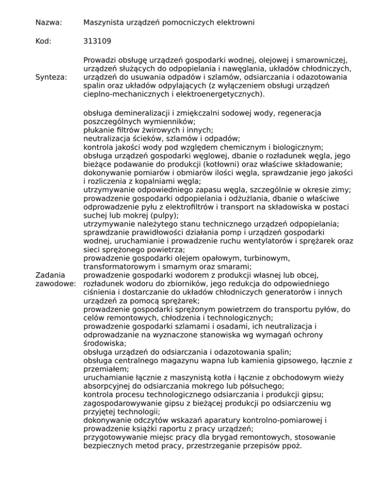 Nazwa: Maszynista urządzeń pomocniczych elektrowni Kod: 313109 Synteza: Prowadzi obsługę urządzeń gospodarki wodnej, olejowej i smarowniczej, urządzeń służących do odpopielania i nawęglania, układów chłodniczych, urządzeń do usuwania odpadów i szlamów, odsiarczania i odazotowania spalin oraz układów odpylających (z wyłączeniem obsługi urządzeń cieplno-mechanicznych i elektroenergetycznych). obsługa demineralizacji i zmiękczalni sodowej wody, regeneracja poszczególnych wymienników; płukanie filtrów żwirowych i innych; neutralizacja ścieków, szlamów i odpadów; kontrola jakości wody pod względem chemicznym i biologicznym; obsługa urządzeń gospodarki węglowej, dbanie o rozładunek węgla, jego bieżące podawanie do produkcji (kotłowni) oraz właściwe składowanie; dokonywanie pomiarów i obmiarów ilości węgla, sprawdzanie jego jakości i rozliczenia z kopalniami węgla; utrzymywanie odpowiedniego zapasu węgla, szczególnie w okresie zimy; prowadzenie gospodarki odpopielania i odżużlania, dbanie o właściwe odprowadzenie pyłu z elektrofiltrów i transport na składowiska w postaci suchej lub mokrej (pulpy); utrzymywanie należytego stanu technicznego urządzeń odpopielania; sprawdzanie prawidłowości działania pomp i urządzeń gospodarki wodnej, uruchamianie i prowadzenie ruchu wentylatorów i sprężarek oraz sieci sprężonego powietrza; prowadzenie gospodarki olejem opałowym, turbinowym, transformatorowym i smarnym oraz smarami; Zadania prowadzenie gospodarki wodorem z produkcji własnej lub obcej, zawodowe: rozładunek wodoru do zbiorników, jego redukcja do odpowiedniego ciśnienia i dostarczanie do układów chłodniczych generatorów i innych urządzeń za pomocą sprężarek; prowadzenie gospodarki sprężonym powietrzem do transportu pyłów, do celów remontowych, chłodzenia i technologicznych; prowadzenie gospodarki szlamami i osadami, ich neutralizacja i odprowadzanie na wyznaczone stanowiska wg wymagań ochrony środowiska; obsługa urządzeń do odsiarczania i odazotowania spalin; obsługa centralnego magazynu wapna lub kamienia gipsowego, łącznie z przemiałem; uruchamianie łącznie z maszynistą kotła i łącznie z obchodowym wieży absorpcyjnej do odsiarczania mokrego lub półsuchego; kontrola procesu technologicznego odsiarczania i produkcji gipsu; zagospodarowywanie gipsu z bieżącej produkcji po odsiarczeniu wg przyjętej technologii; dokonywanie odczytów wskazań aparatury kontrolno-pomiarowej i prowadzenie książki raportu z pracy urządzeń; przygotowywanie miejsc pracy dla brygad remontowych, stosowanie bezpiecznych metod pracy, przestrzeganie przepisów ppoż.
